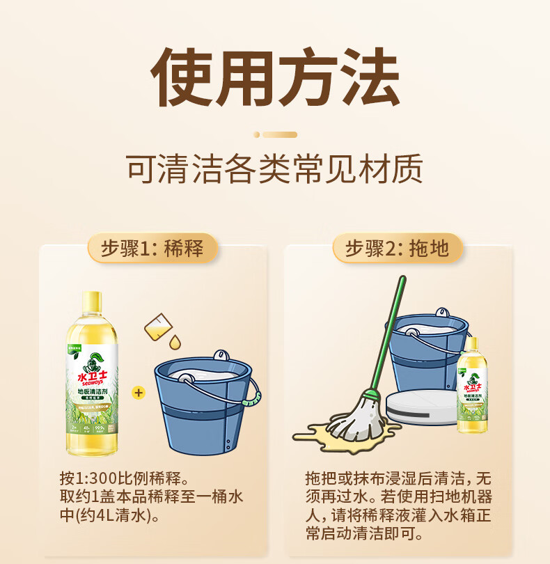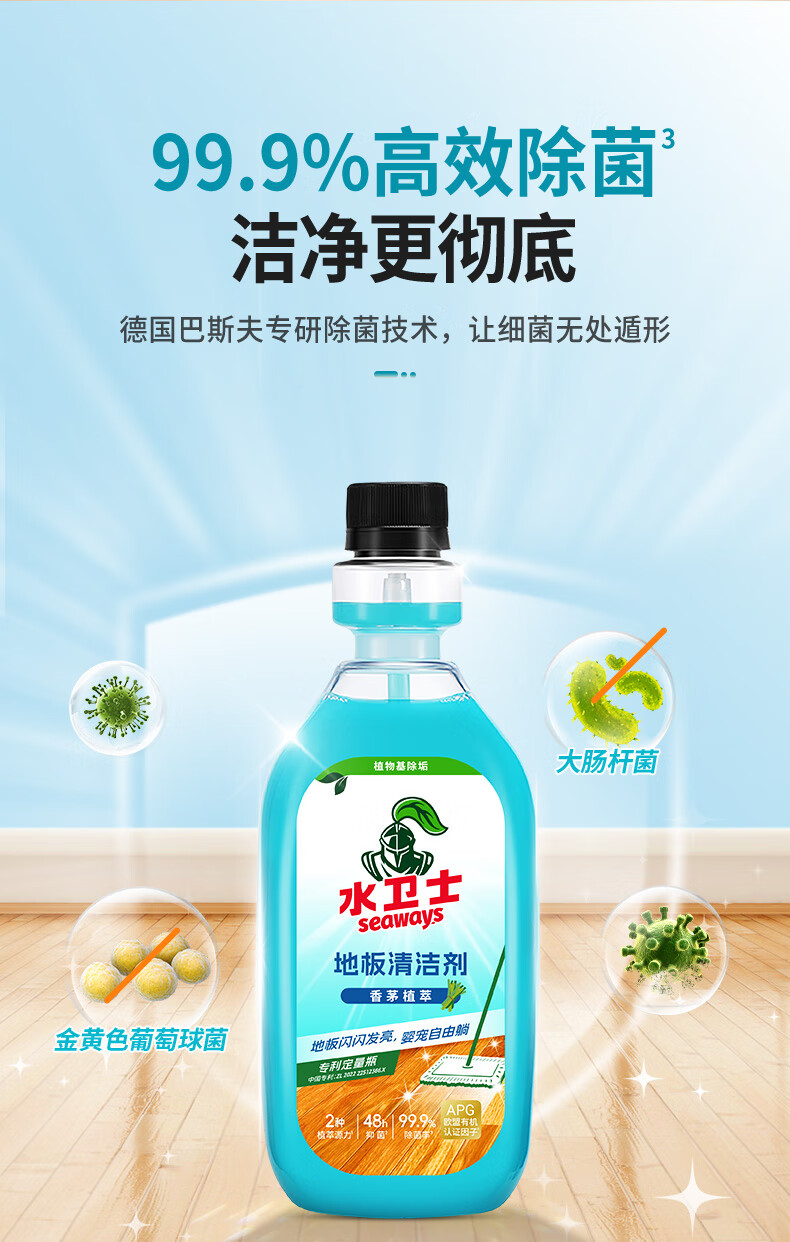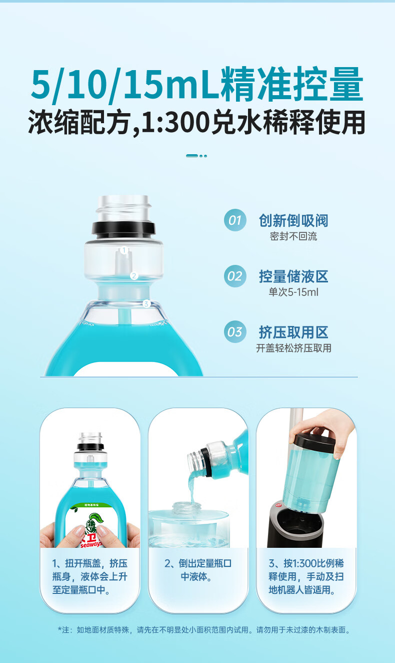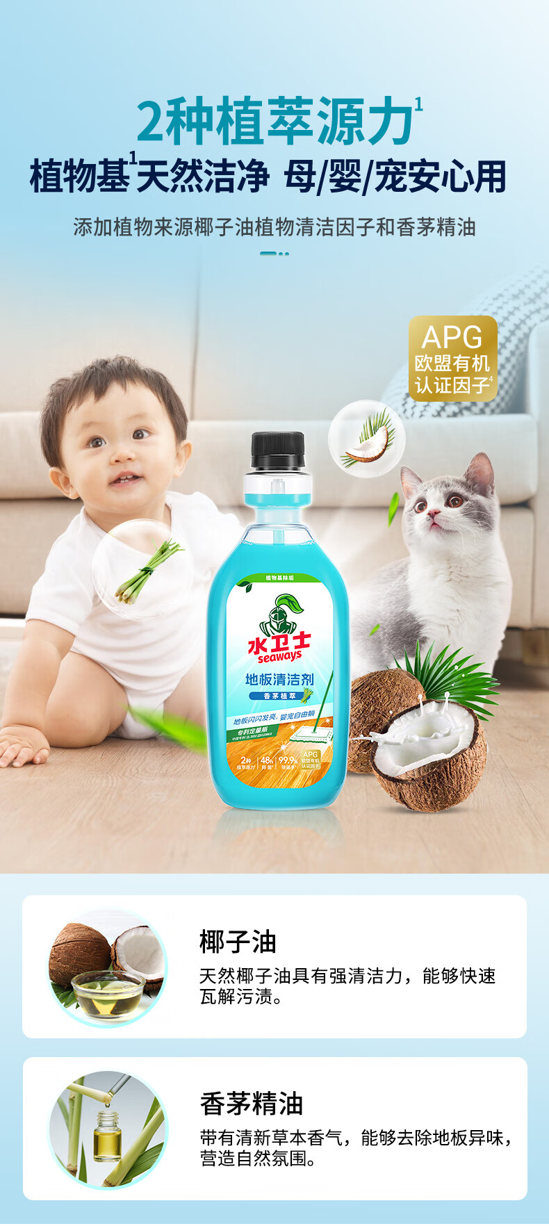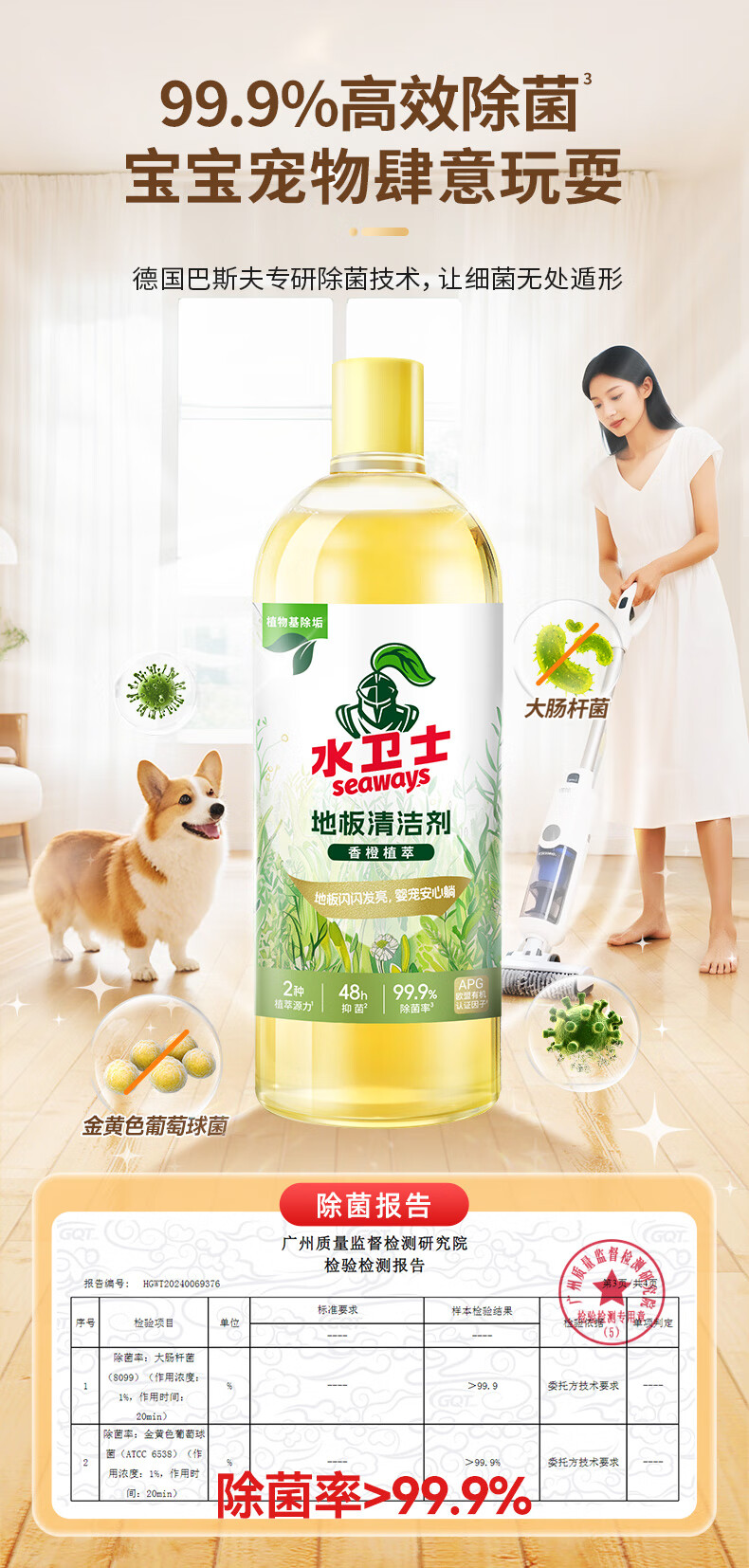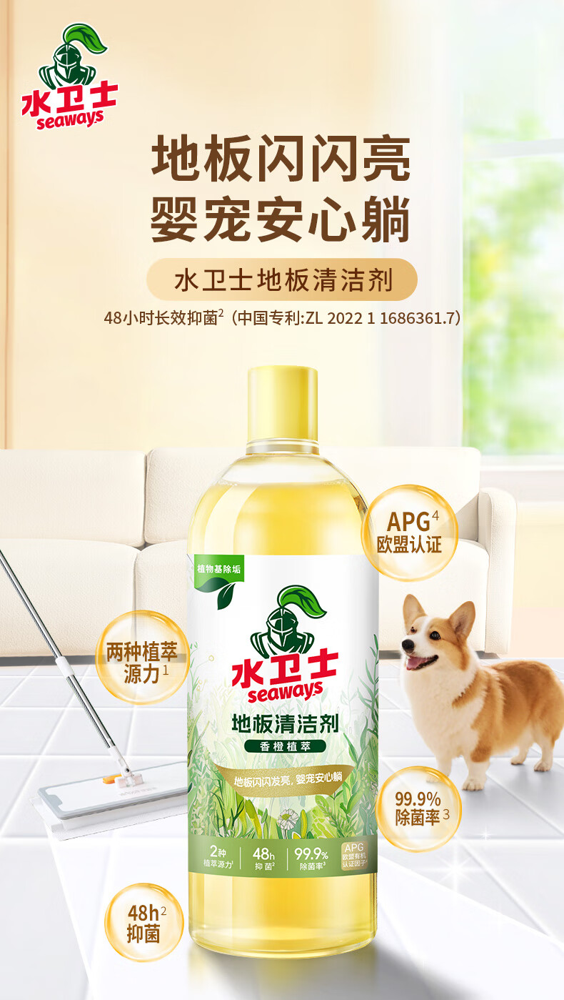 水卫士地板清洁剂婴宠家庭适用 扫地机器人专用 瓷砖拖地去污除菌去污垢 地板清洁剂1kg*2瓶【婴宠适用】