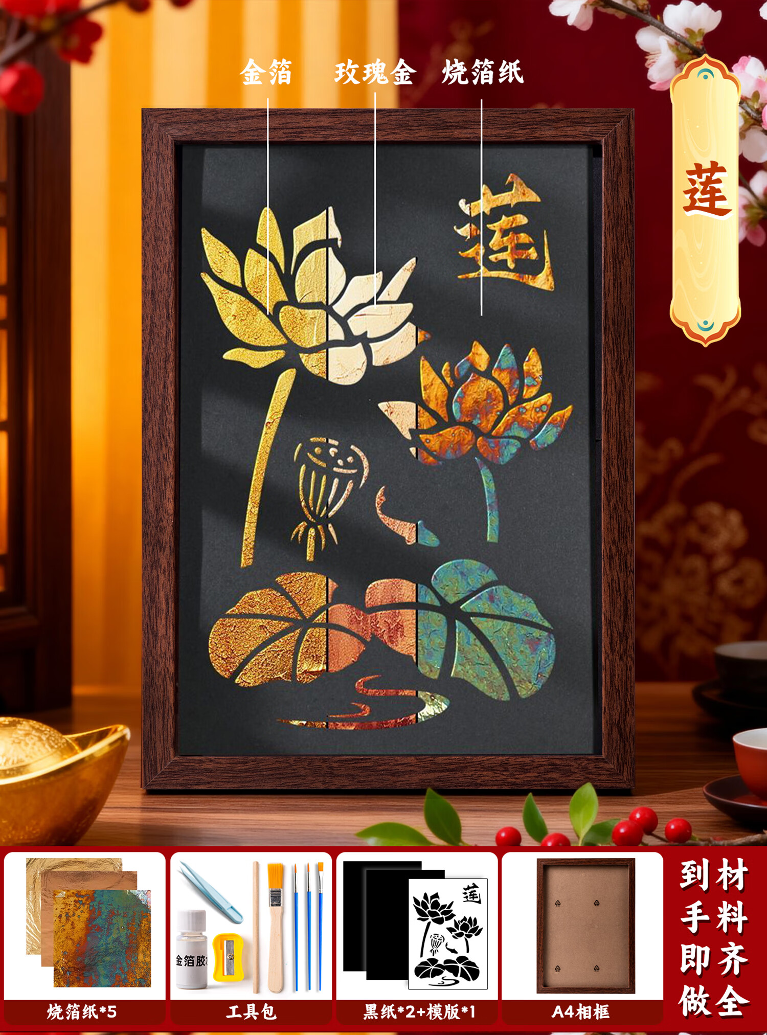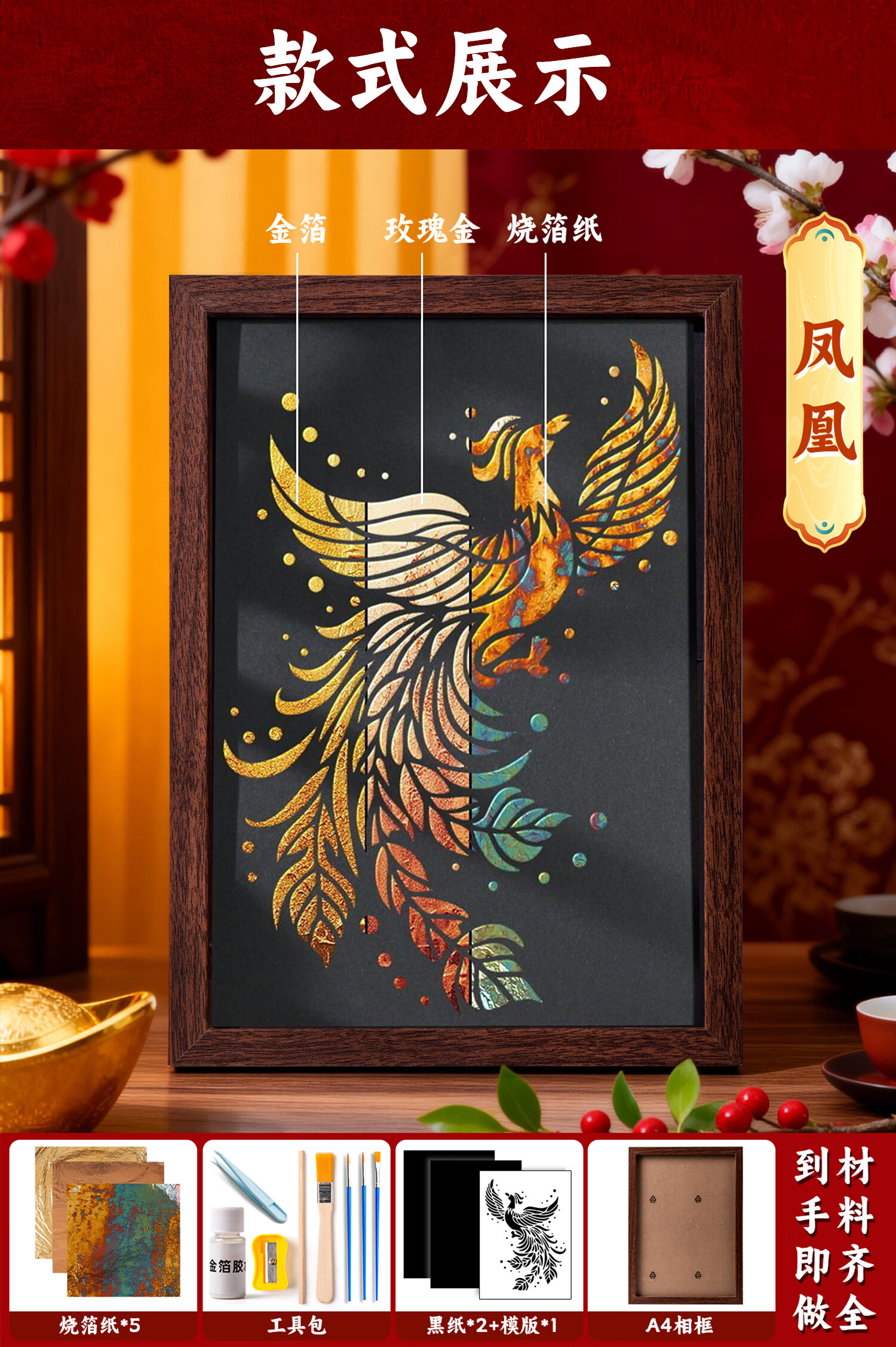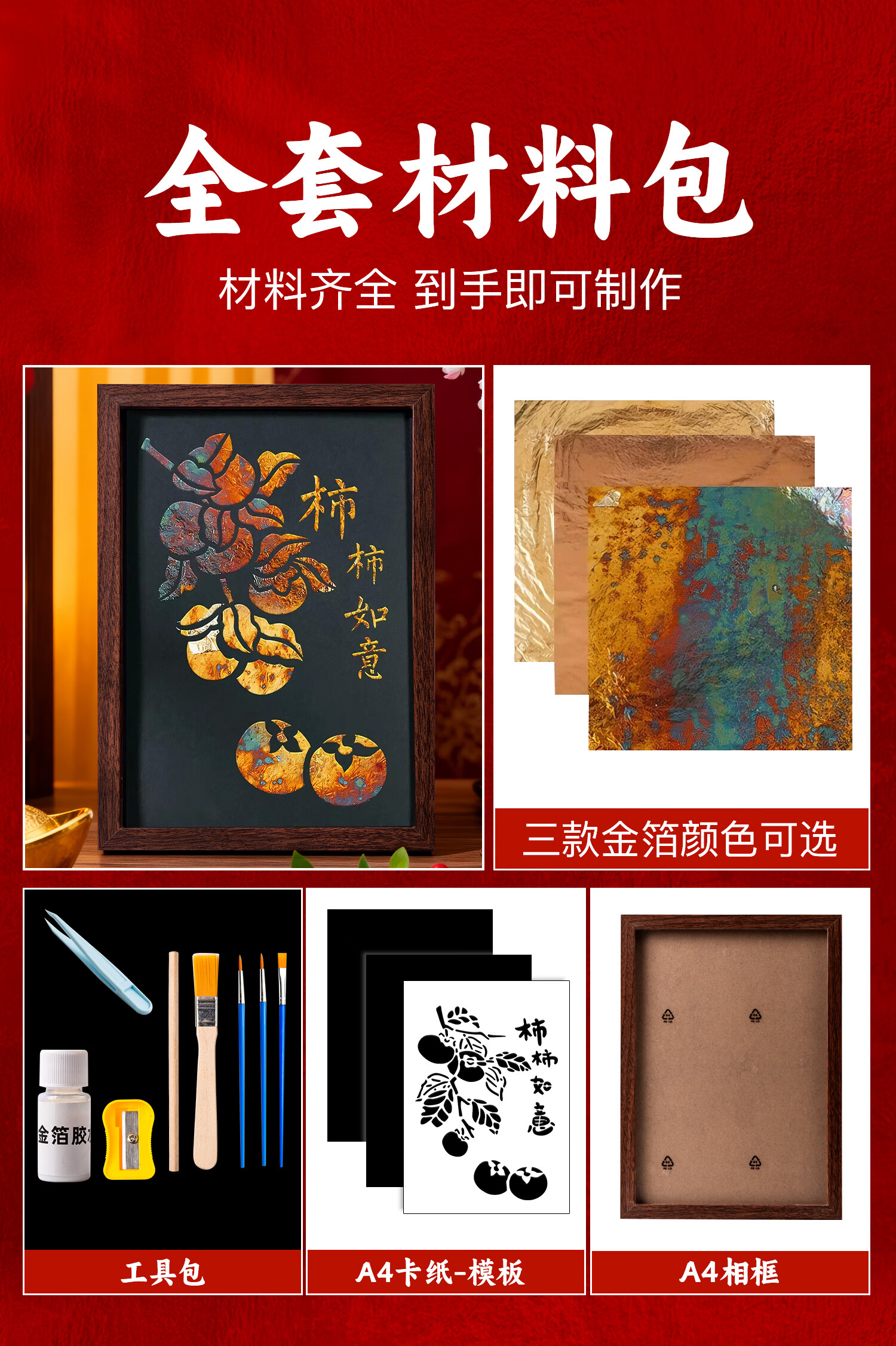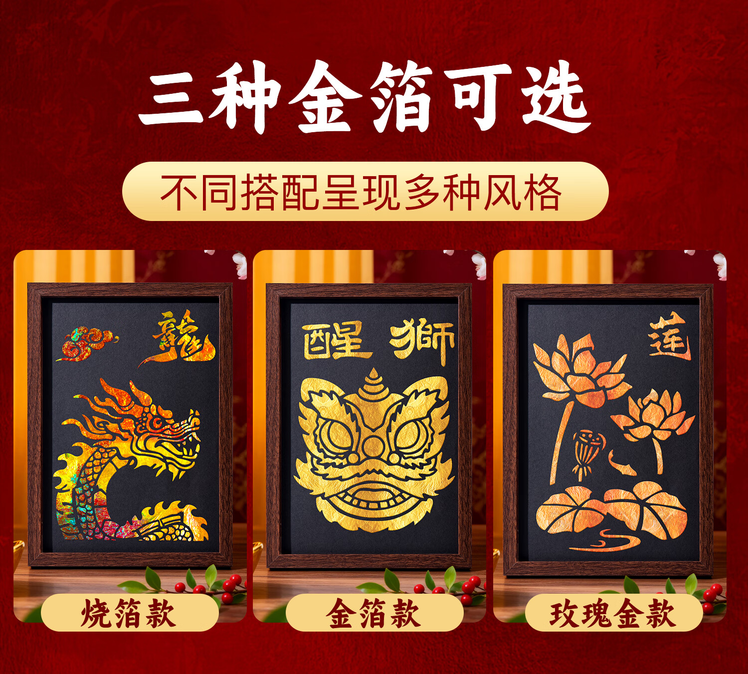 转悠非遗烧箔画材料包儿童创意礼品马年非遗烧箔画diy材料包金箔画装饰拓印铜箔儿童手工背景相框画 百福 【玫瑰金】黑底