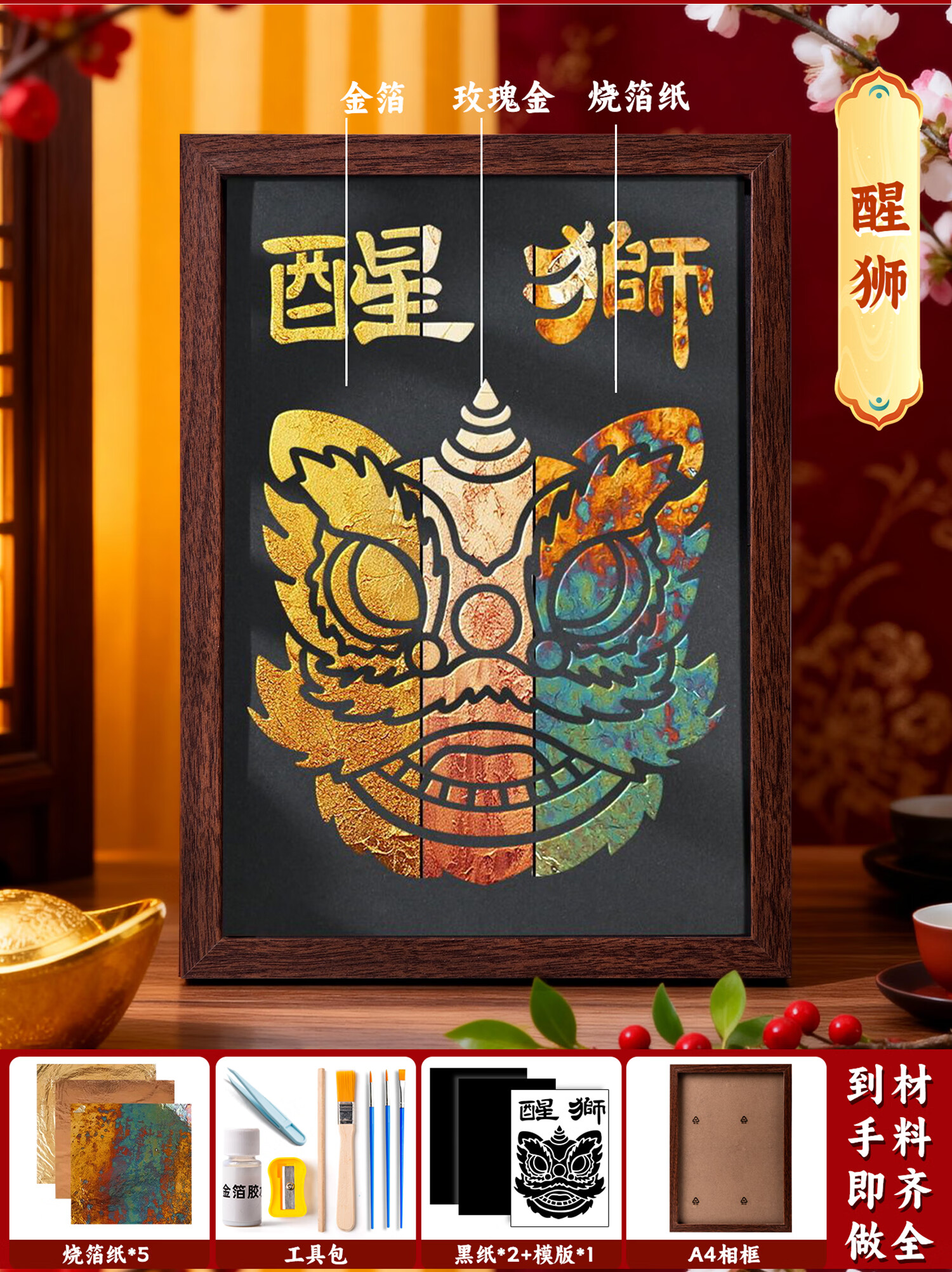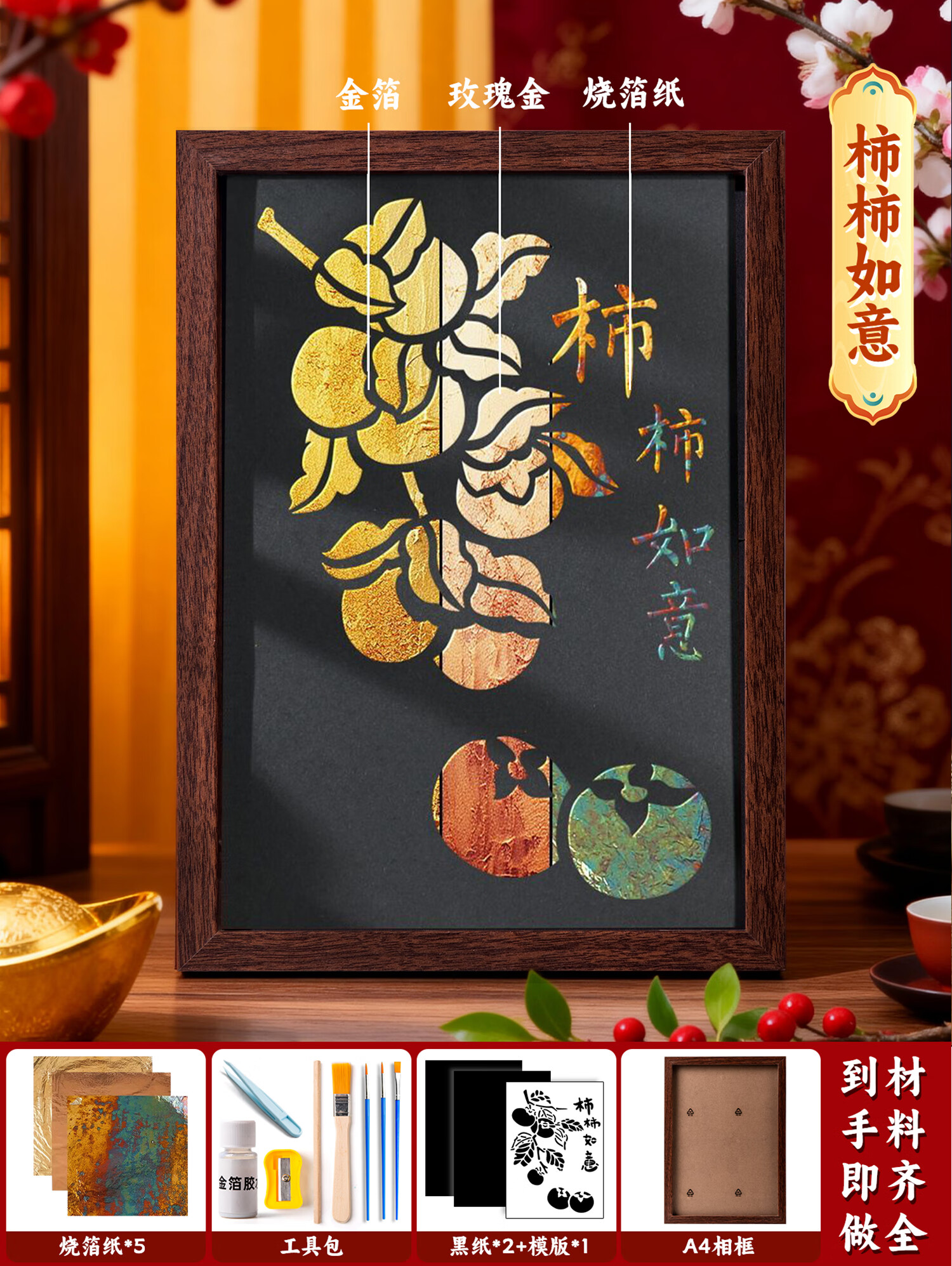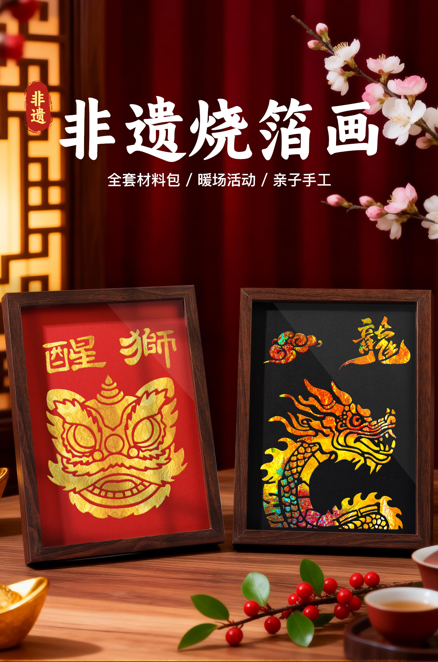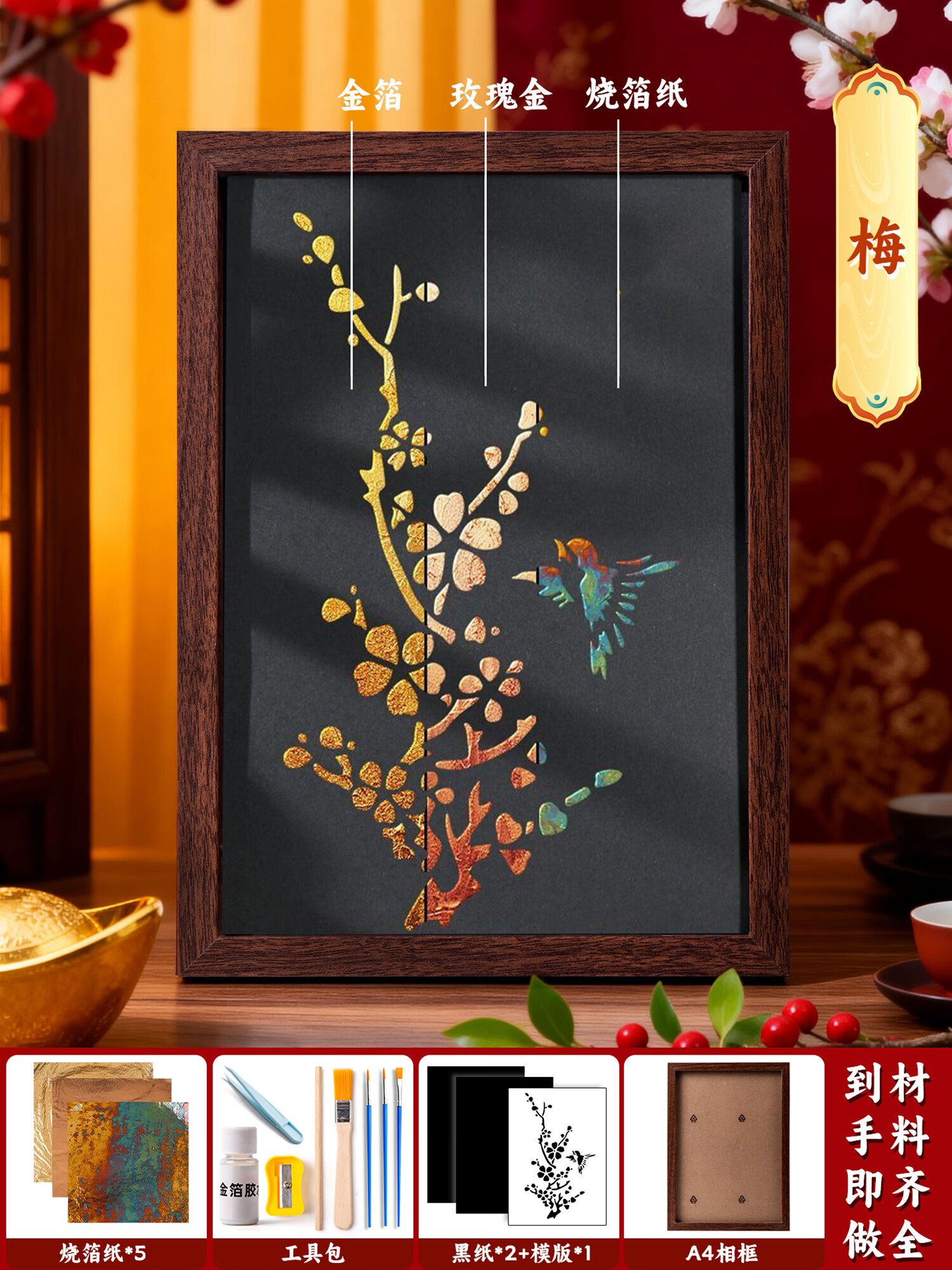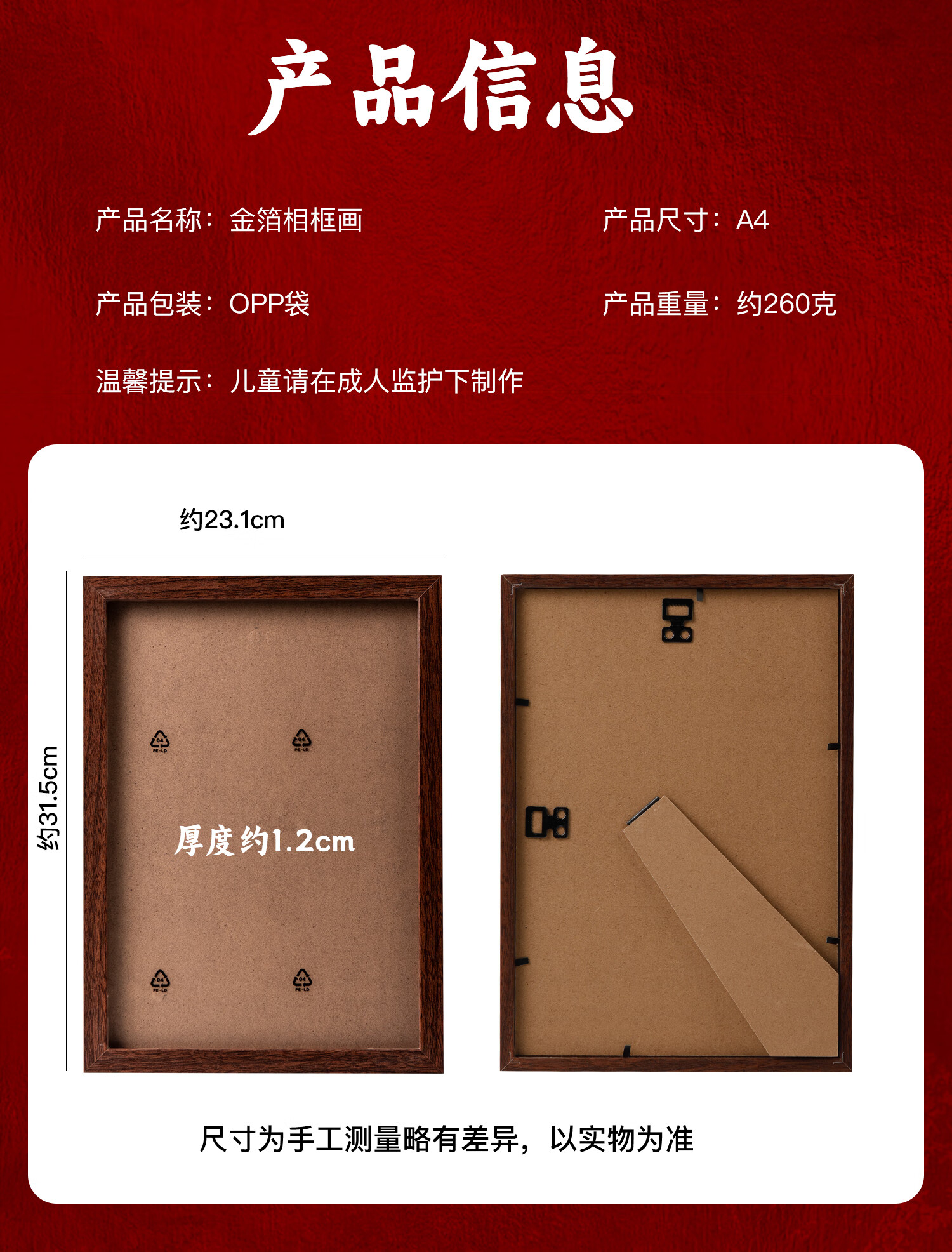 转悠非遗烧箔画材料包儿童创意礼品马年非遗烧箔画diy材料包金箔画装饰拓印铜箔儿童手工背景相框画 百福 【玫瑰金】黑底