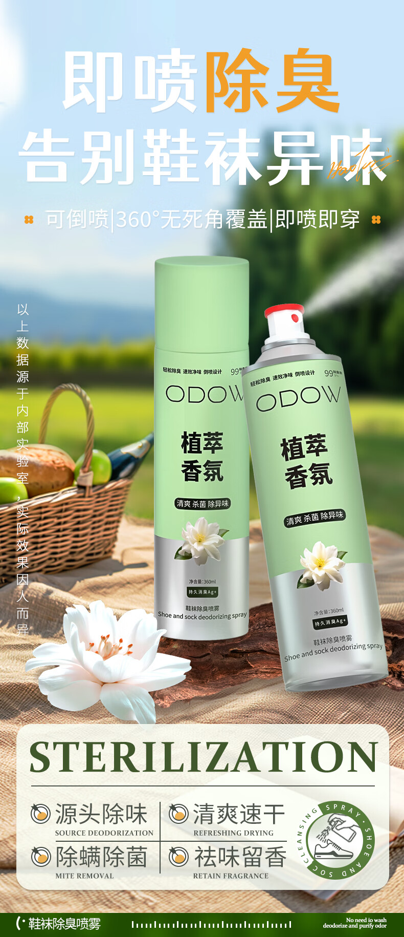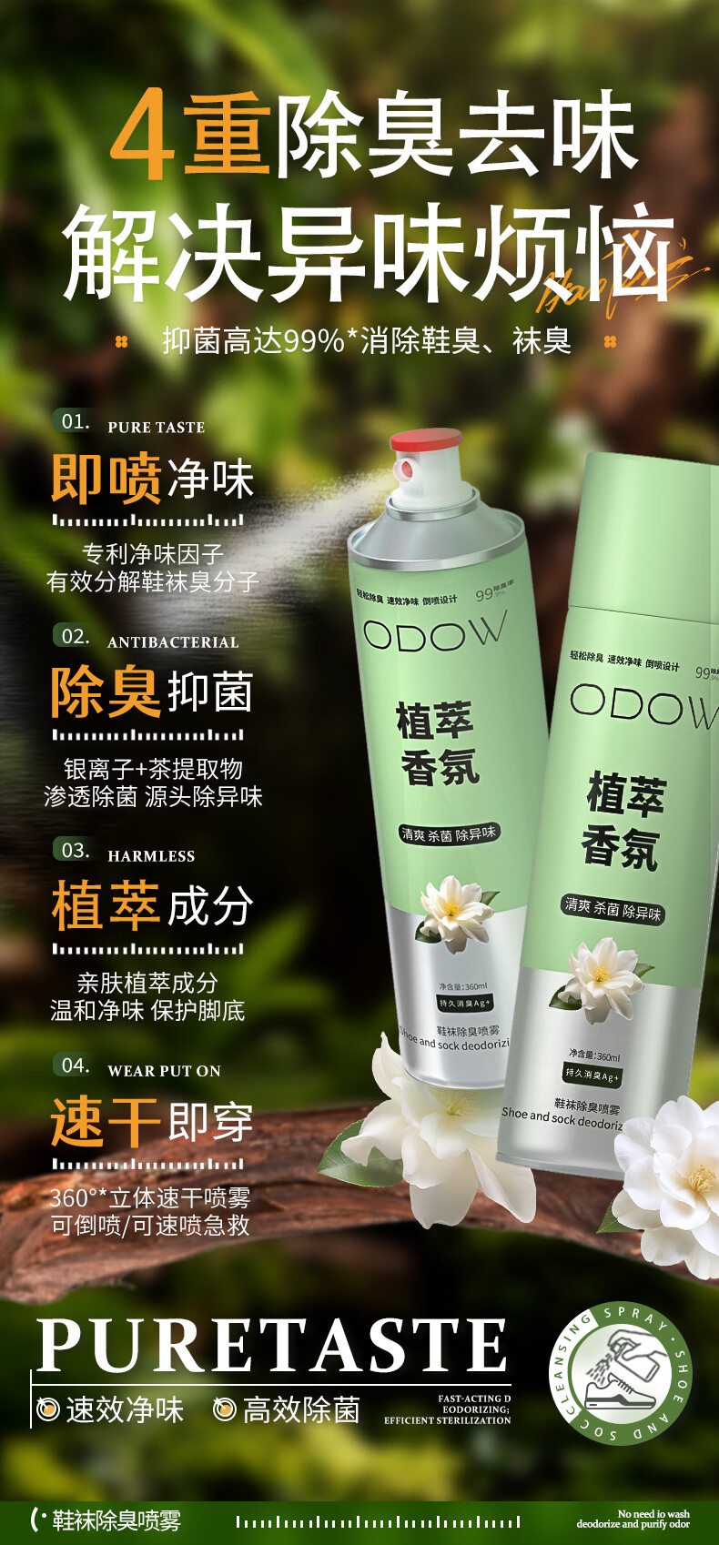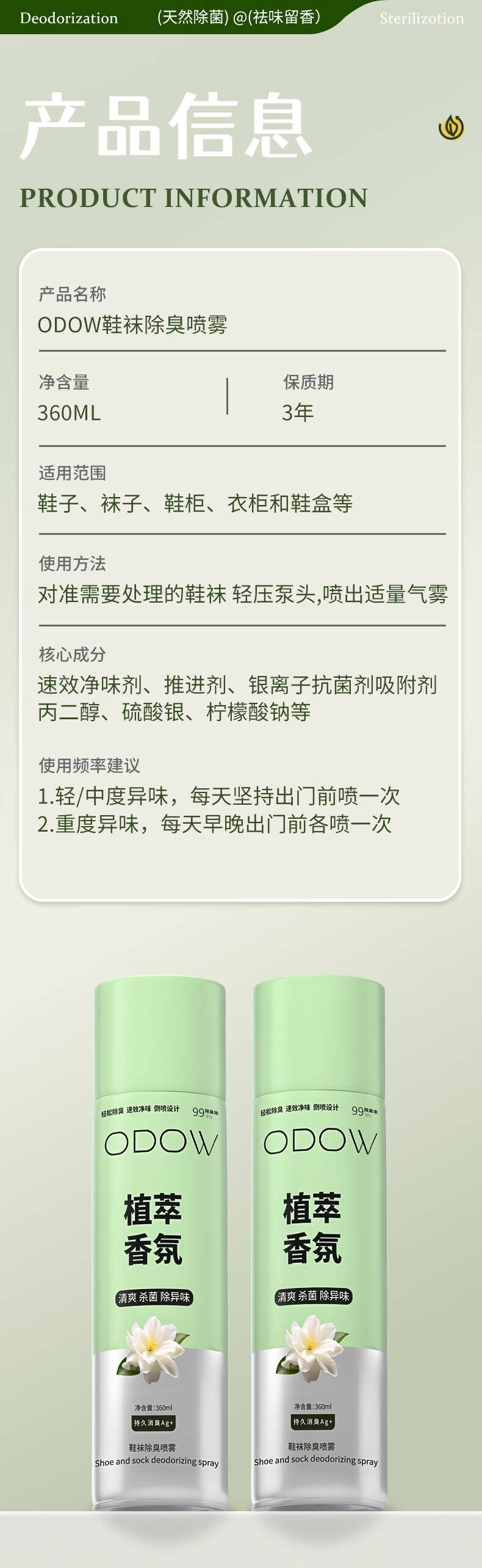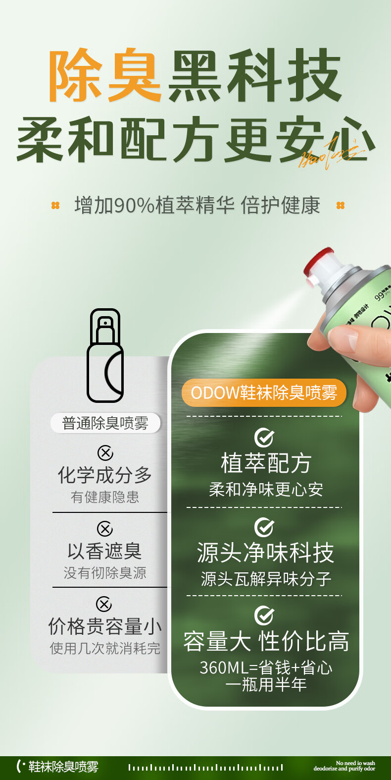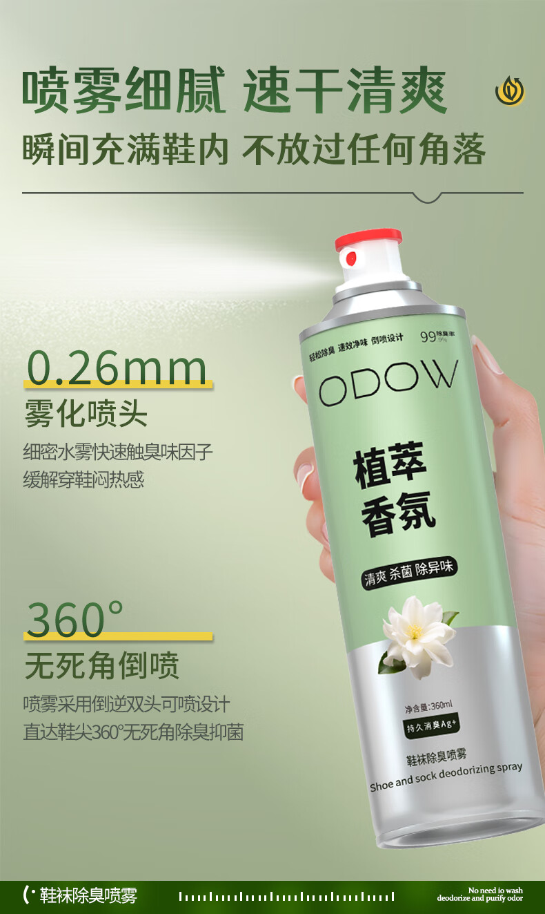 ODOW鞋袜除臭喷雾鞋子除臭剂银离子去脚臭抑菌去除味留香空气清新剂 【3瓶装】栀子花香鞋子除臭喷雾 360ml