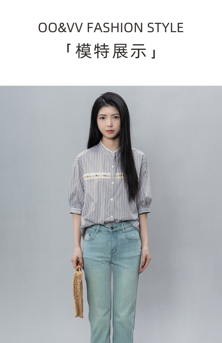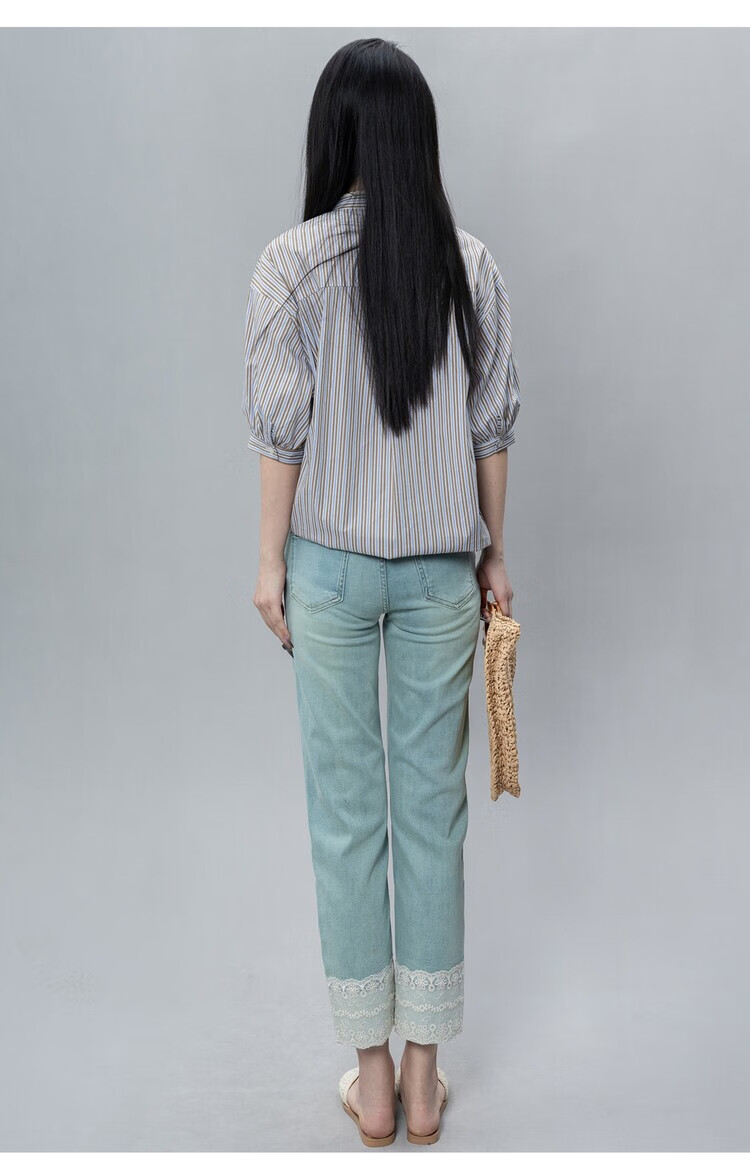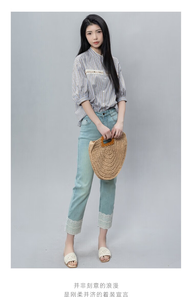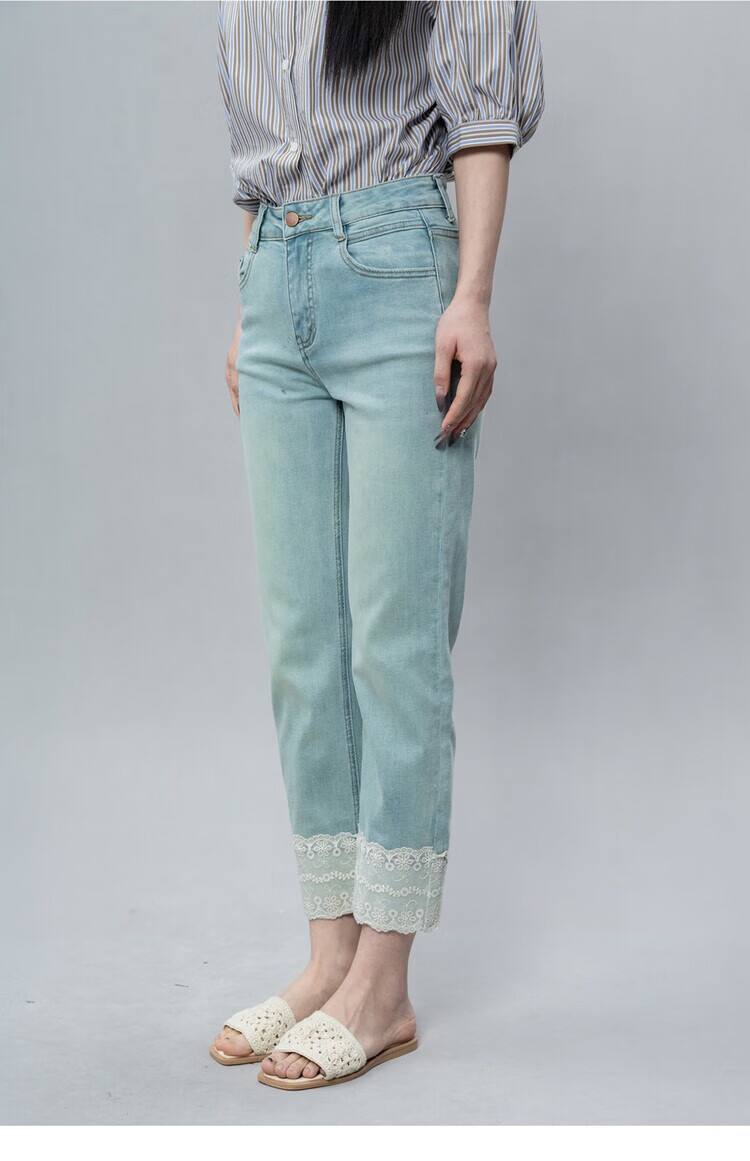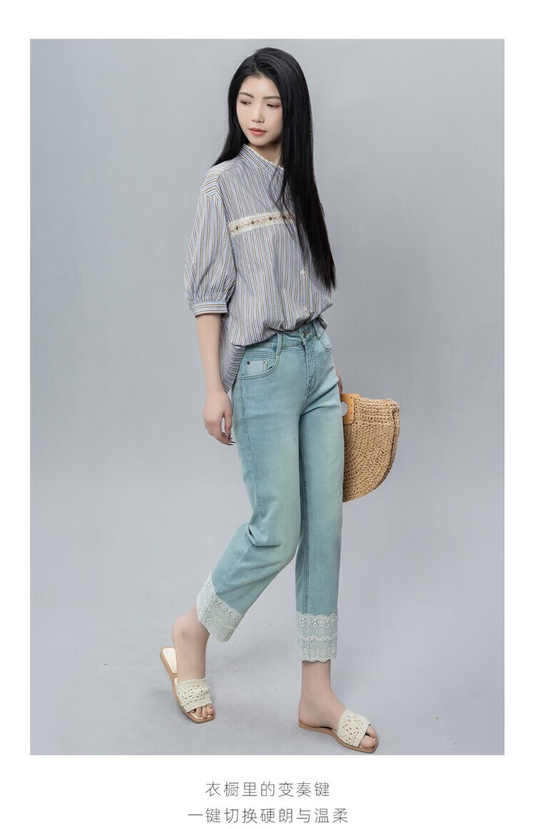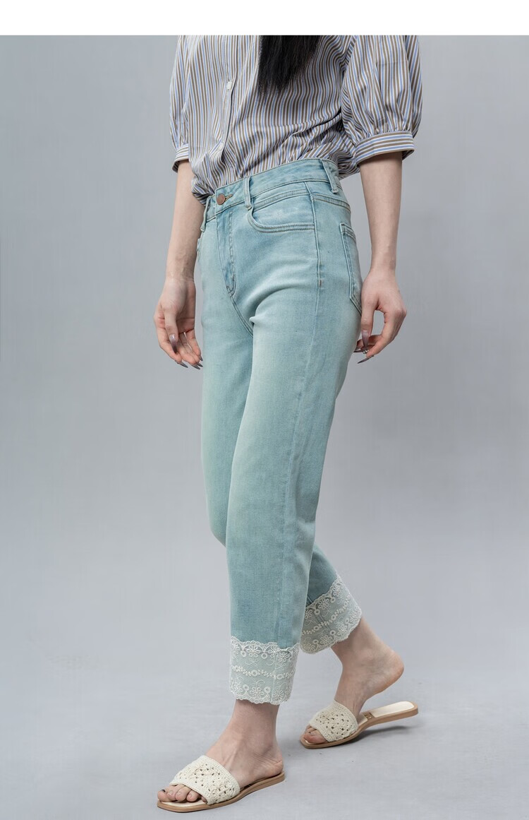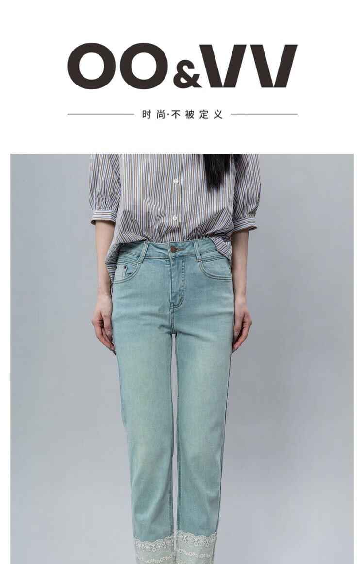 OO&VV复古港风高腰显瘦蕾丝拼接牛仔裤女2025夏新款直筒九分裤子 复古蓝 S