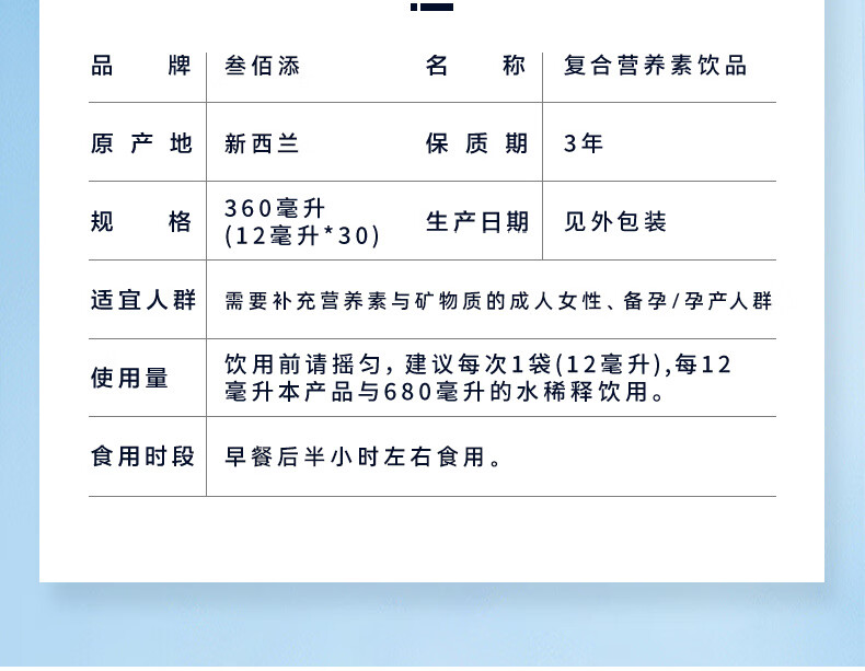 叁佰添新版女性复合营养素饮品铝袋装12毫升*30包 新西兰原装进口 1盒(12ml*30条)