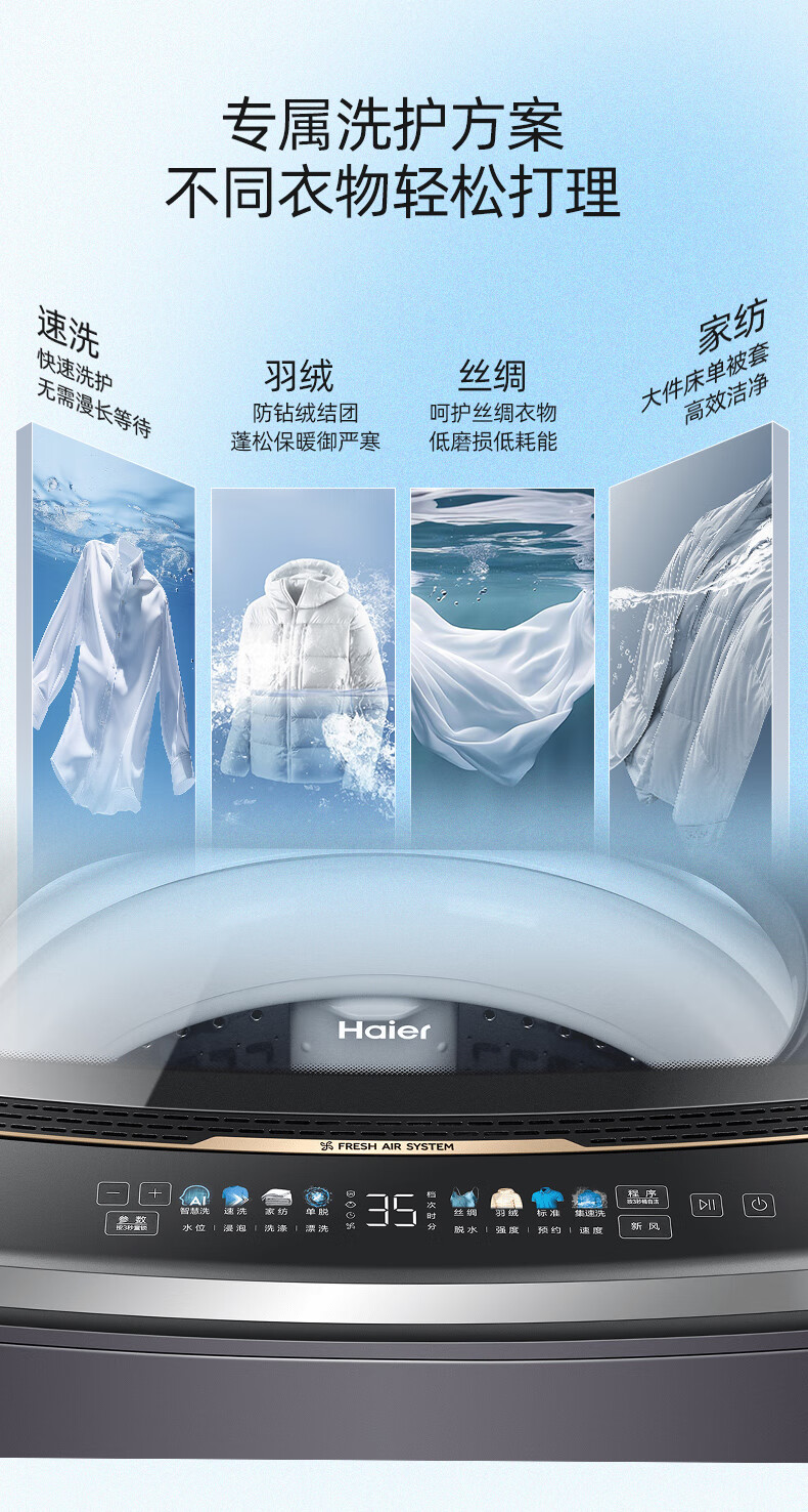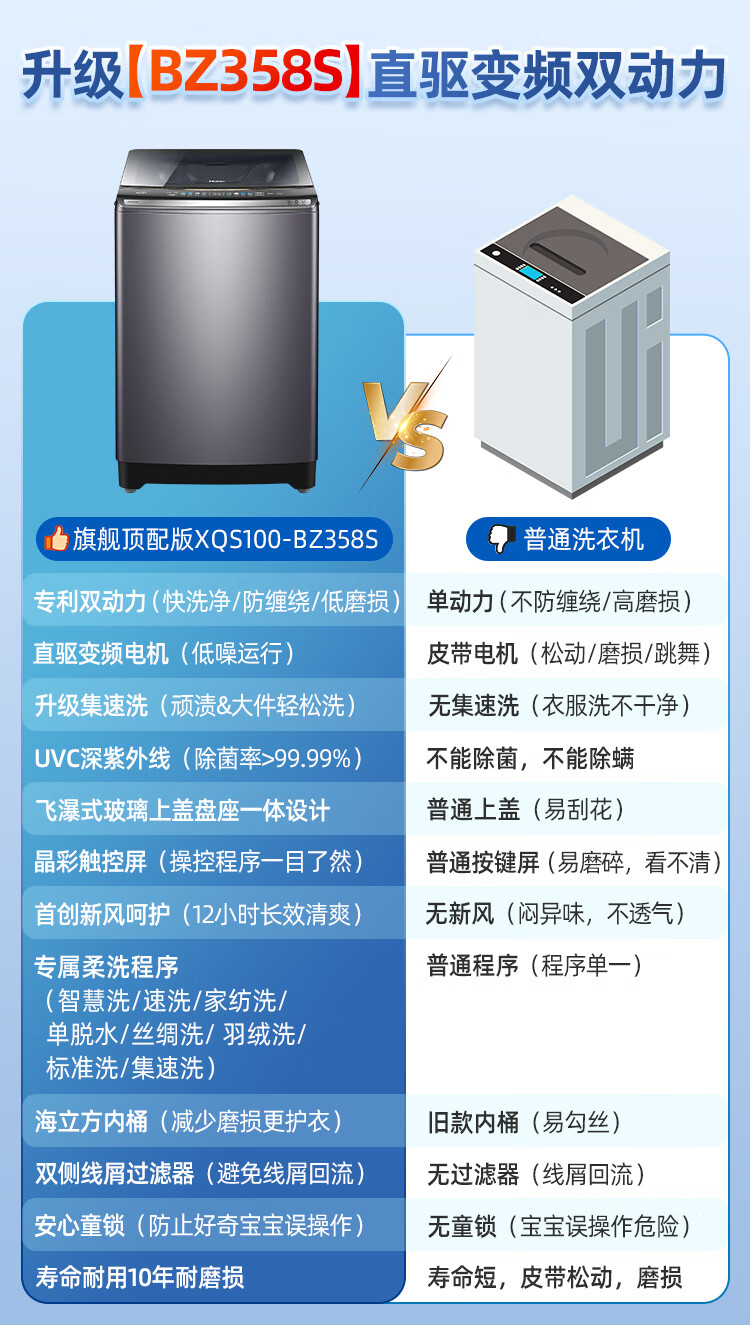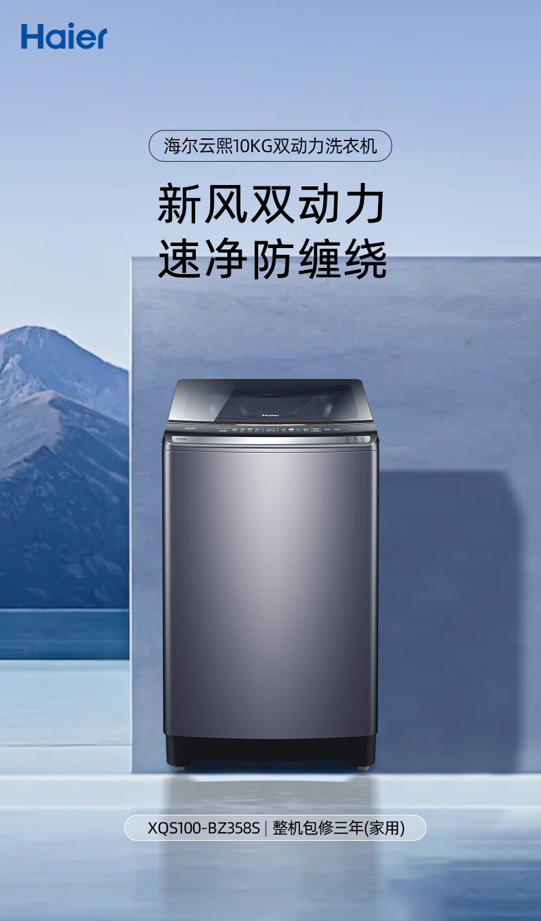 海尔(Haier)波轮洗衣机双动力防缠绕直驱变频10公斤全自动家用大容量杀菌新风一级能效以旧换新补贴云熙358S 【门店同款BZ358S】高颜彩屏+羽绒洗+智慧洗