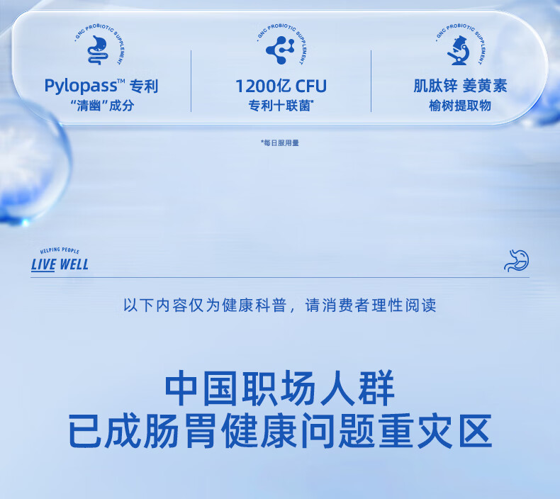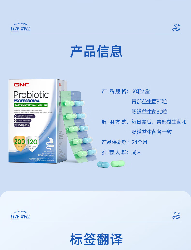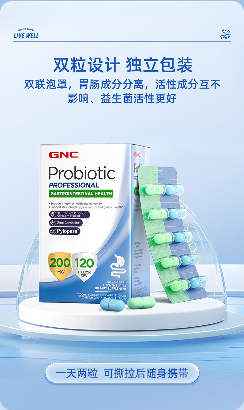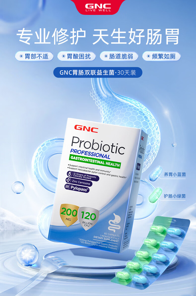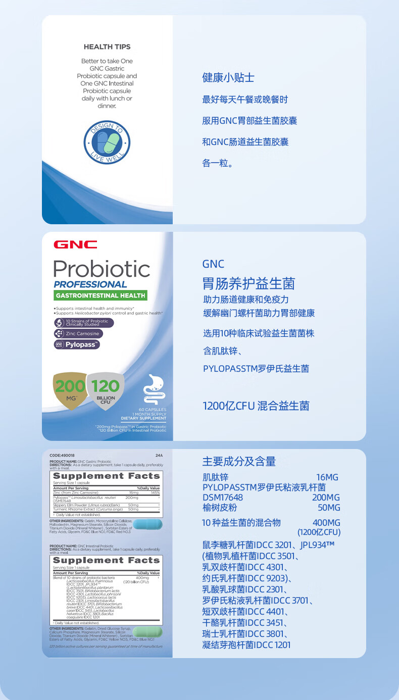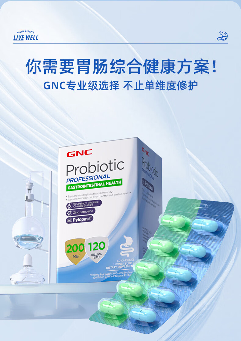 GNC 健安喜胃肠双联益生菌 养胃调理反酸胀气1200亿活菌调理肠道 60粒*1盒