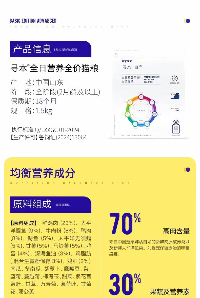 寻本猫粮平衡系列全价冷压鲜肉猫粮1.5kg 成猫幼猫全阶段猫粮 平衡猫粮 1.5kg