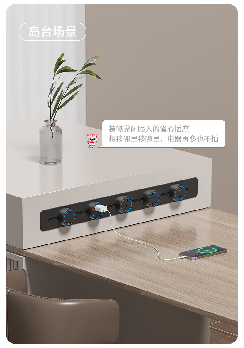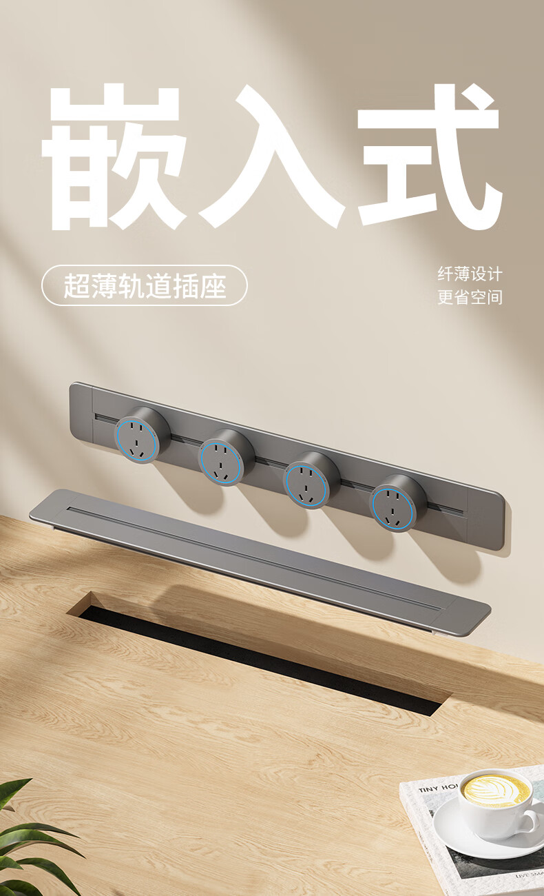 FDD国际电工86型嵌入超薄移动轨道插座大间距五孔蓝灯电源商用免打孔拓展插排 黑色嵌入式轨道-50cm+3个大五孔蓝灯