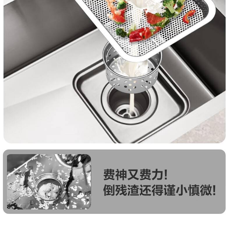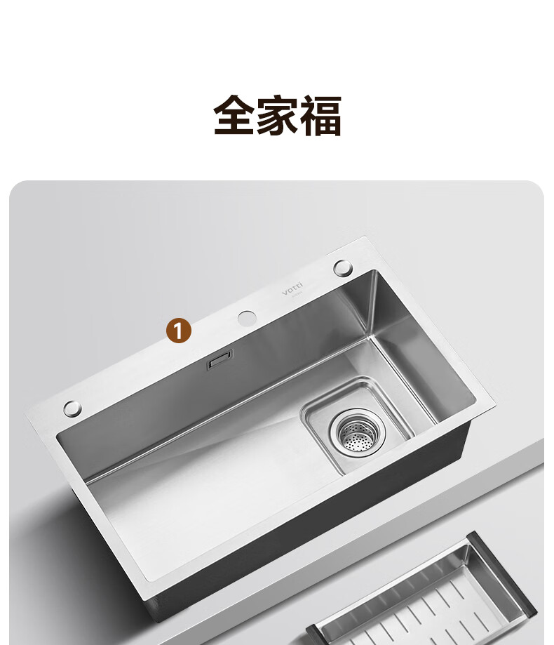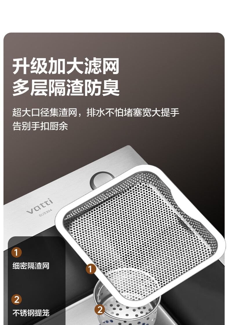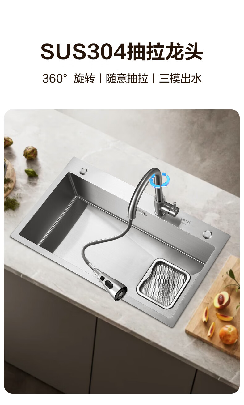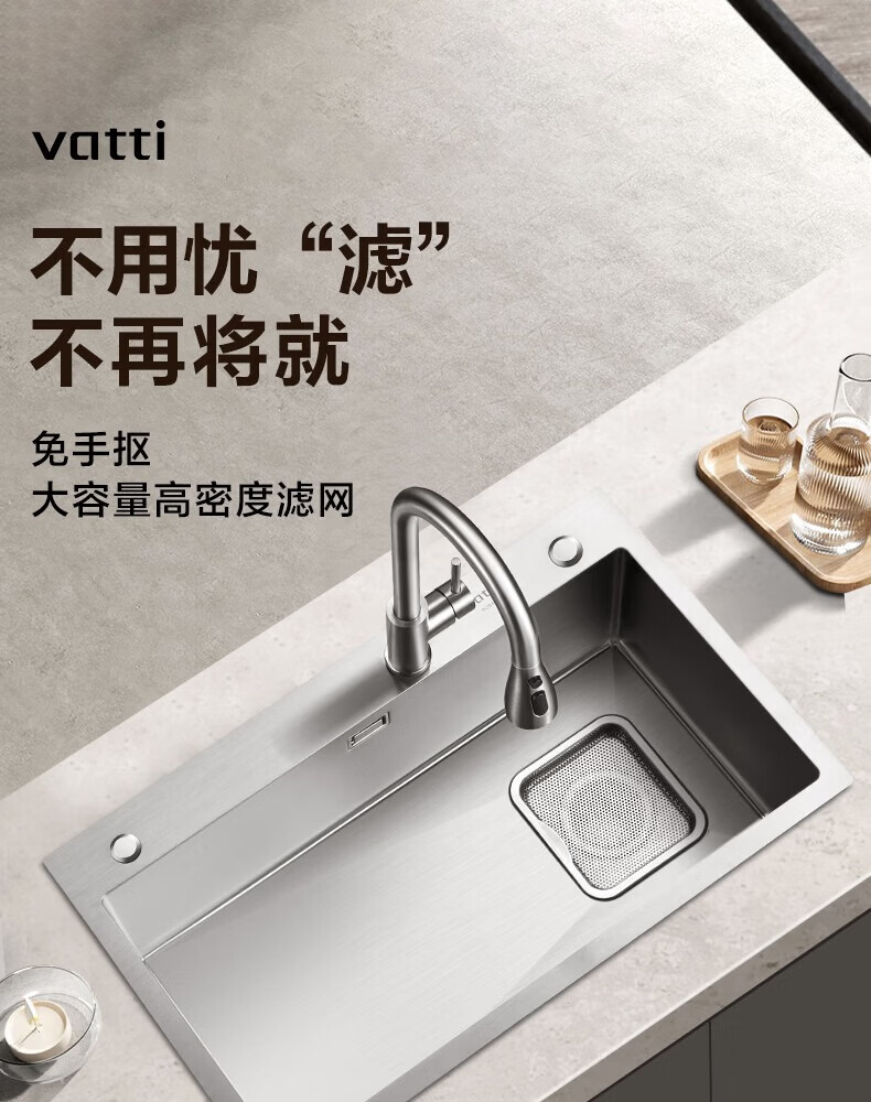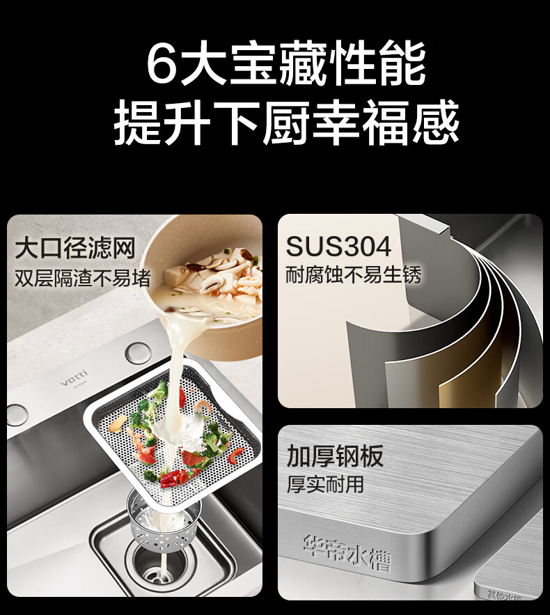 华帝(VATTI)水槽隔渣大单槽厨房水槽家用加厚304不锈钢不忧滤洗菜盆 68*45 不锈钢拉丝大单槽+三模抽拉龙头