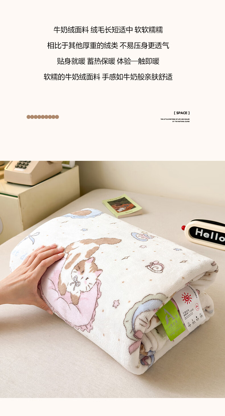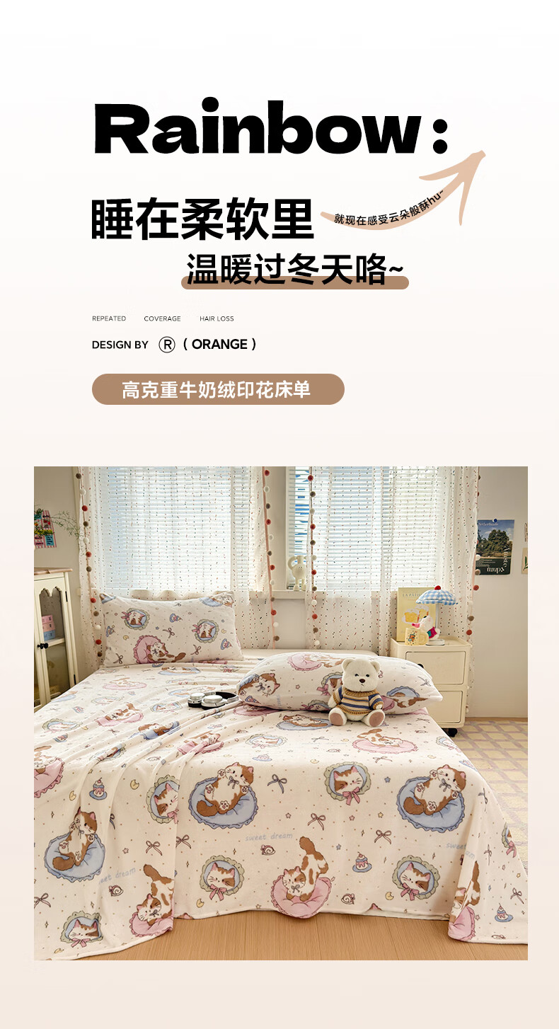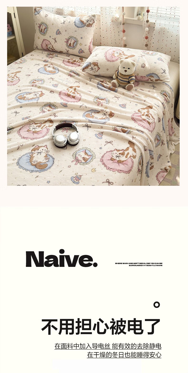 猫人(MiiOW)卡通牛奶绒床单单件 冬季加绒加厚单双人珊瑚绒被单枕套三件套 猫咪礼物【蓄热保暖 软糯亲肤】 200cm*230cm 【单件床单】