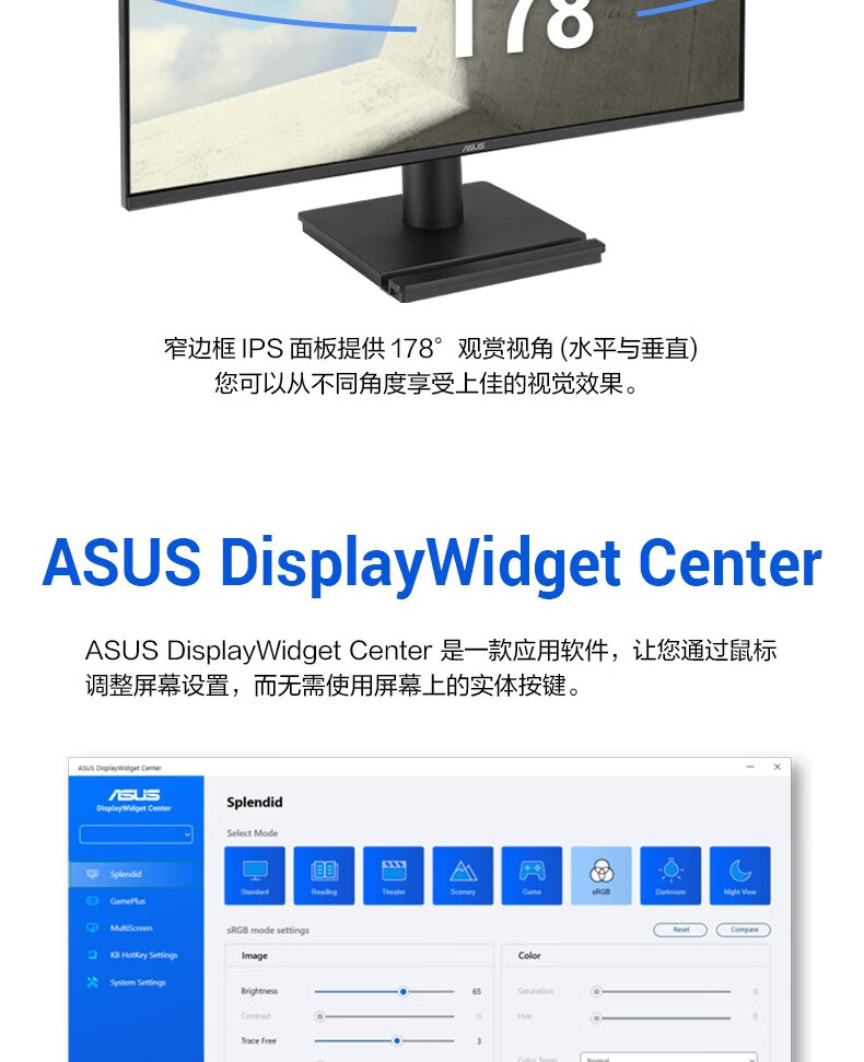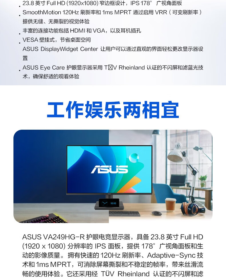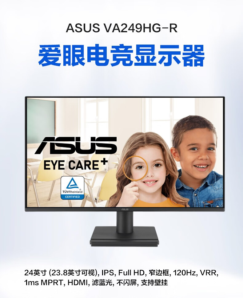 华硕VA249HG-R 23.8英寸护眼电竞显示器IPS 120Hz窄边框1ms响应HDMI滤蓝光VGA不闪屏壁挂Adaptive-Sync