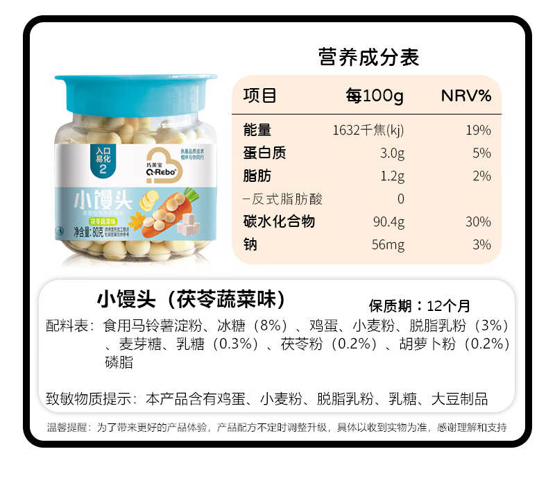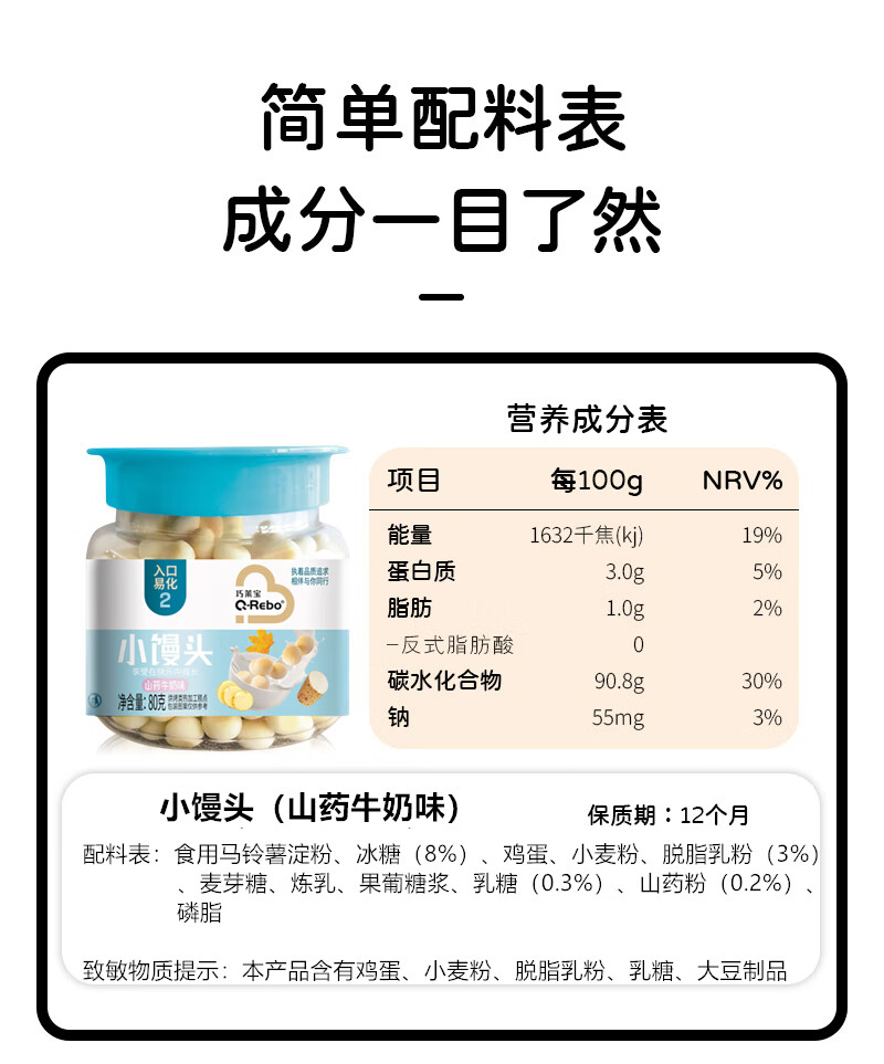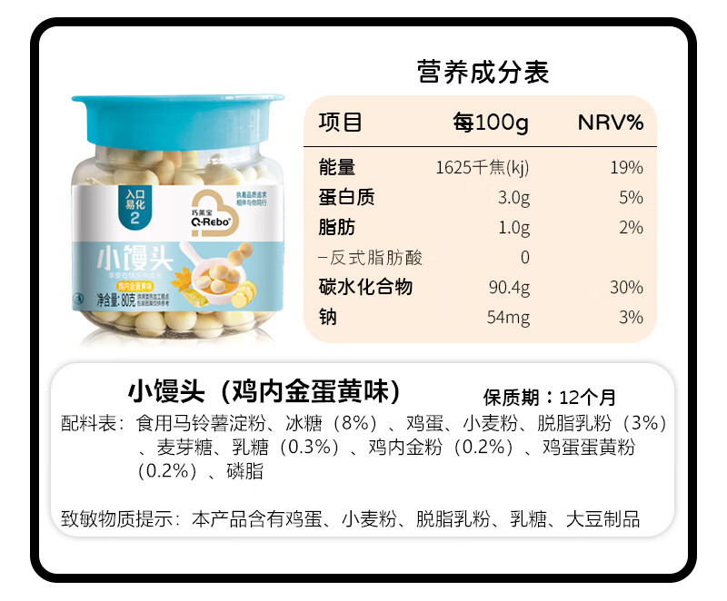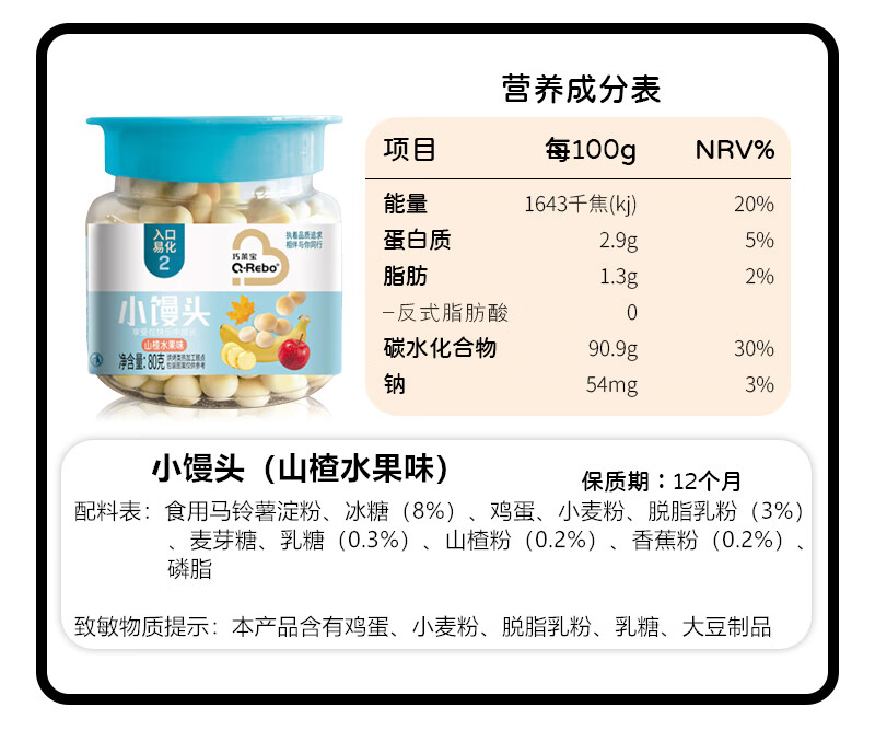巧莱宝小馒头80g/罐 果蔬牛奶多口味营养美味儿童小零食磨牙点心 四种各1罐