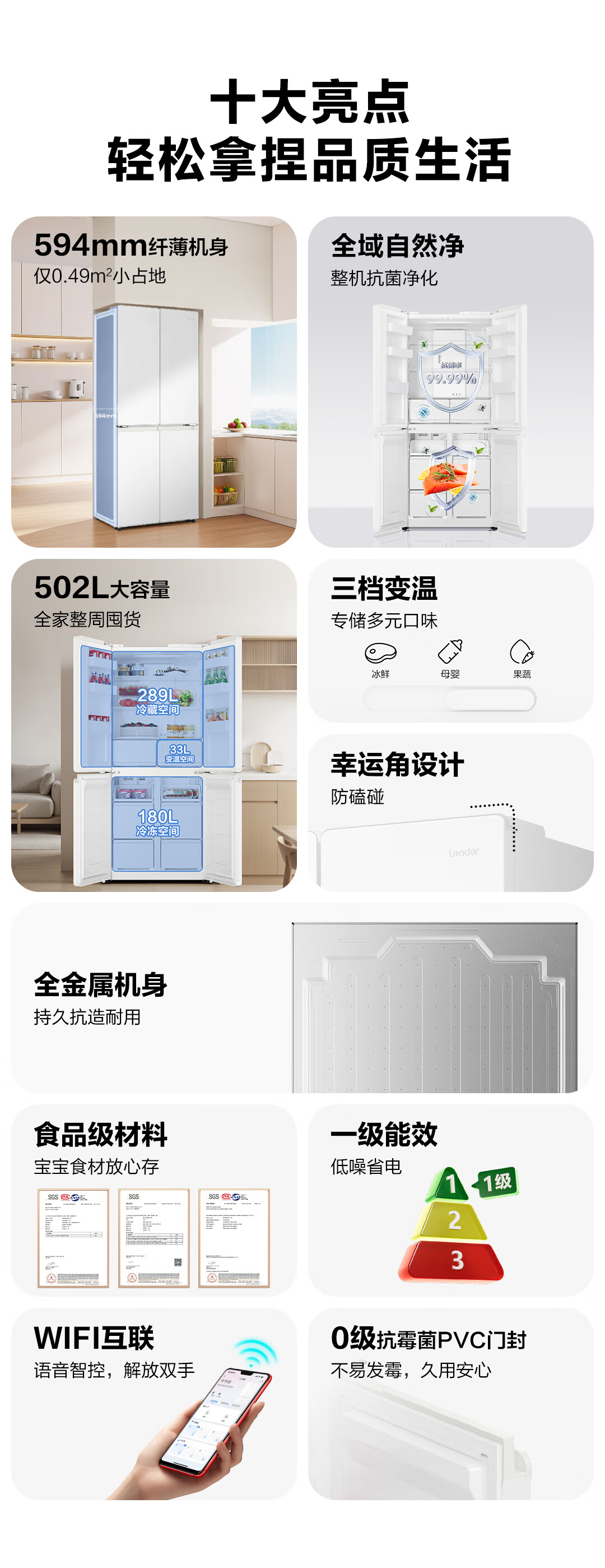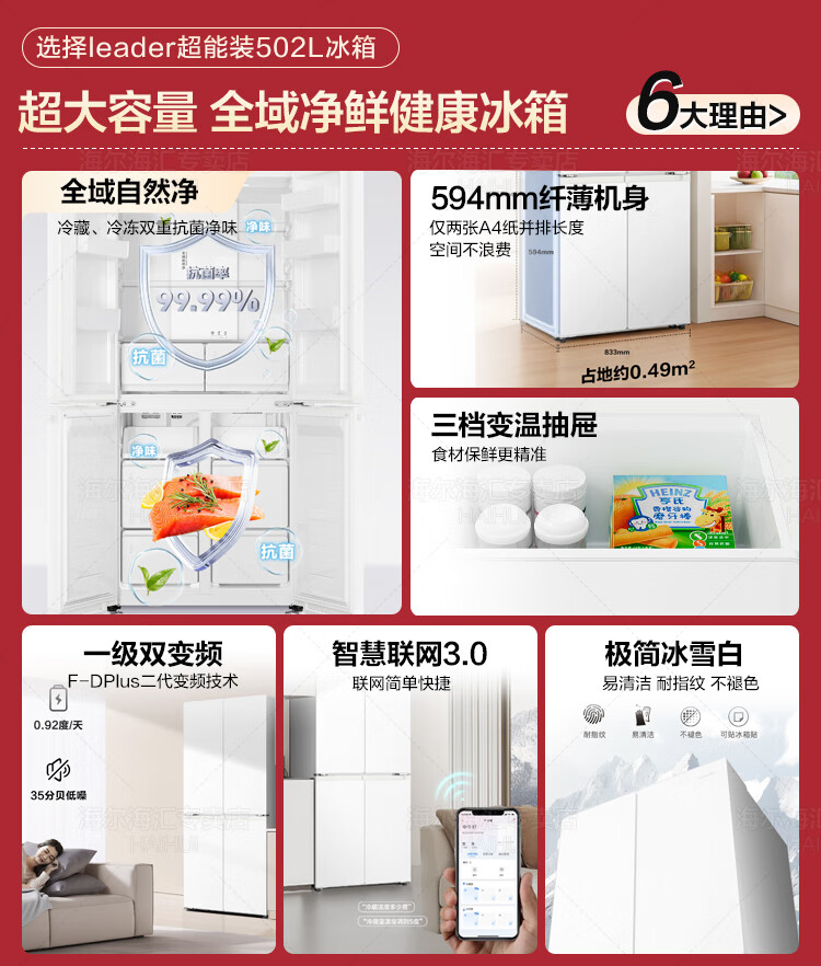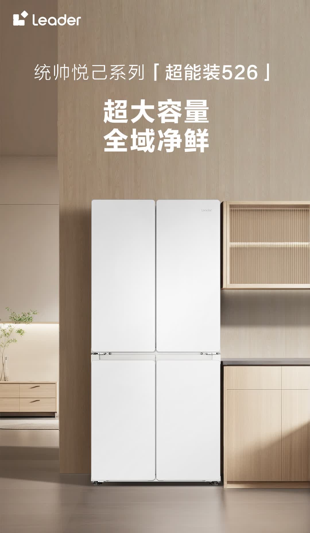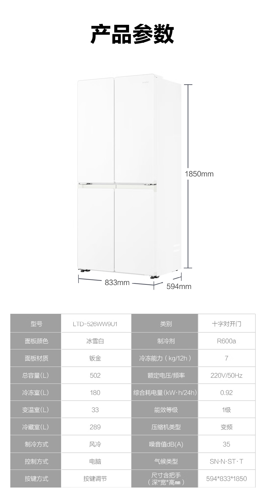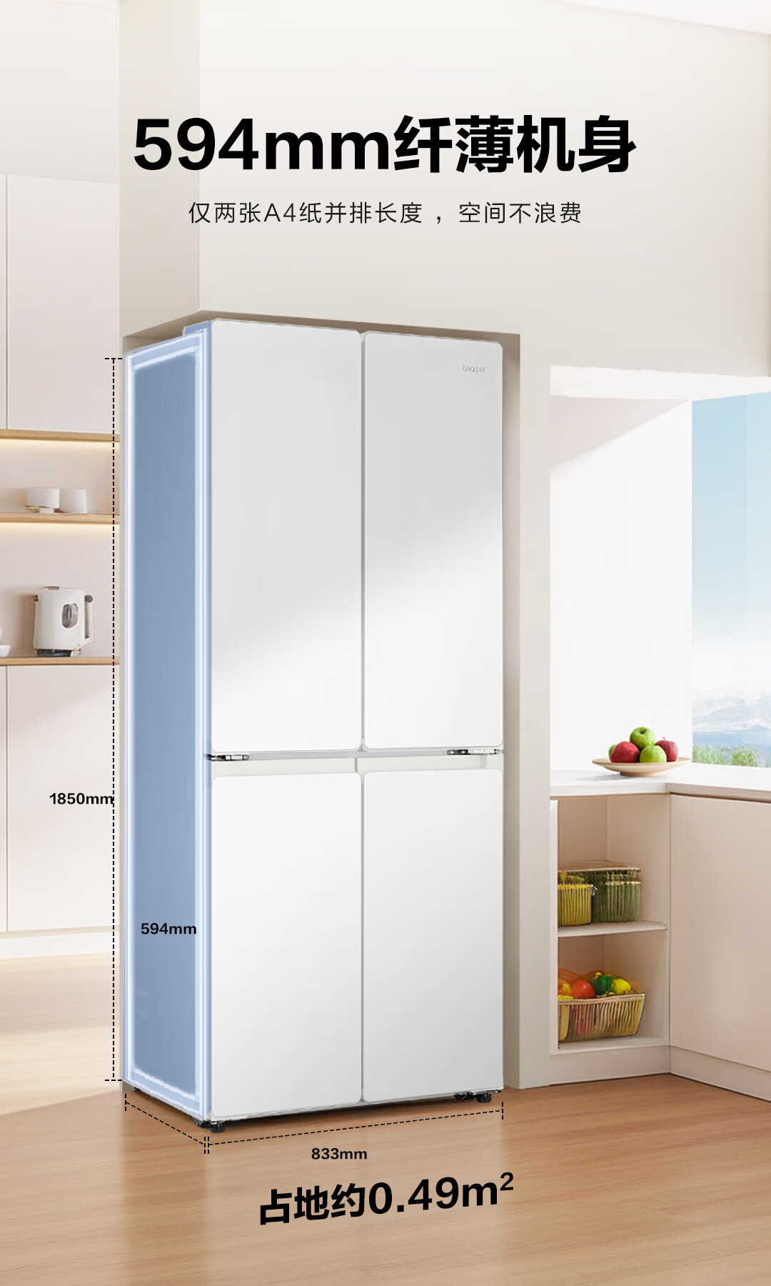 海尔冰箱出品502升四开门Leader十字开门594mm超薄机身526一级能效双变频风冷无霜大容量家用电冰箱 一级双变频 全域双净味+母婴三档变温