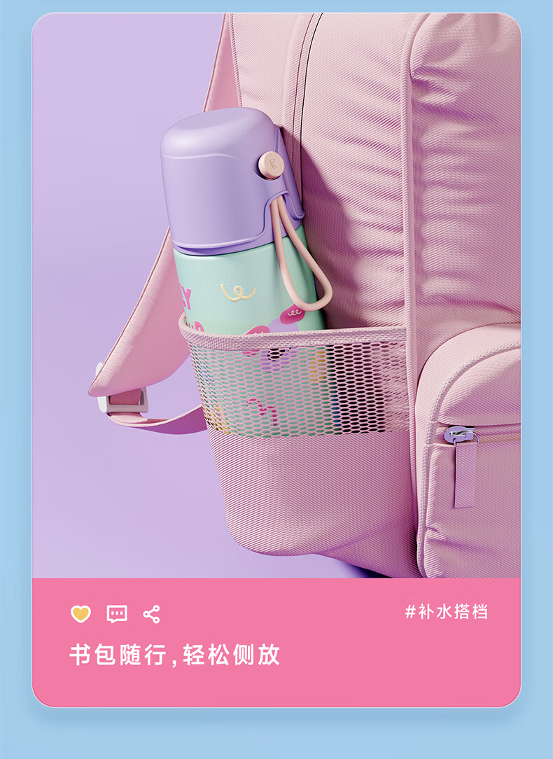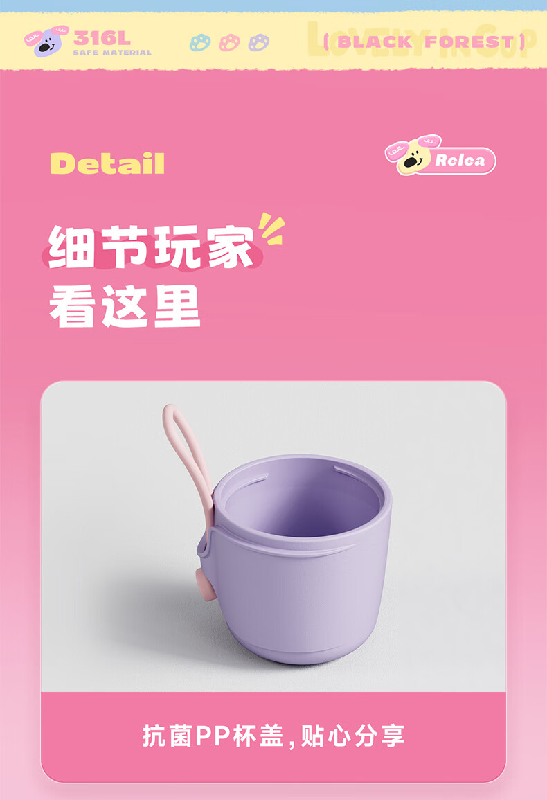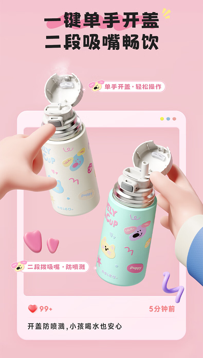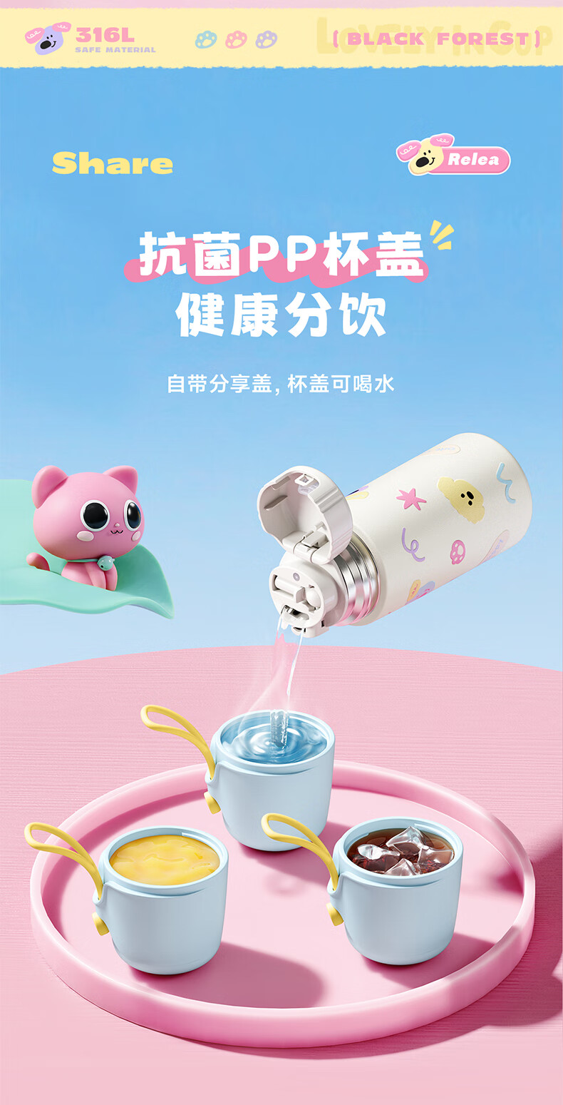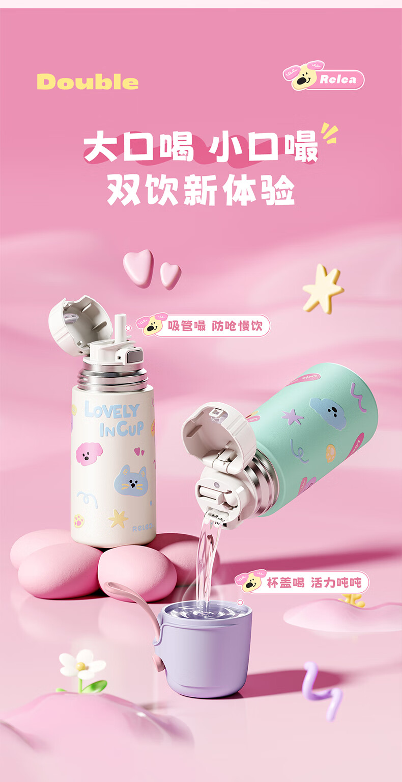 富光儿童保温杯双饮大容量316L不锈钢吸管水杯子上学男女生高颜值礼物 小蒂蓝(一杯双饮)500ml