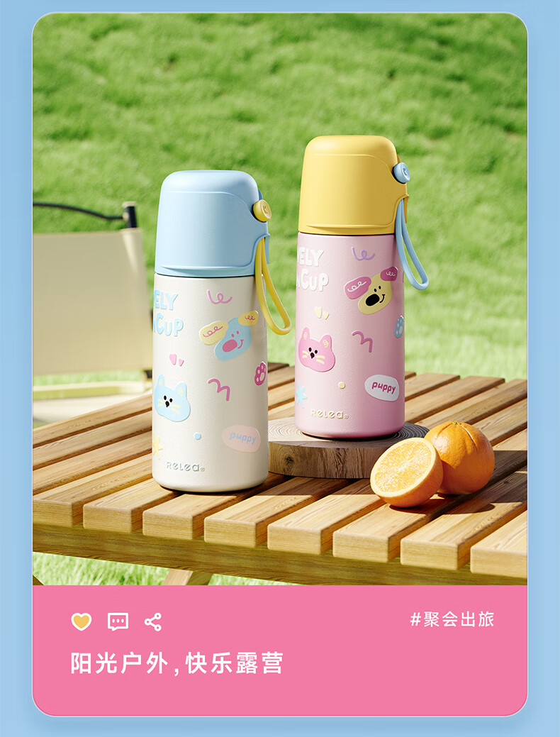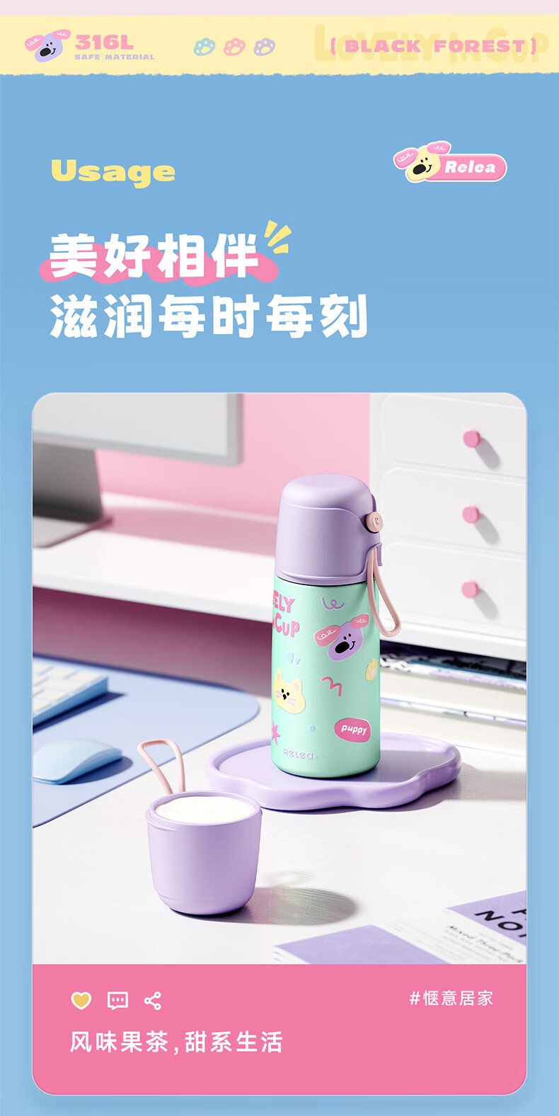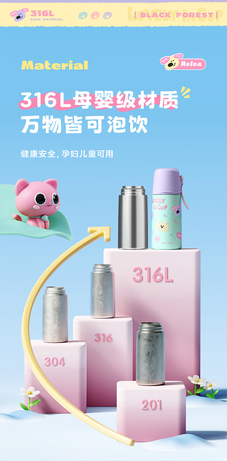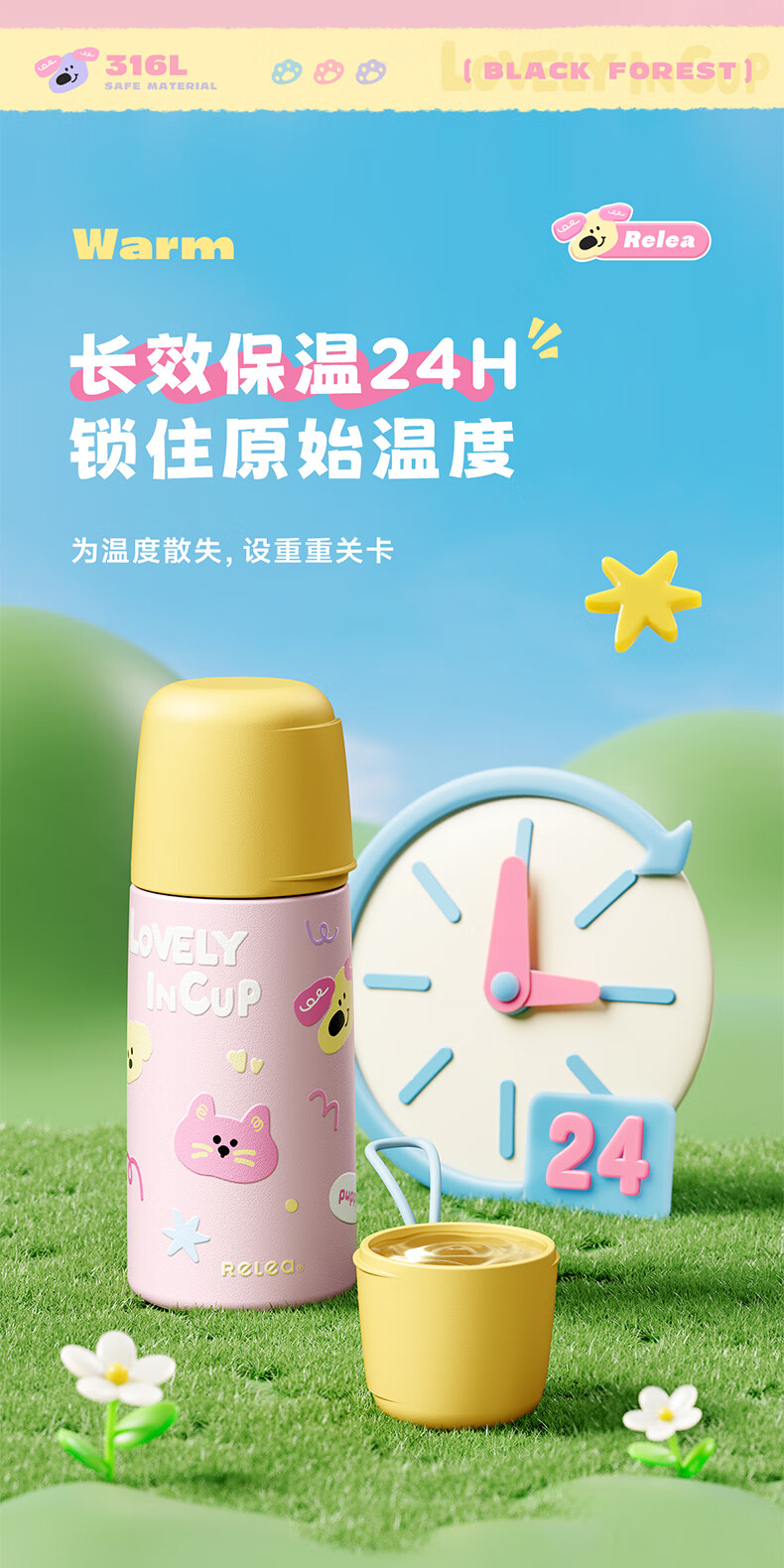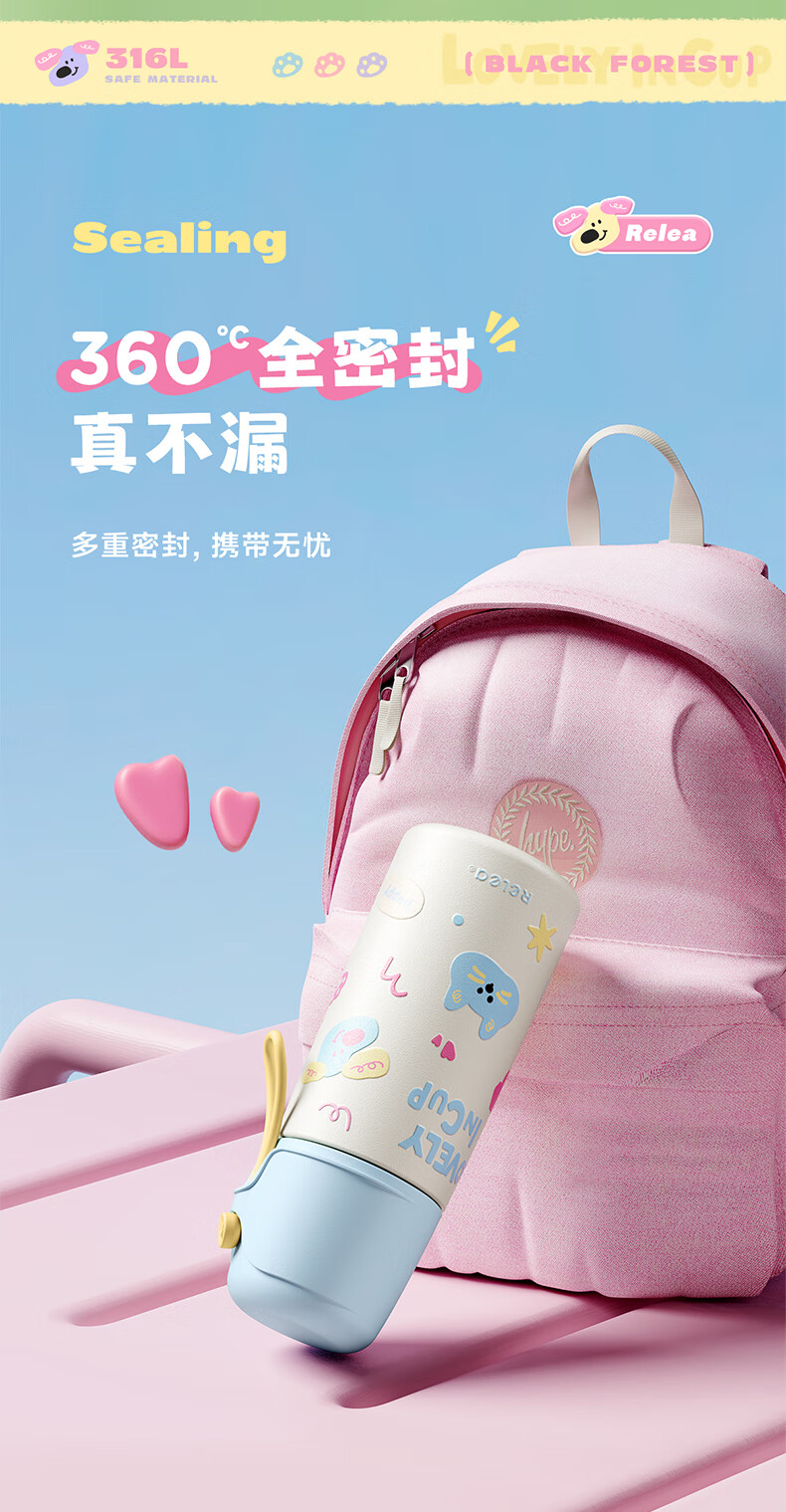 富光儿童保温杯双饮大容量316L不锈钢吸管水杯子上学男女生高颜值礼物 小蒂蓝(一杯双饮)500ml