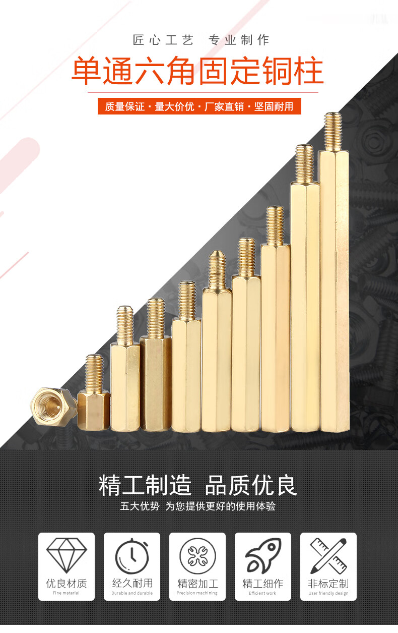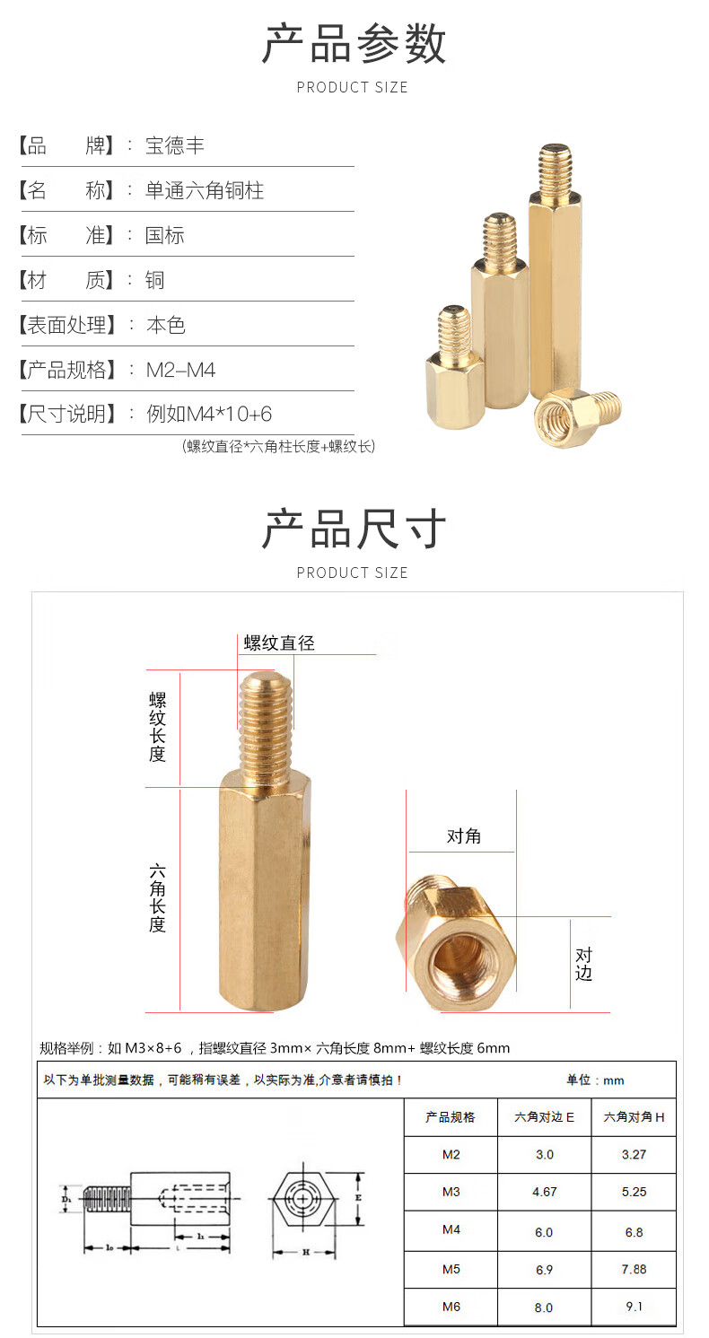 宝德丰六角铜柱机箱螺丝钉单通螺母柱主板支撑隔离柱单头螺柱铜柱M3M4M6 M2x2+2(100只)