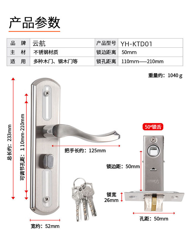 云航锁体卧室门锁体通用木门锁体室内门锁体房间门锁小50锁体 125A锁体(锁舌间距60mm)