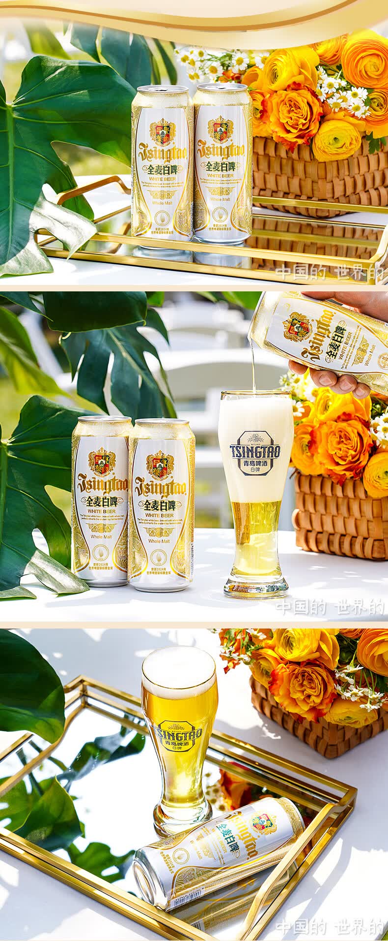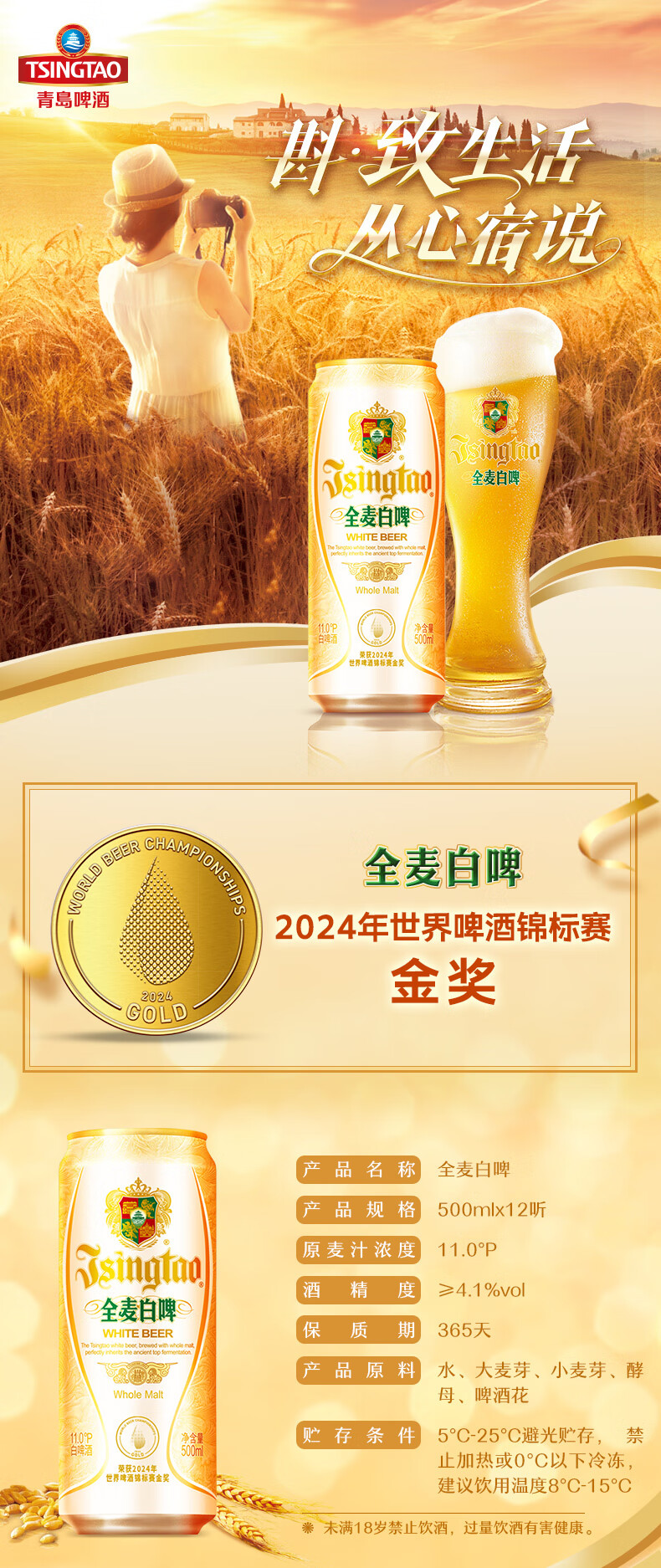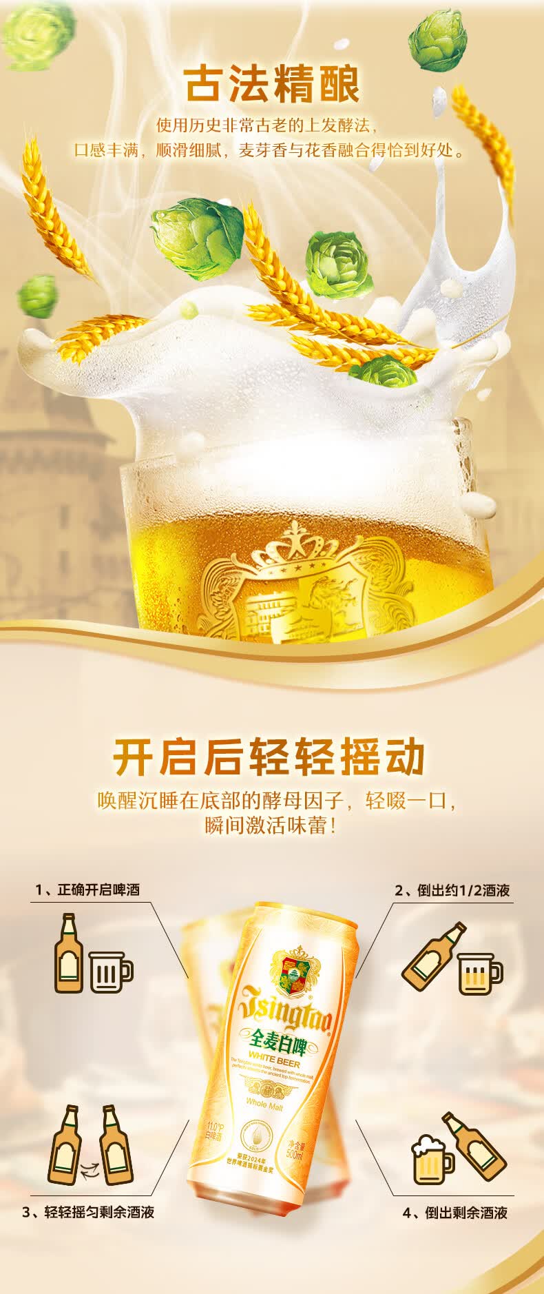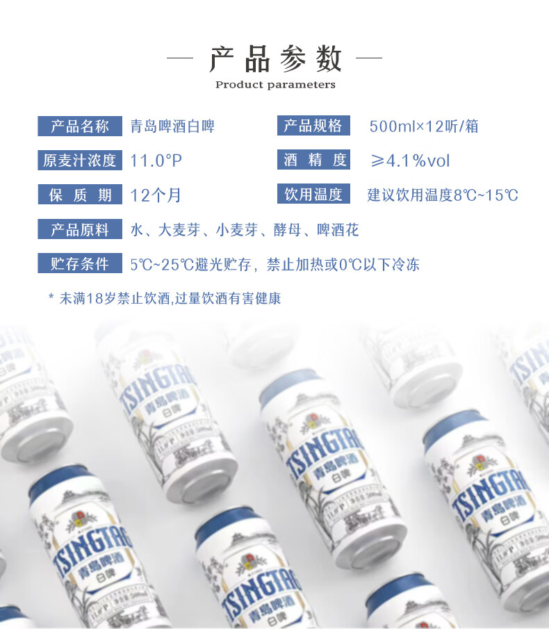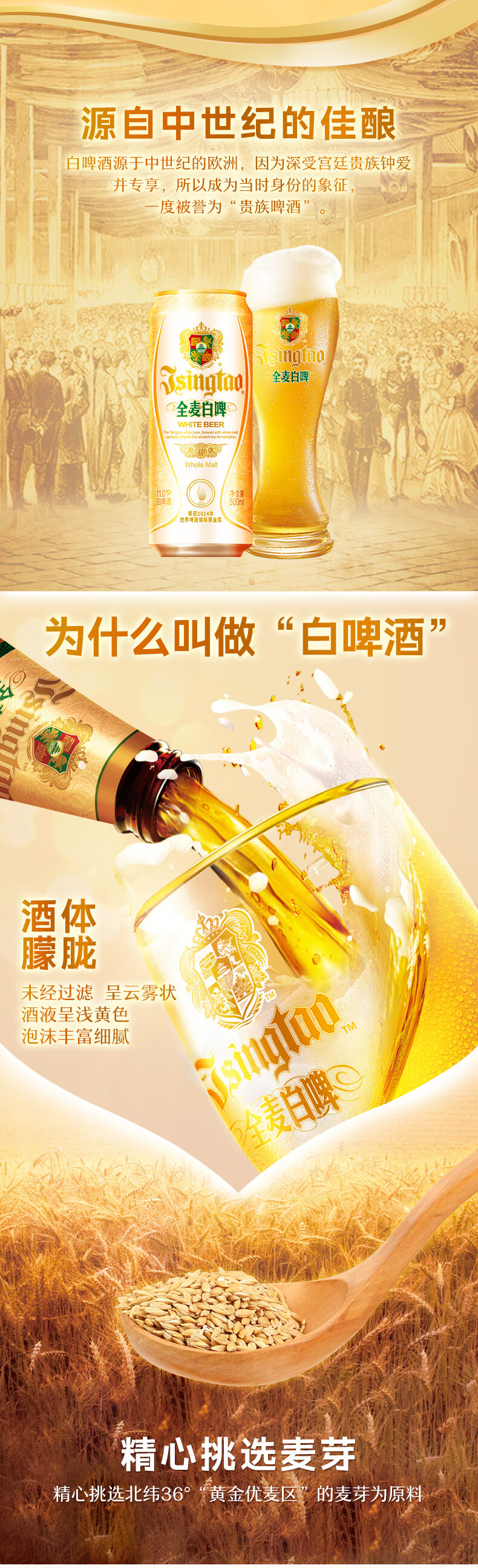 青岛啤酒白啤原麦汁浓度11°P 古法精酿全麦白啤整箱 500mL 12罐