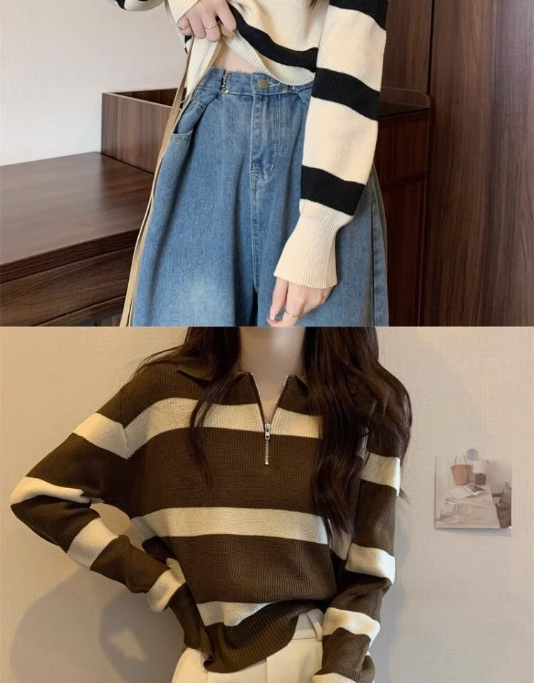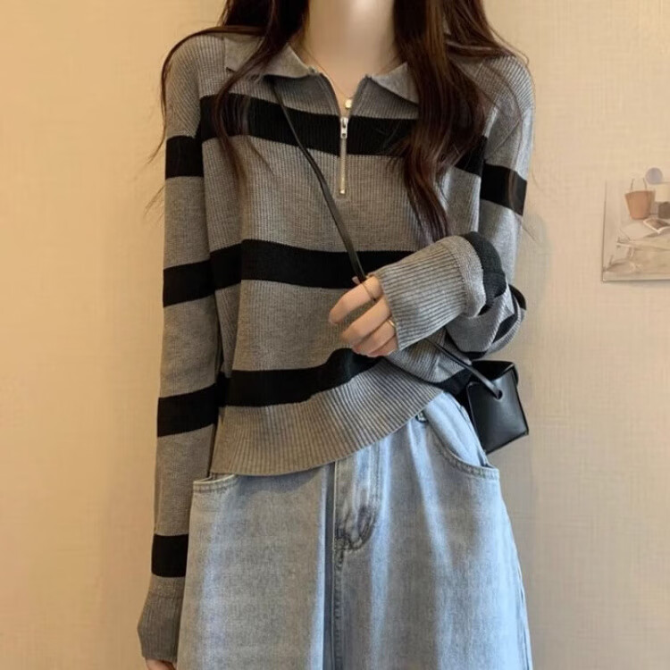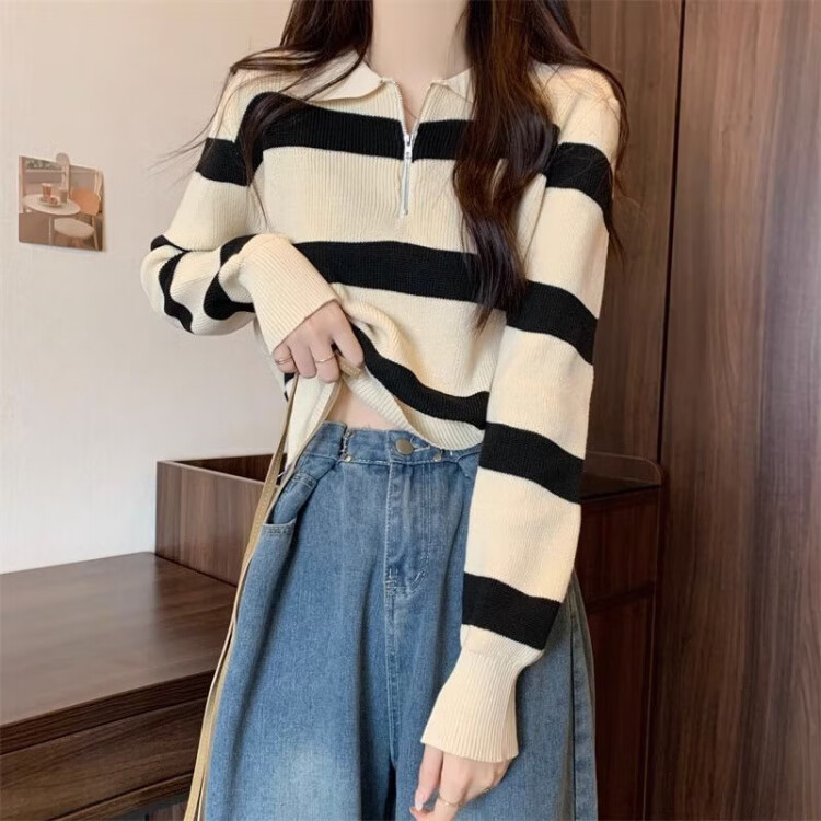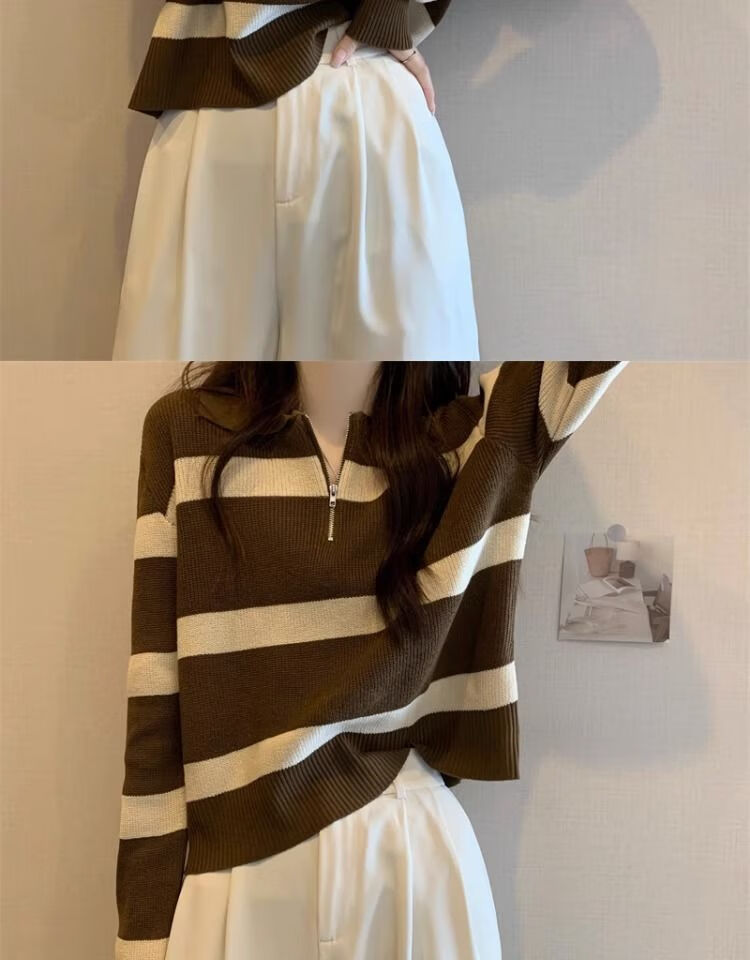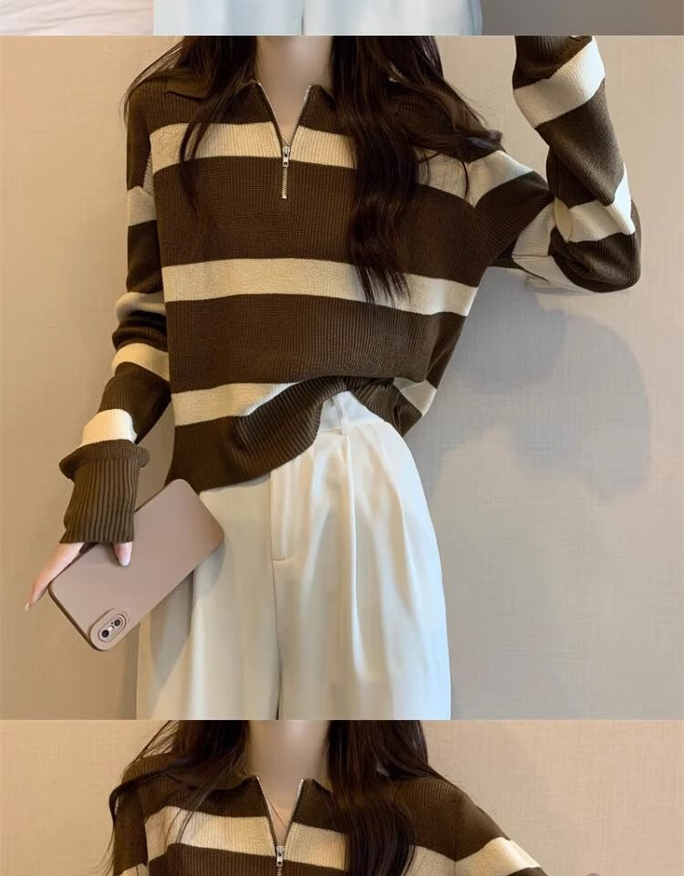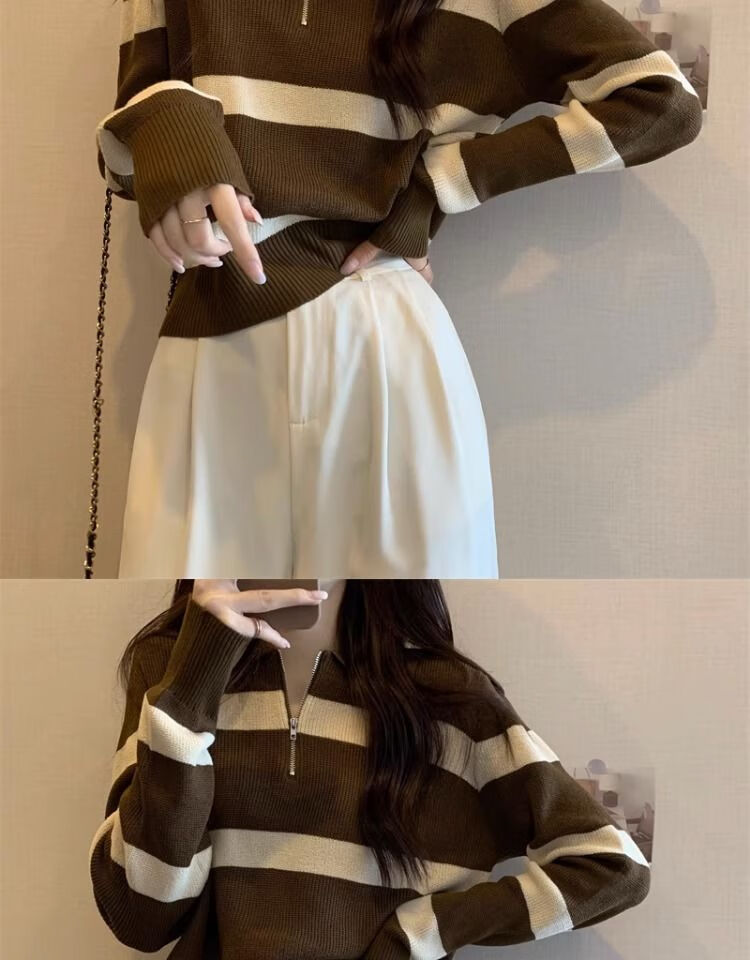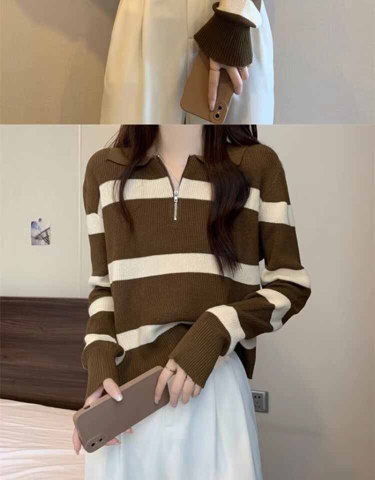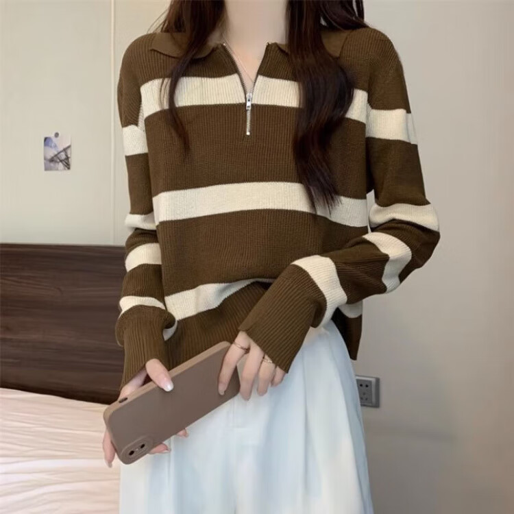 朵貌2025新款拉链毛衣打底衫内搭条纹针织衫女秋冬长袖polo领正肩上衣 咖啡色 XL 【建议110-120斤】