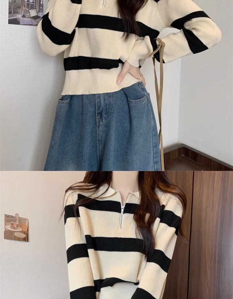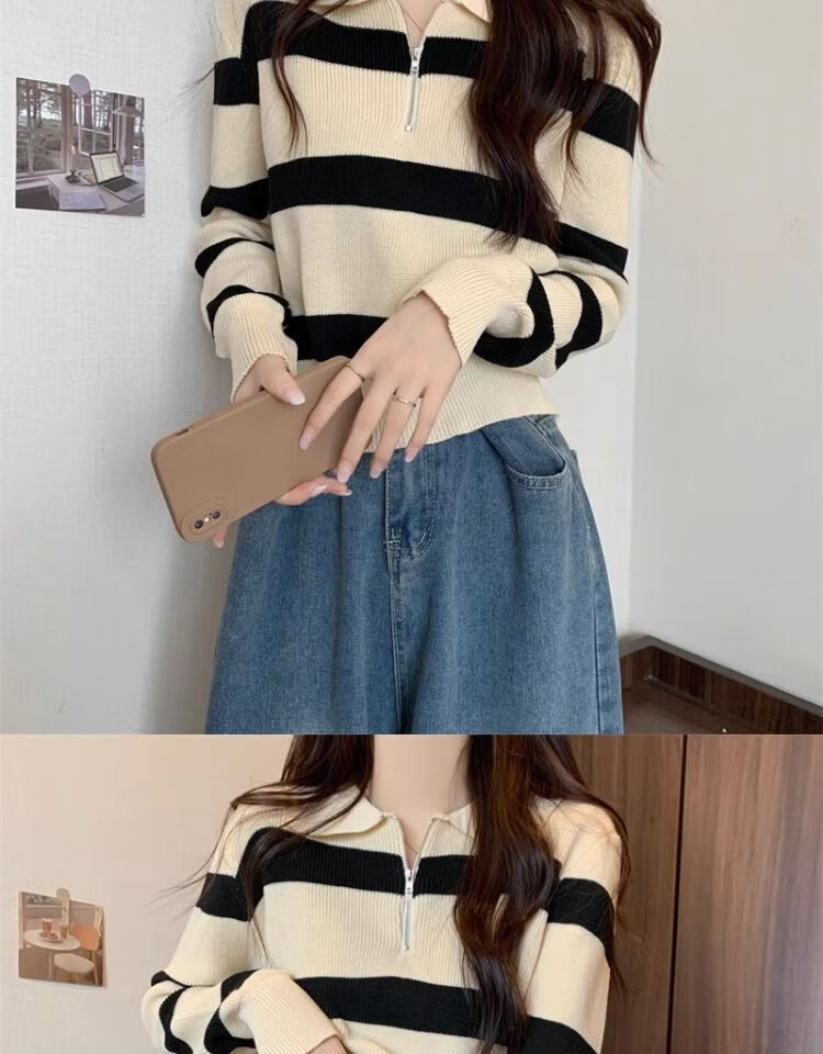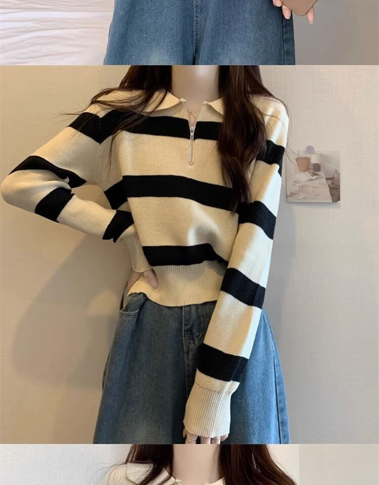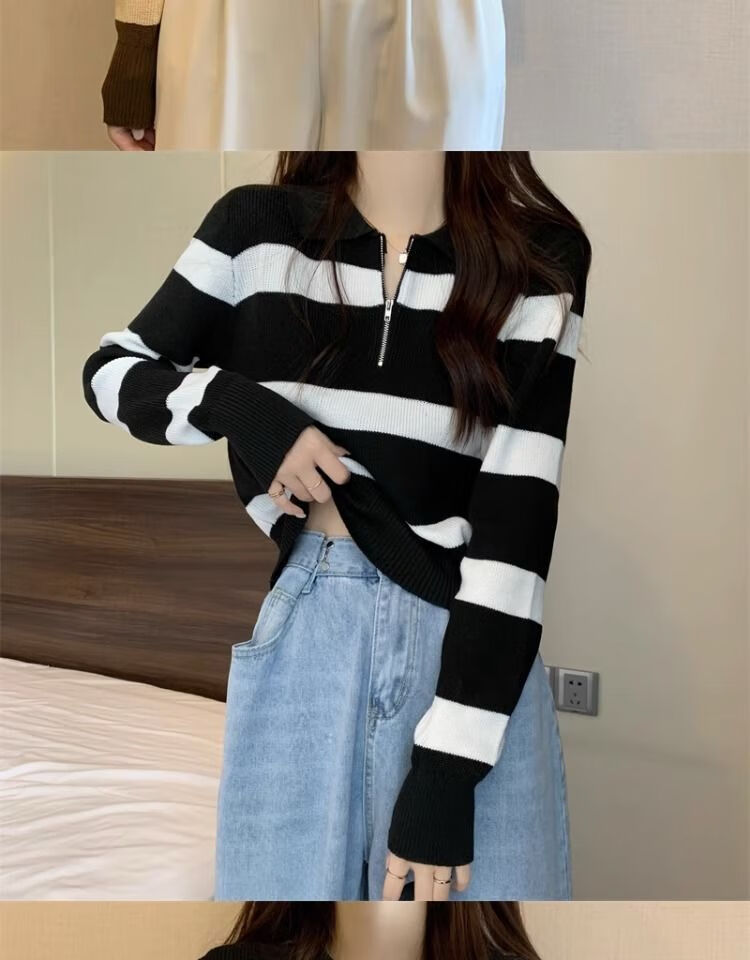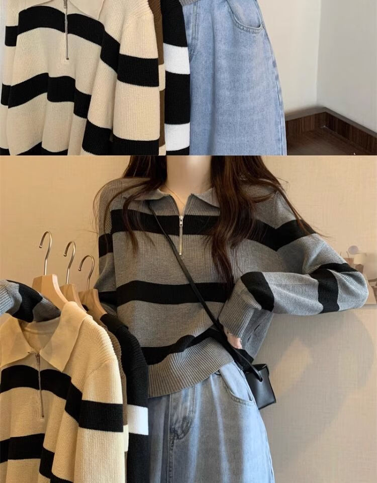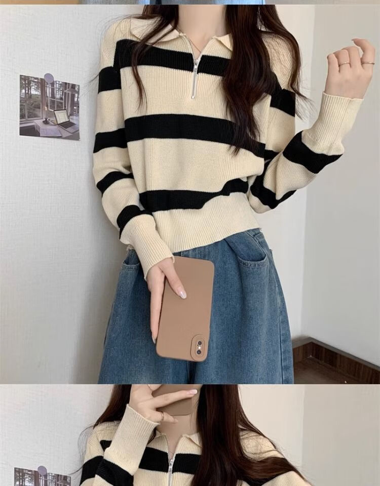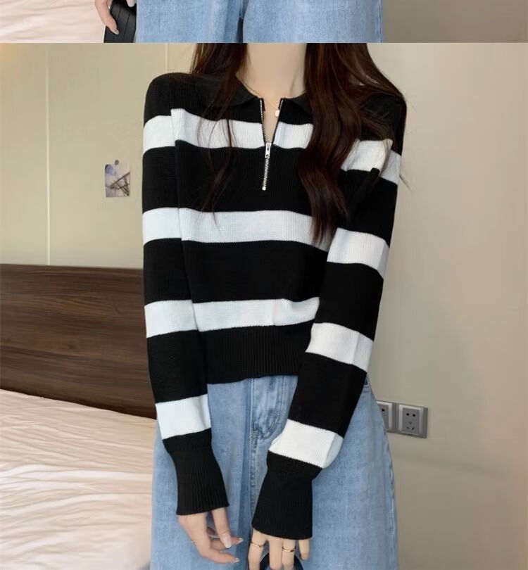 朵貌2025新款拉链毛衣打底衫内搭条纹针织衫女秋冬长袖polo领正肩上衣 咖啡色 XL 【建议110-120斤】