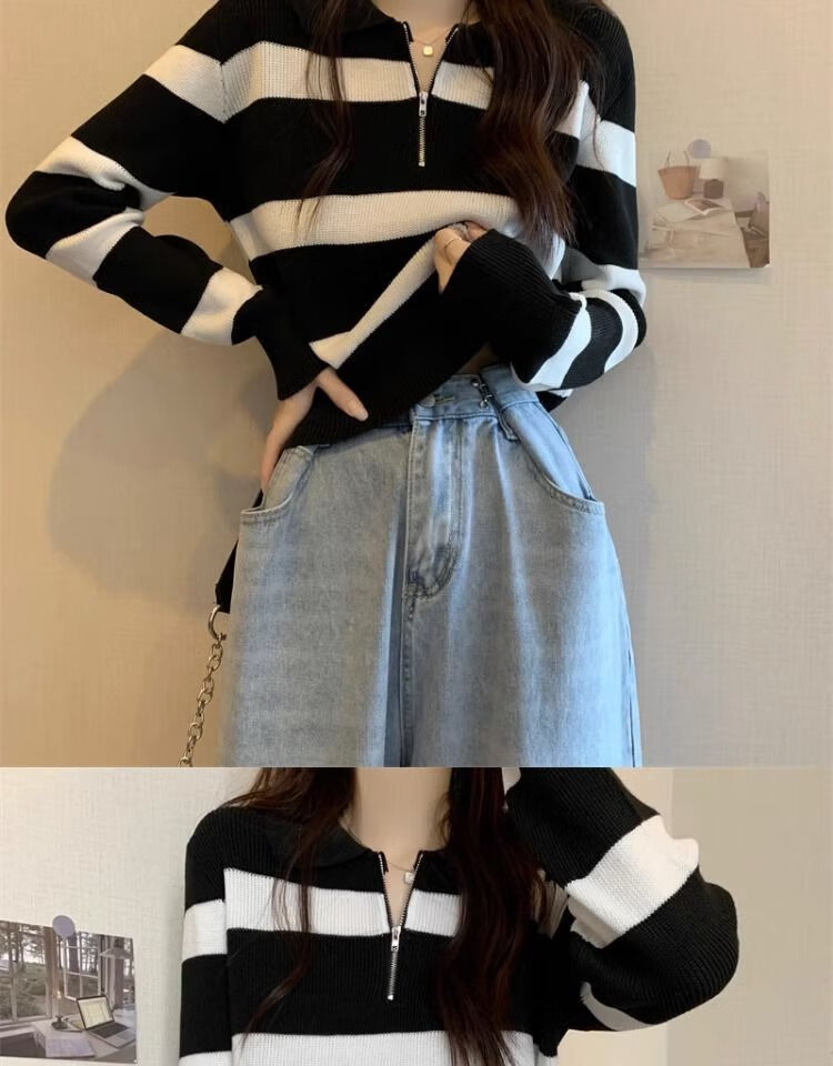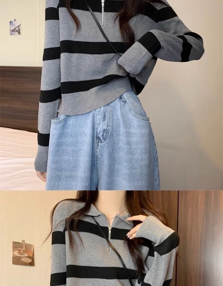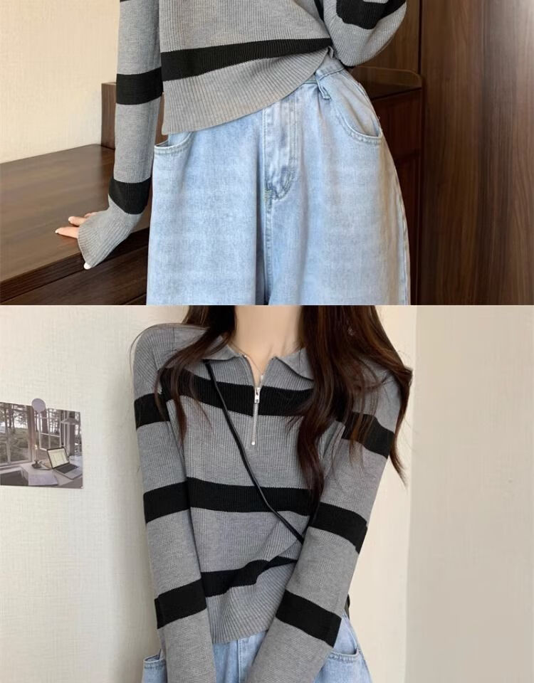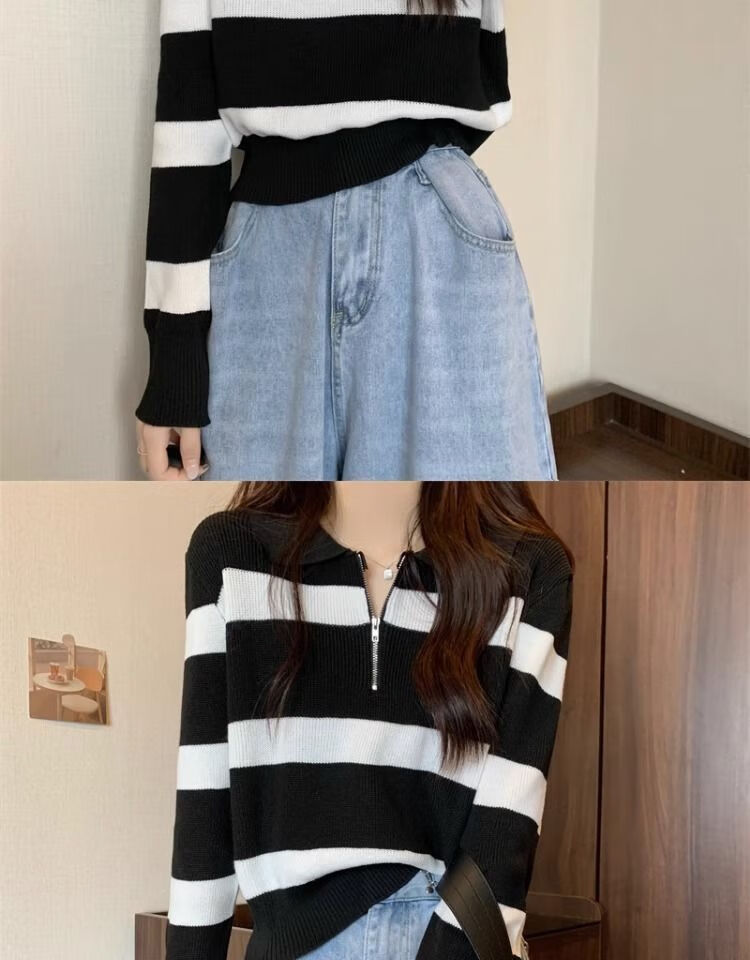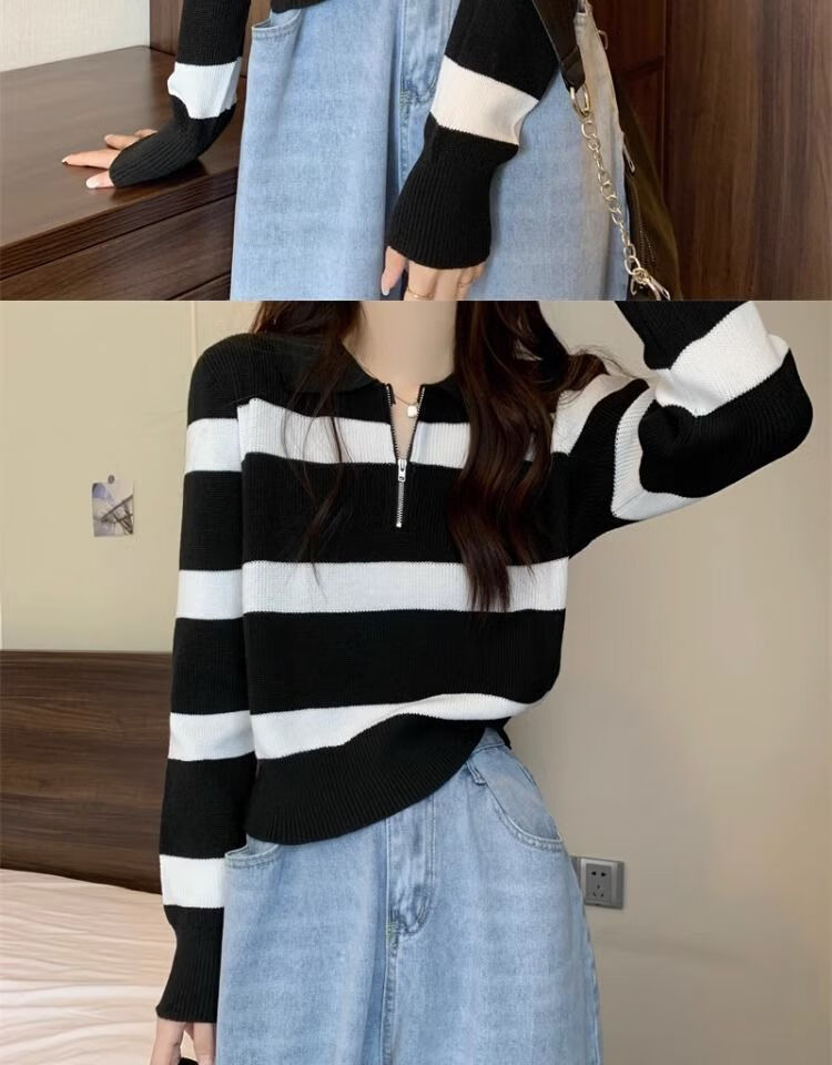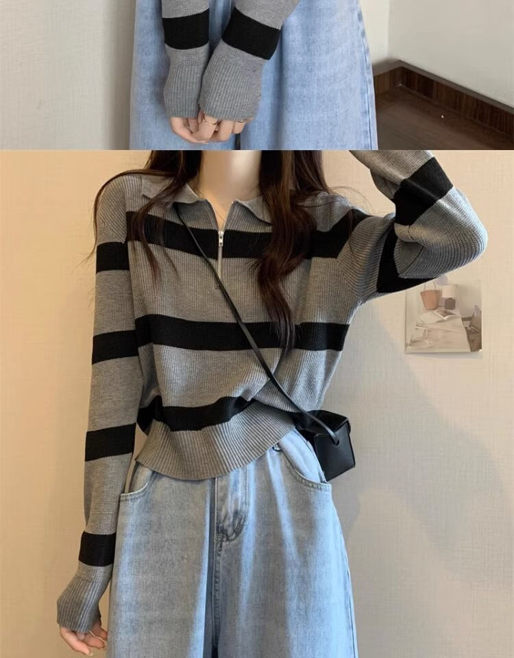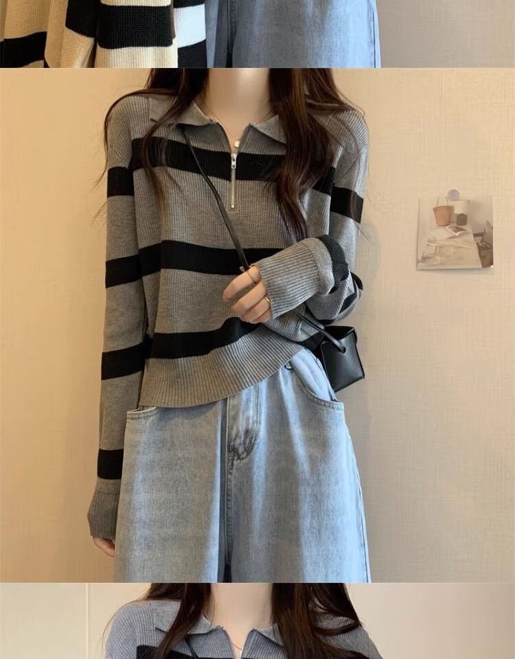 朵貌2025新款拉链毛衣打底衫内搭条纹针织衫女秋冬长袖polo领正肩上衣 咖啡色 XL 【建议110-120斤】
