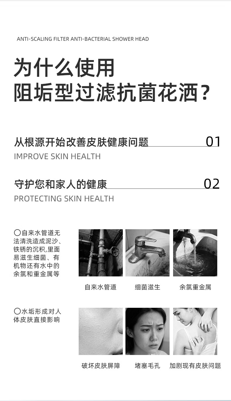 CUNKOY【德国】淋浴增压花洒喷头带软管一套浴室洗澡加压莲蓬花洒头套装 五档增压花洒+1.5米软管【雅黑】 强劲增压丨密集大出水