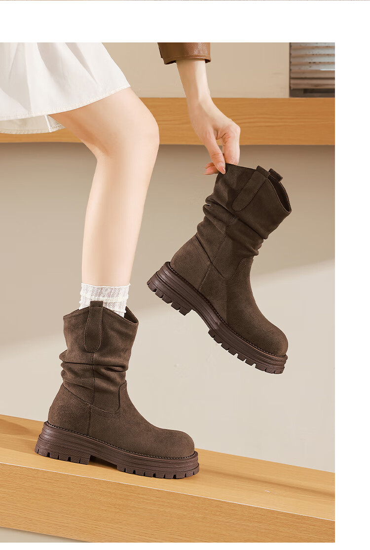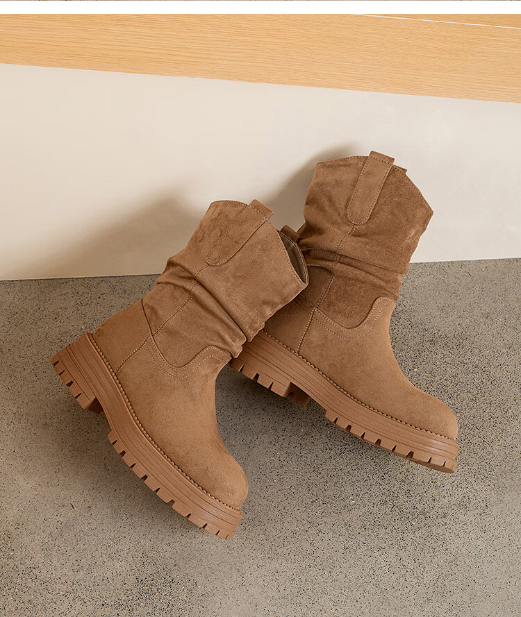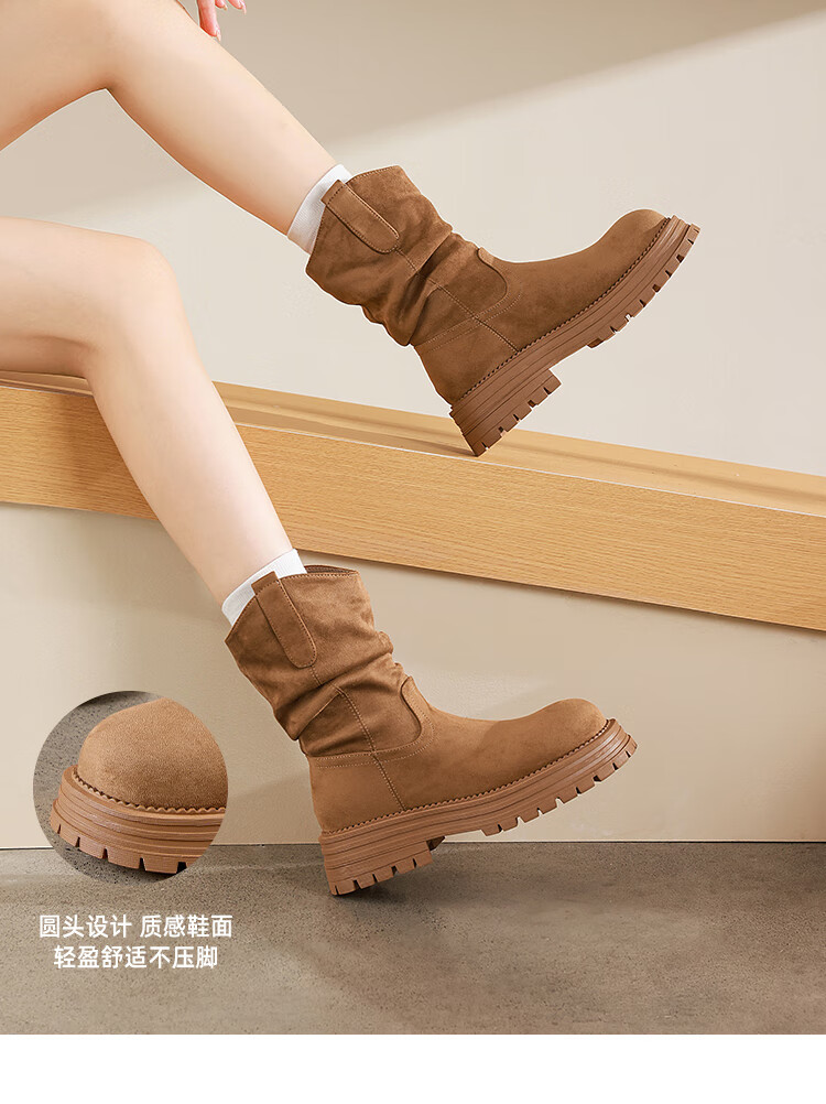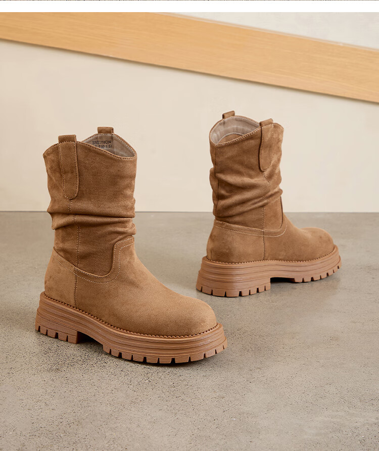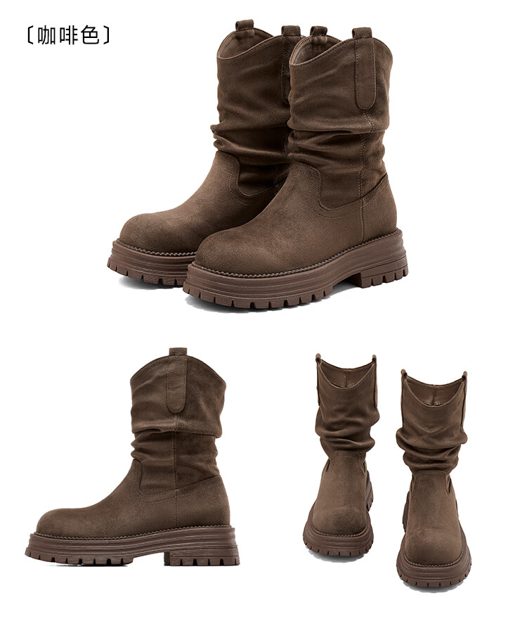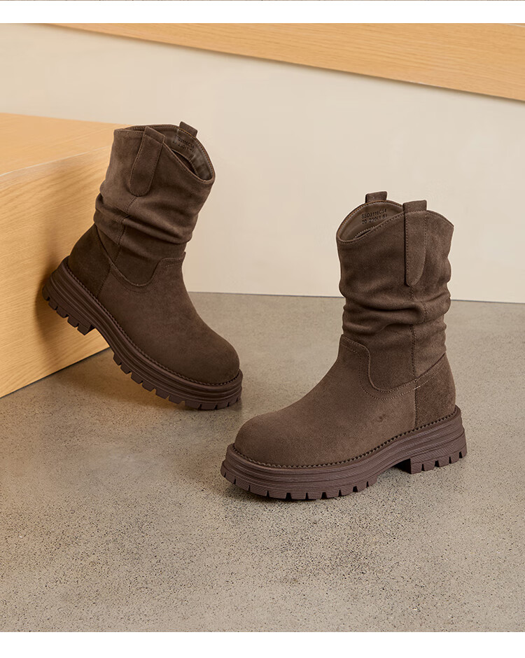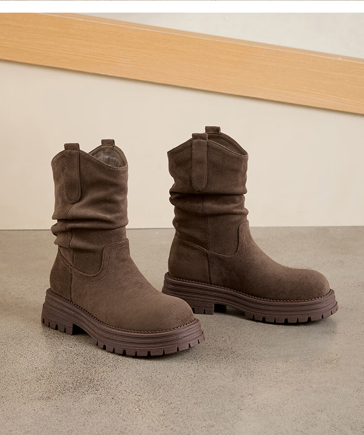 星期六美拉德短靴女款2025秋冬复古简约时装靴新款百搭粗跟绒面堆堆短靴 咖啡色【加绒款】 36