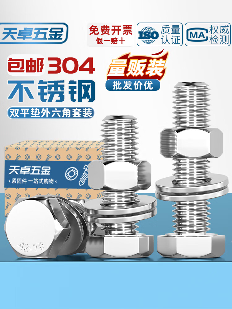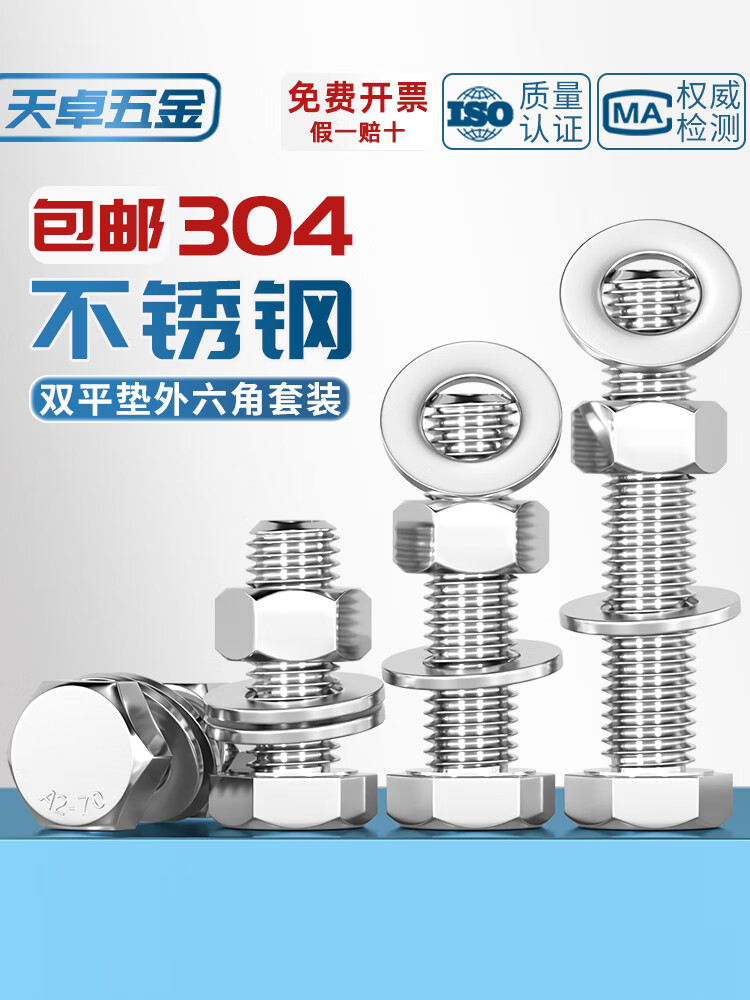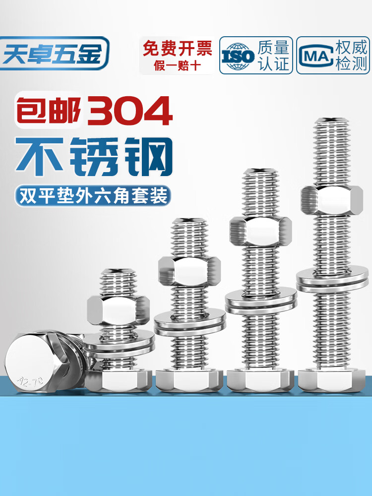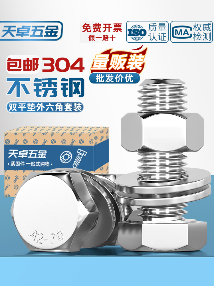 天卓五金304不锈钢外六角螺丝螺母套装大全配件双平垫螺栓加长螺杆M3-M20 M6*30【20套】