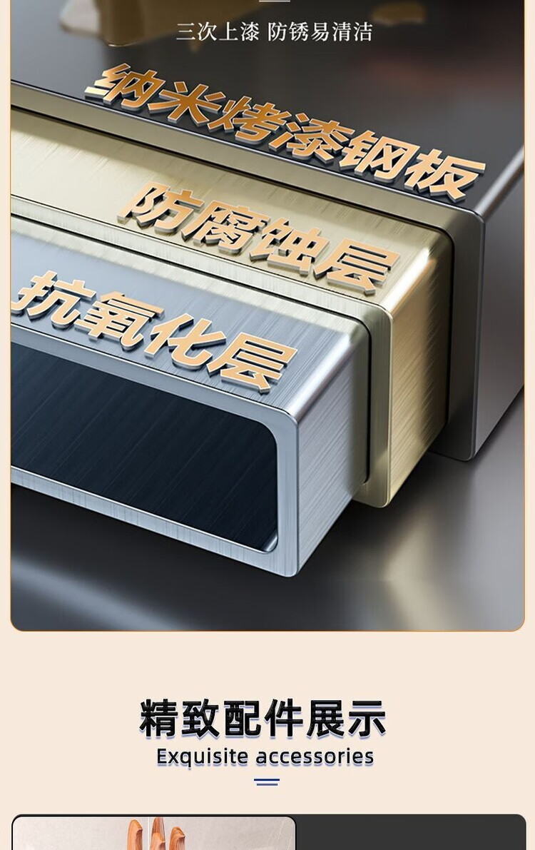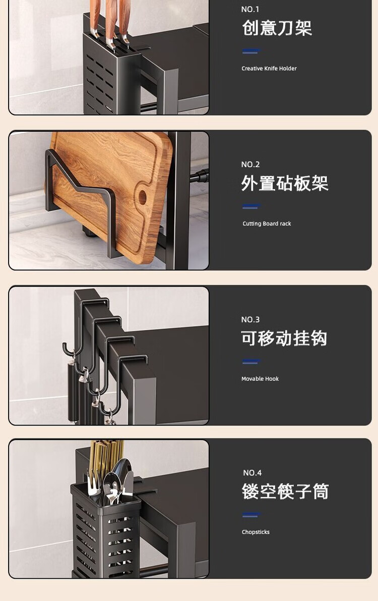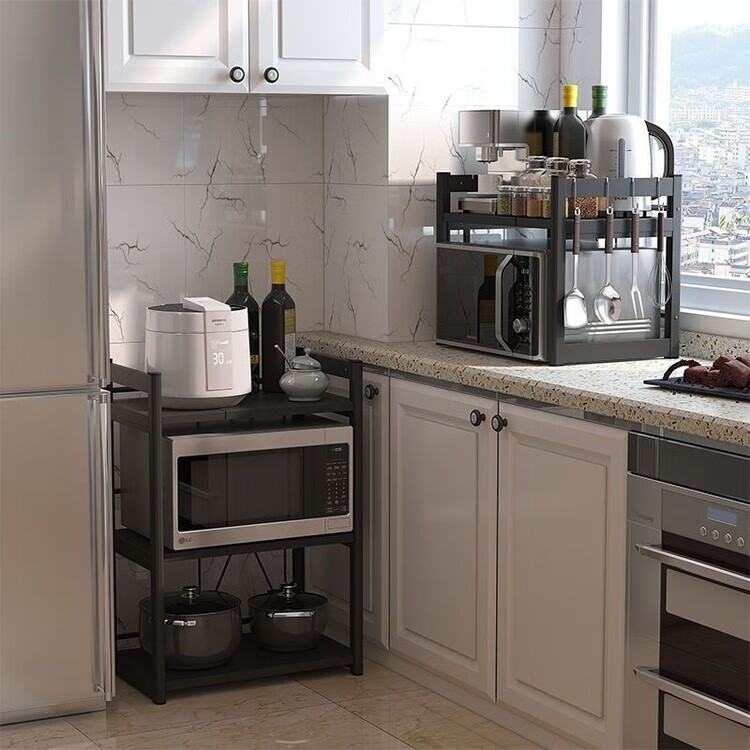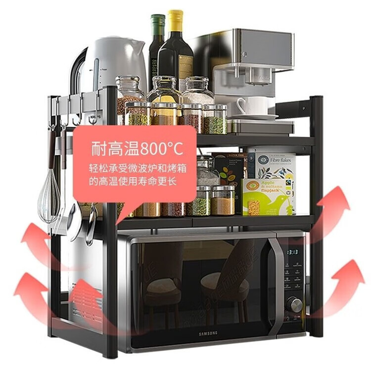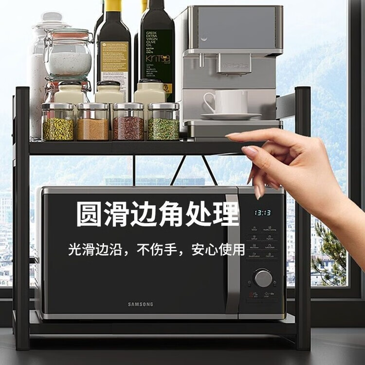 简漾加厚台面厨房微波炉置物架可伸缩桌面多层电饭煲烤箱家用收纳神器 黑色【可伸缩单层】6个挂钩