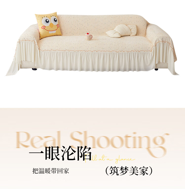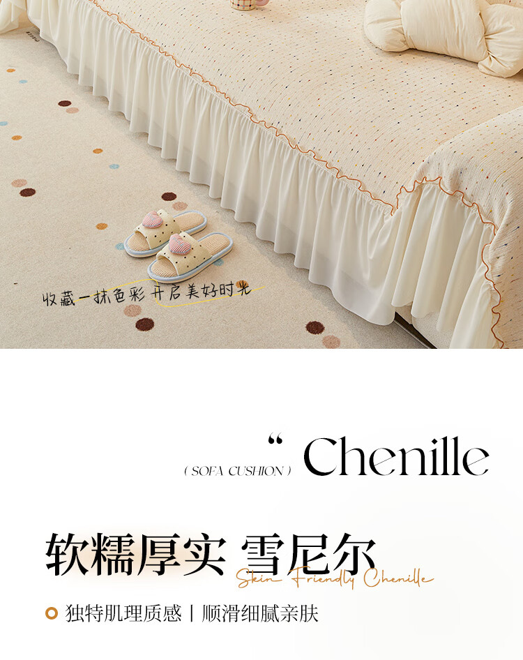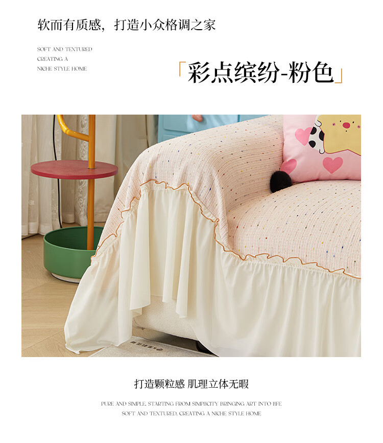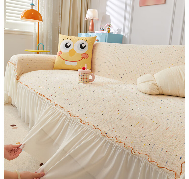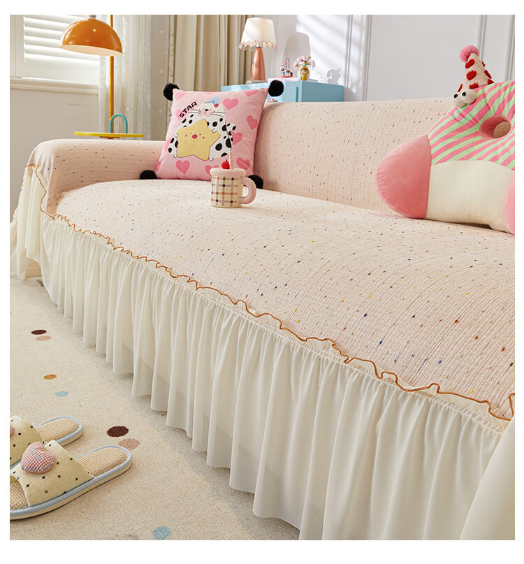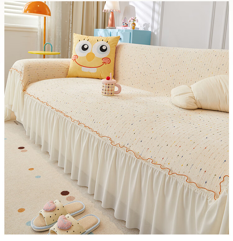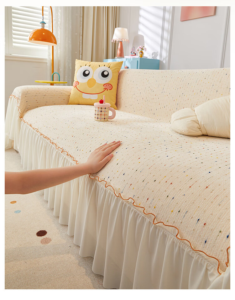 金拾美月多巴胺奶油风沙发盖布巾防猫抓不粘毛2025新款沙发垫套四季通用 彩点缤纷裙边-米白 180cm*130cm (适用于单人位/脚踏)