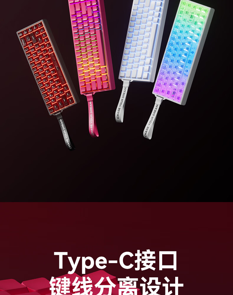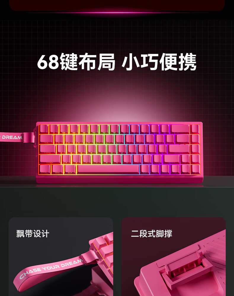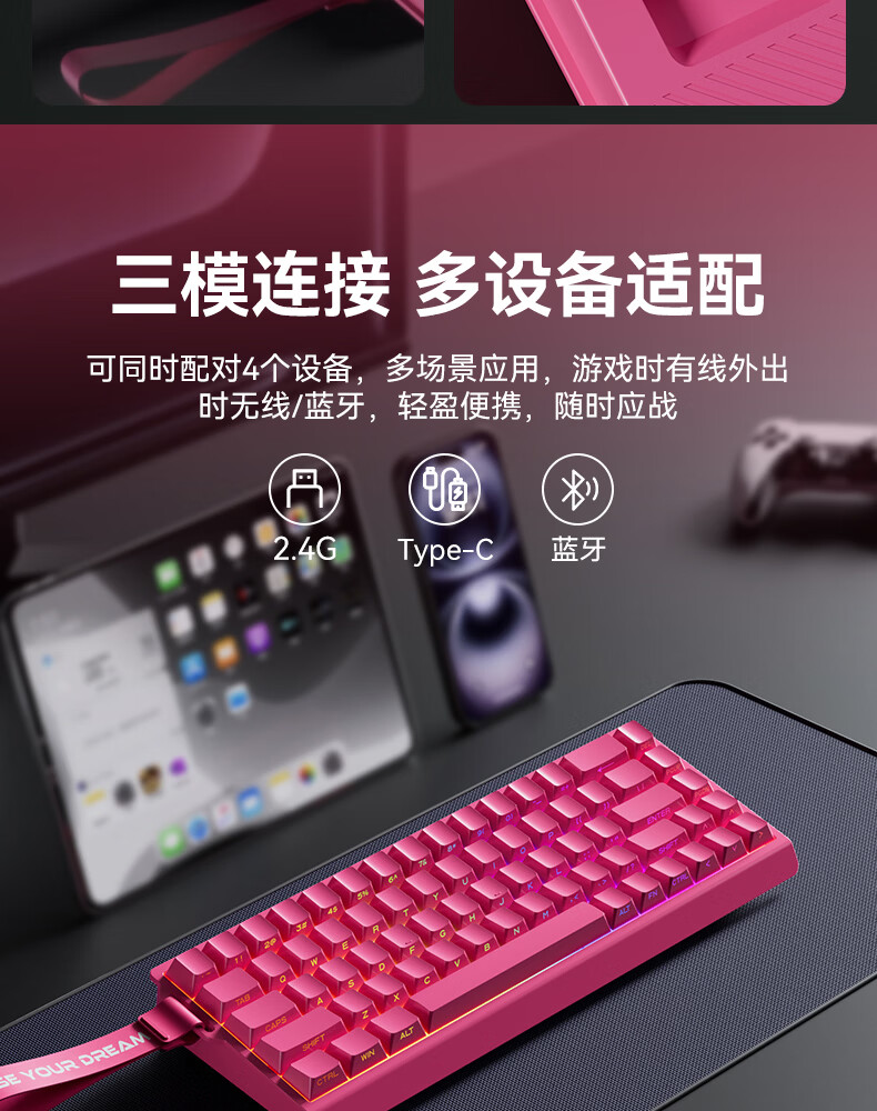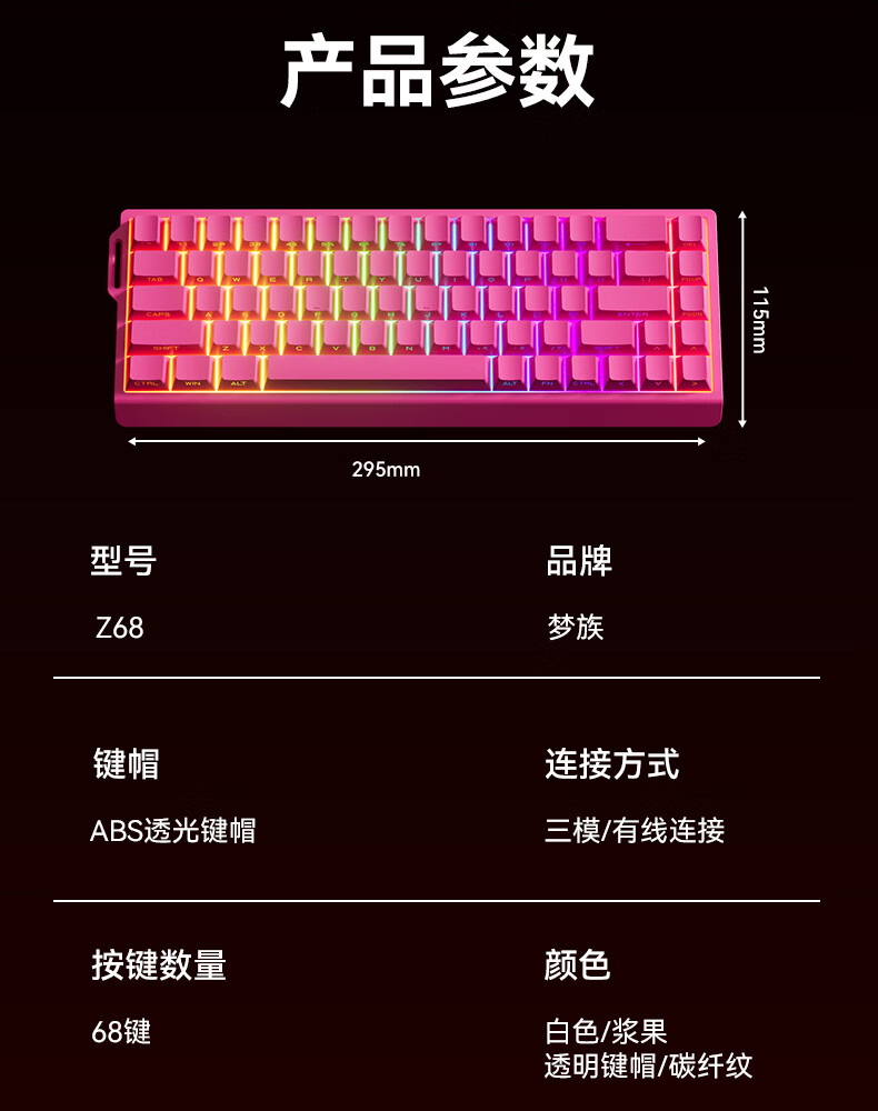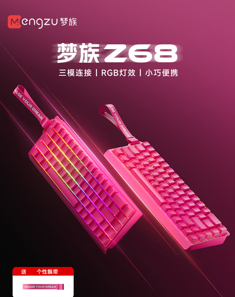 梦族【新品】Z68无线键盘有线蓝牙三模静音办公机械手感电竞游戏便携电脑笔记本薄膜键盘平板iPad专用 【浆果晶红】单键盘-无线三模