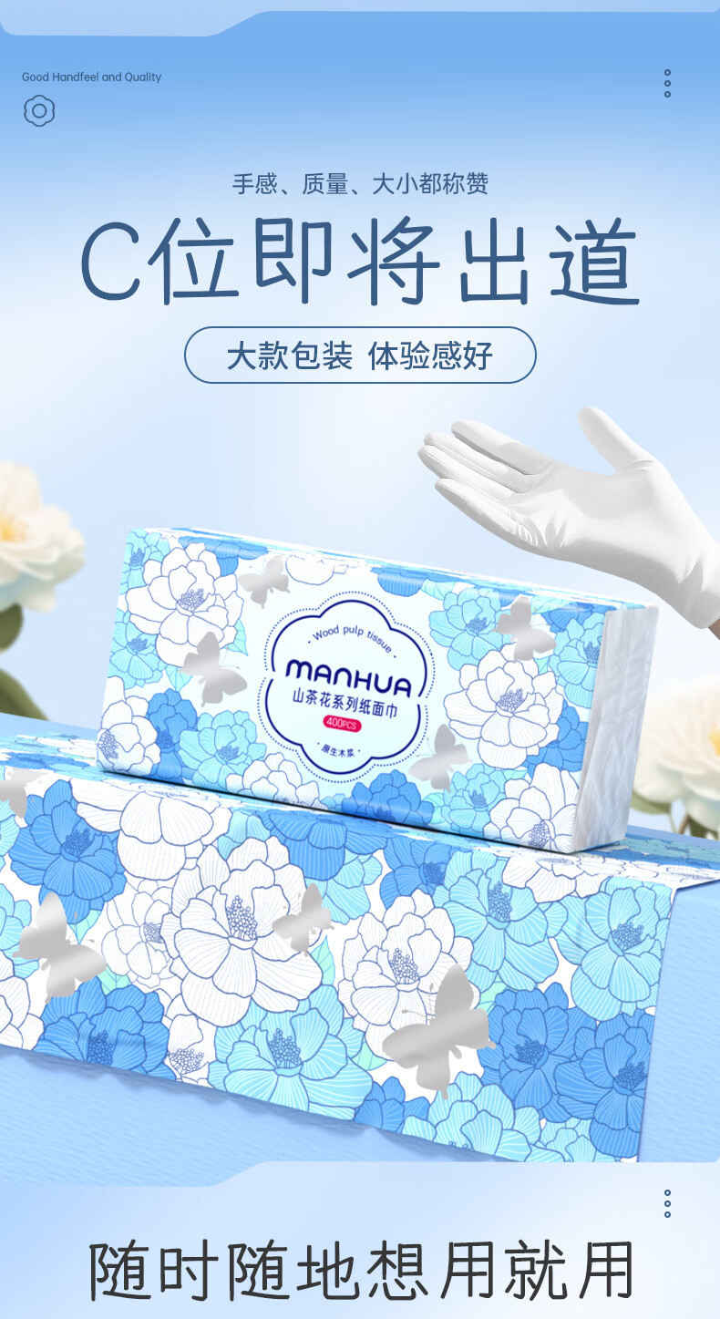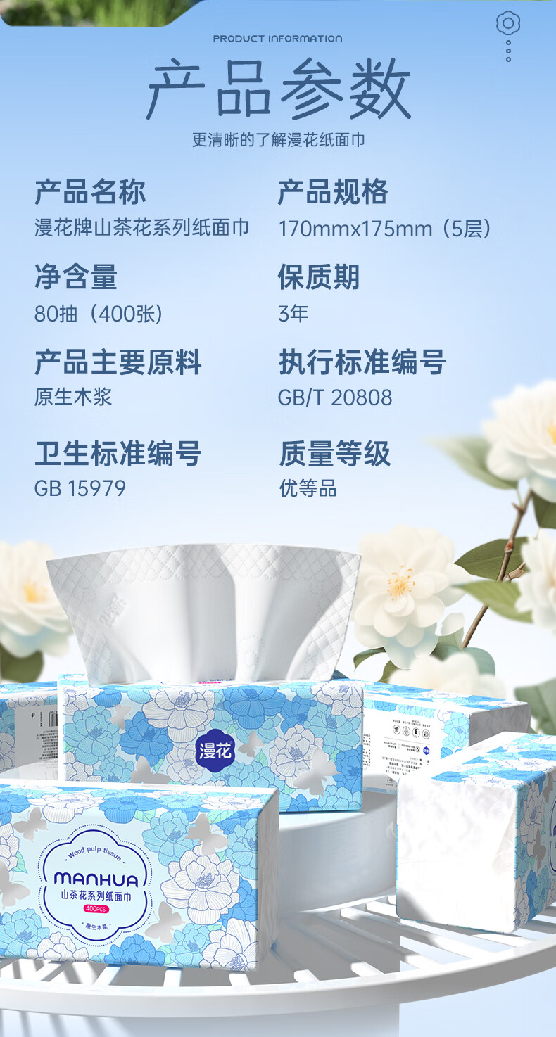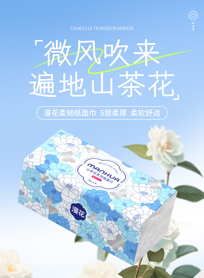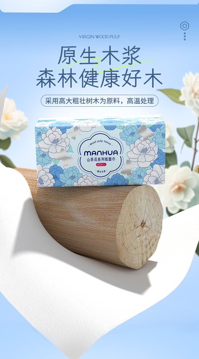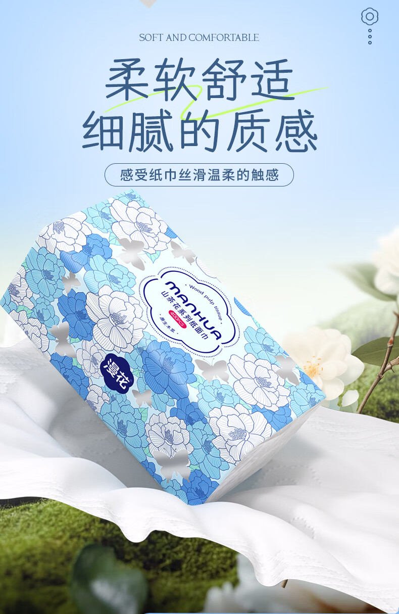 漫花山茶花大包抽纸纸巾大尺寸餐巾纸面巾纸擦手家用卫生纸原木纸抽纸 山茶花抽纸 5层 400张*18包