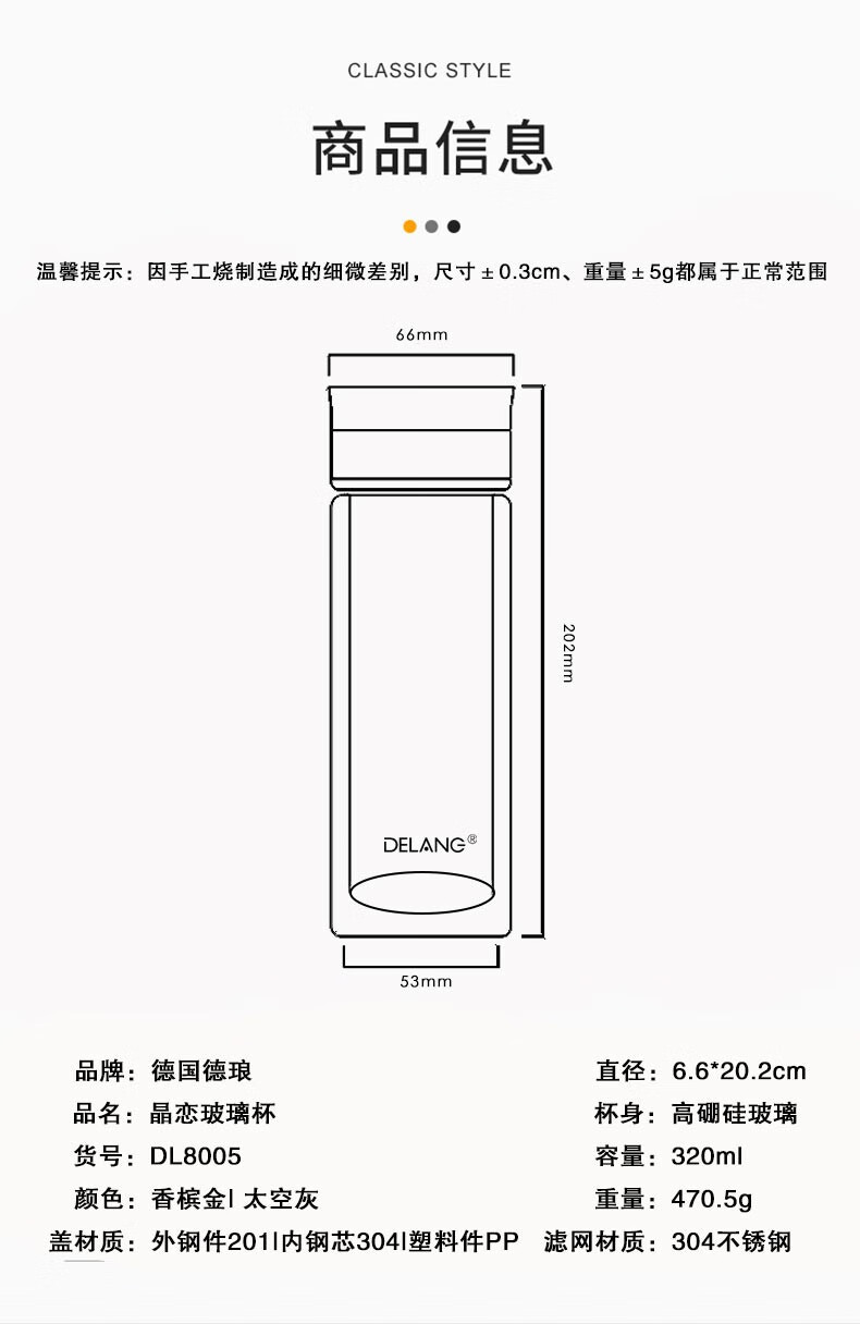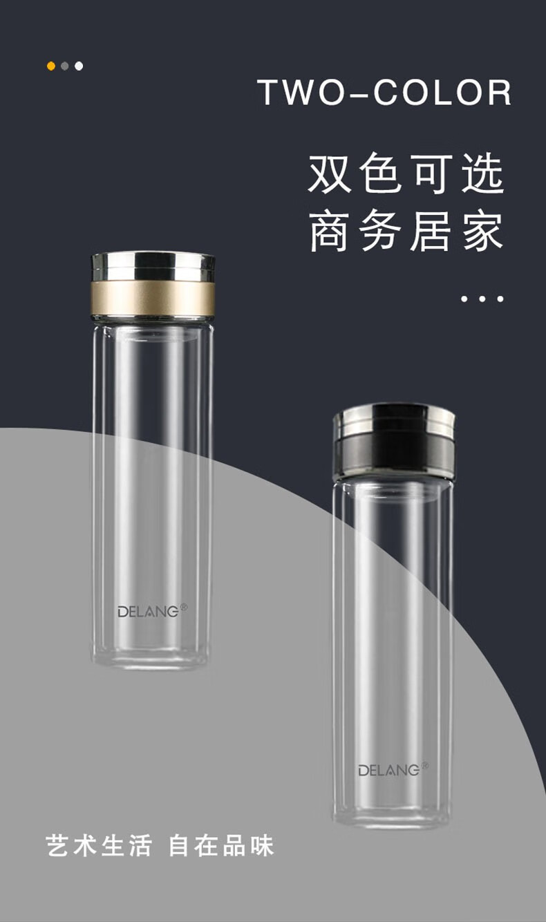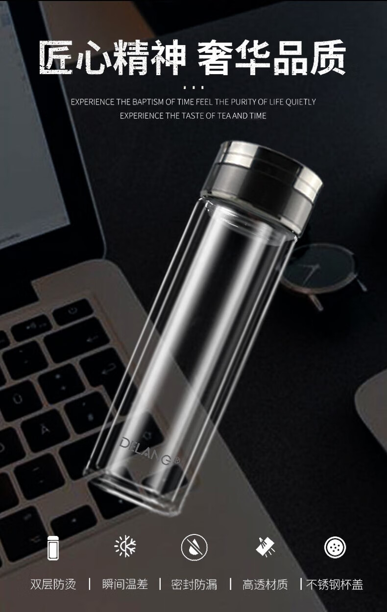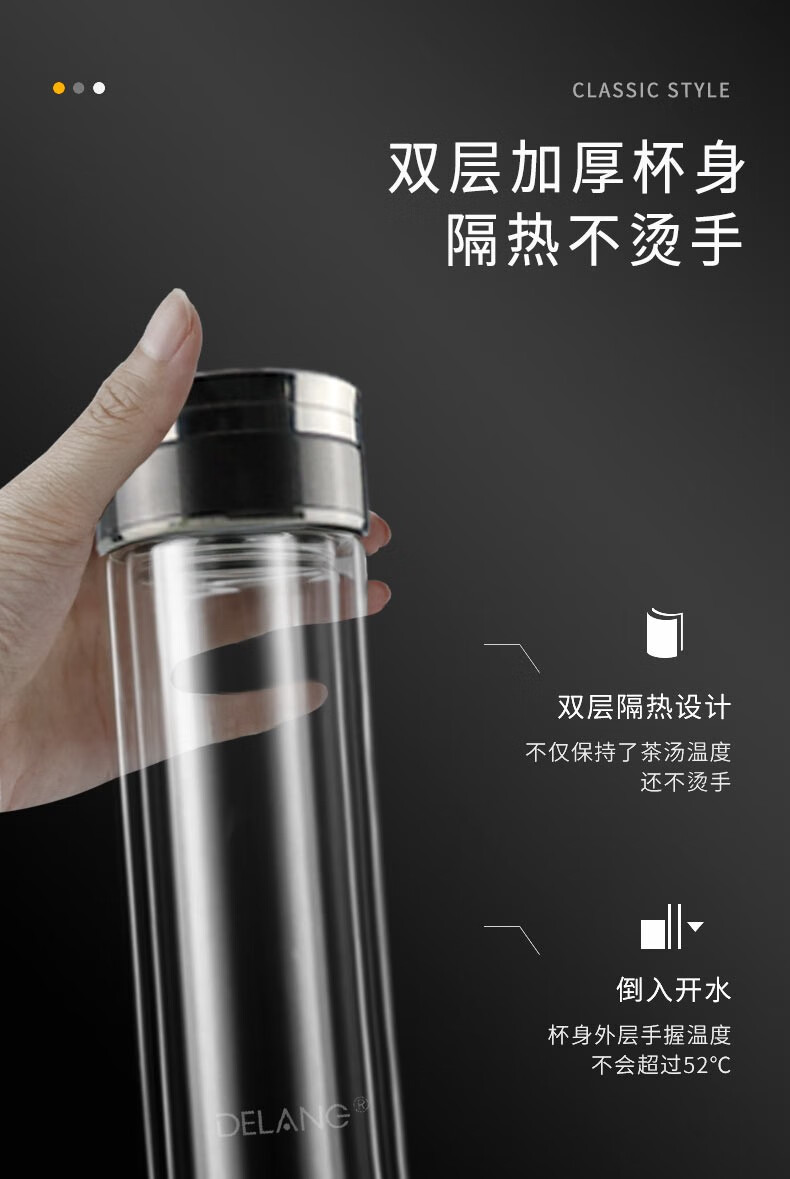 德琅(DELANG)德国品牌双层玻璃杯DL8005商务茶水分离杯320ml便携水杯车载茶隔 太空灰