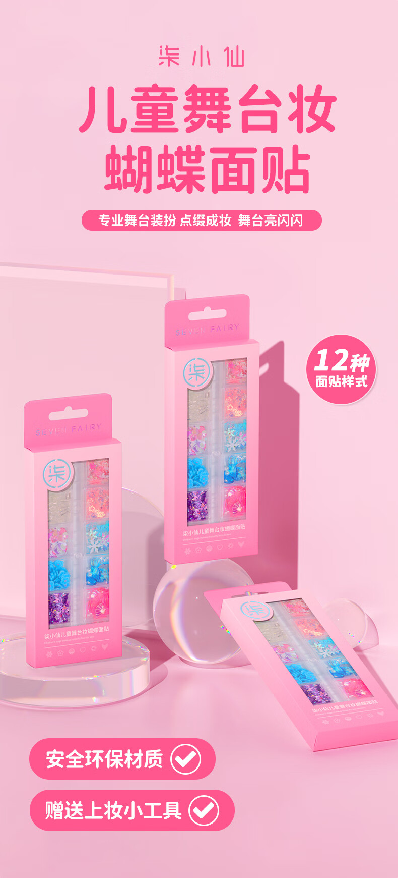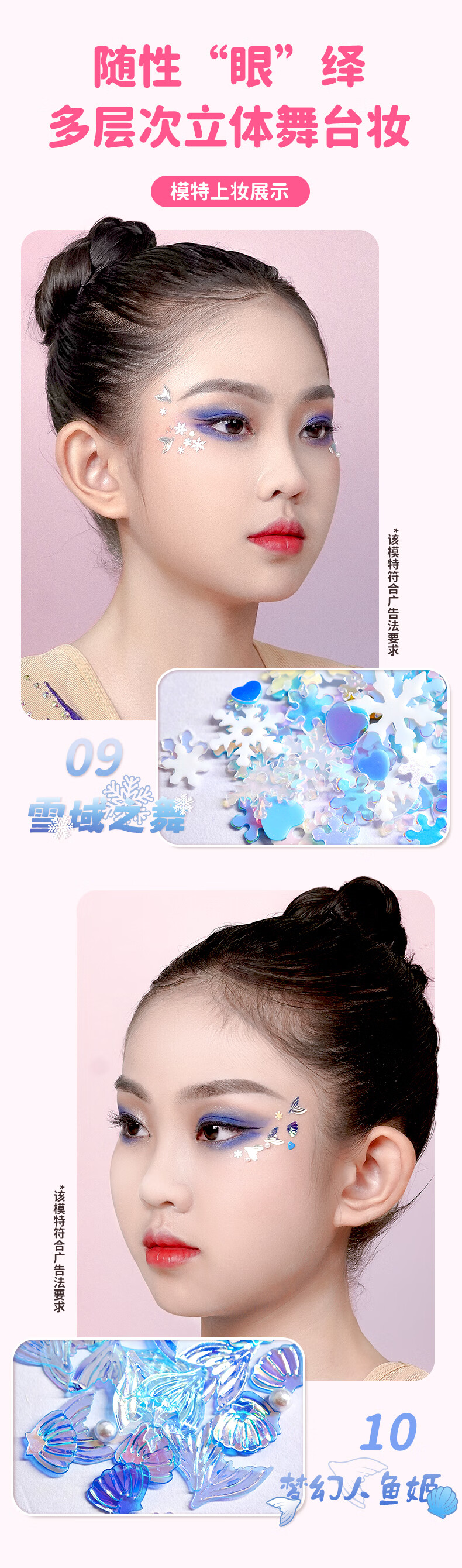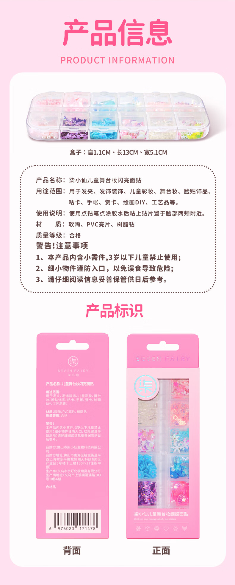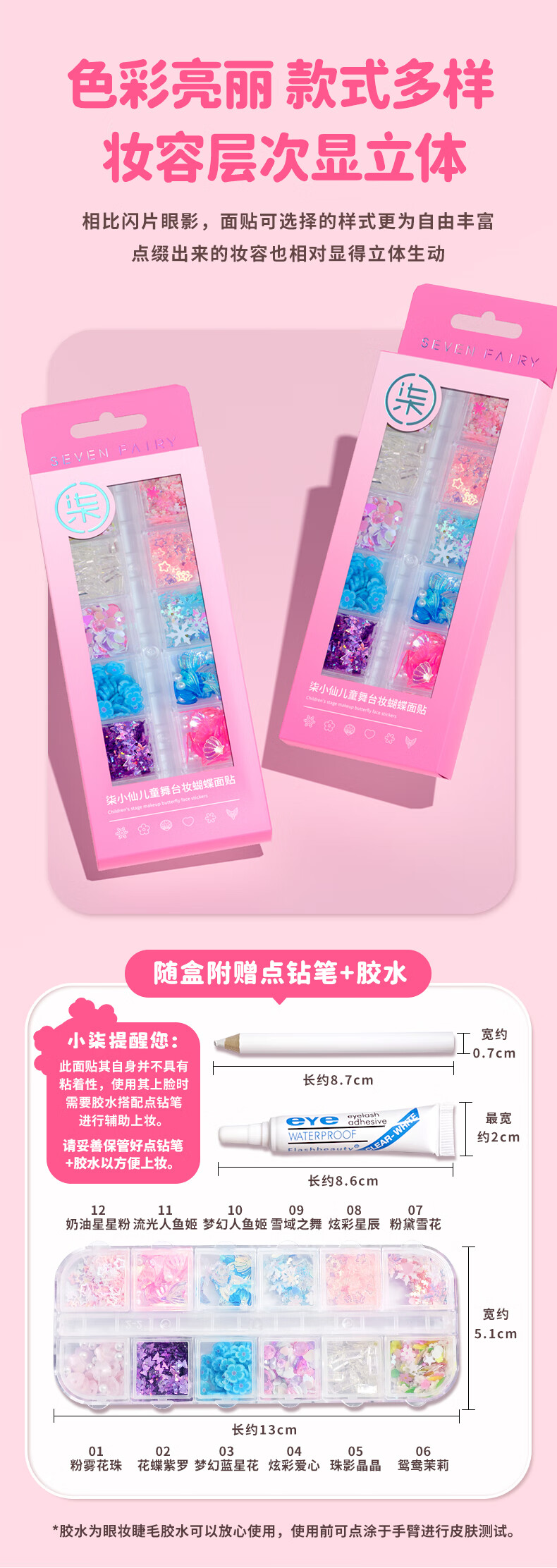 柒小仙 儿童亮片眼影面贴 青少年学生舞台妆演出珠光闪粉钻石金葱亮 12色闪彩蝴蝶面贴(实付满199顺丰包邮)