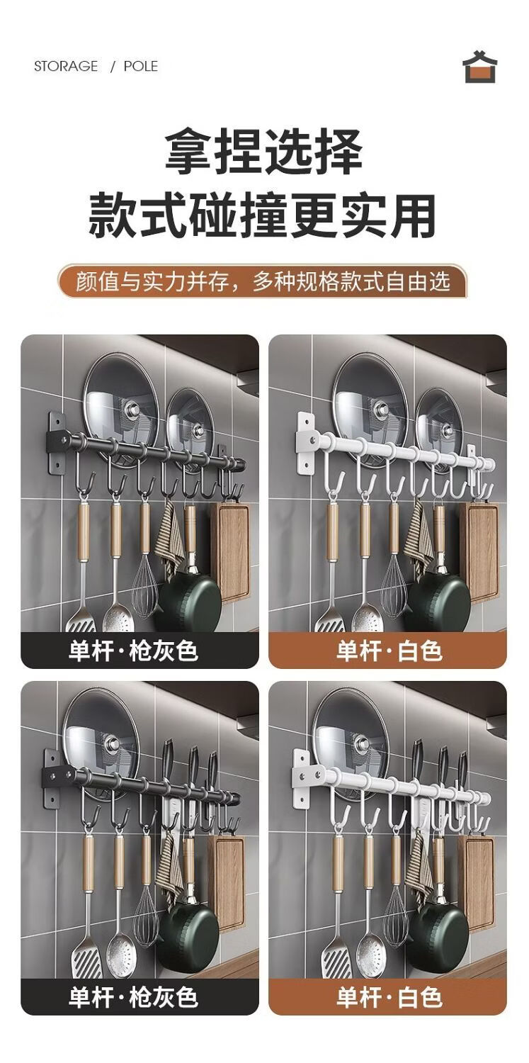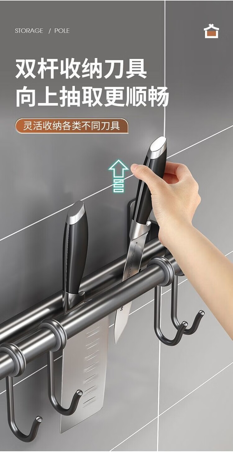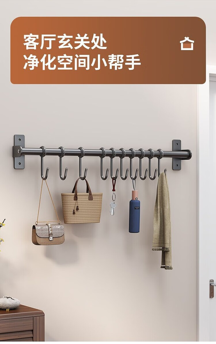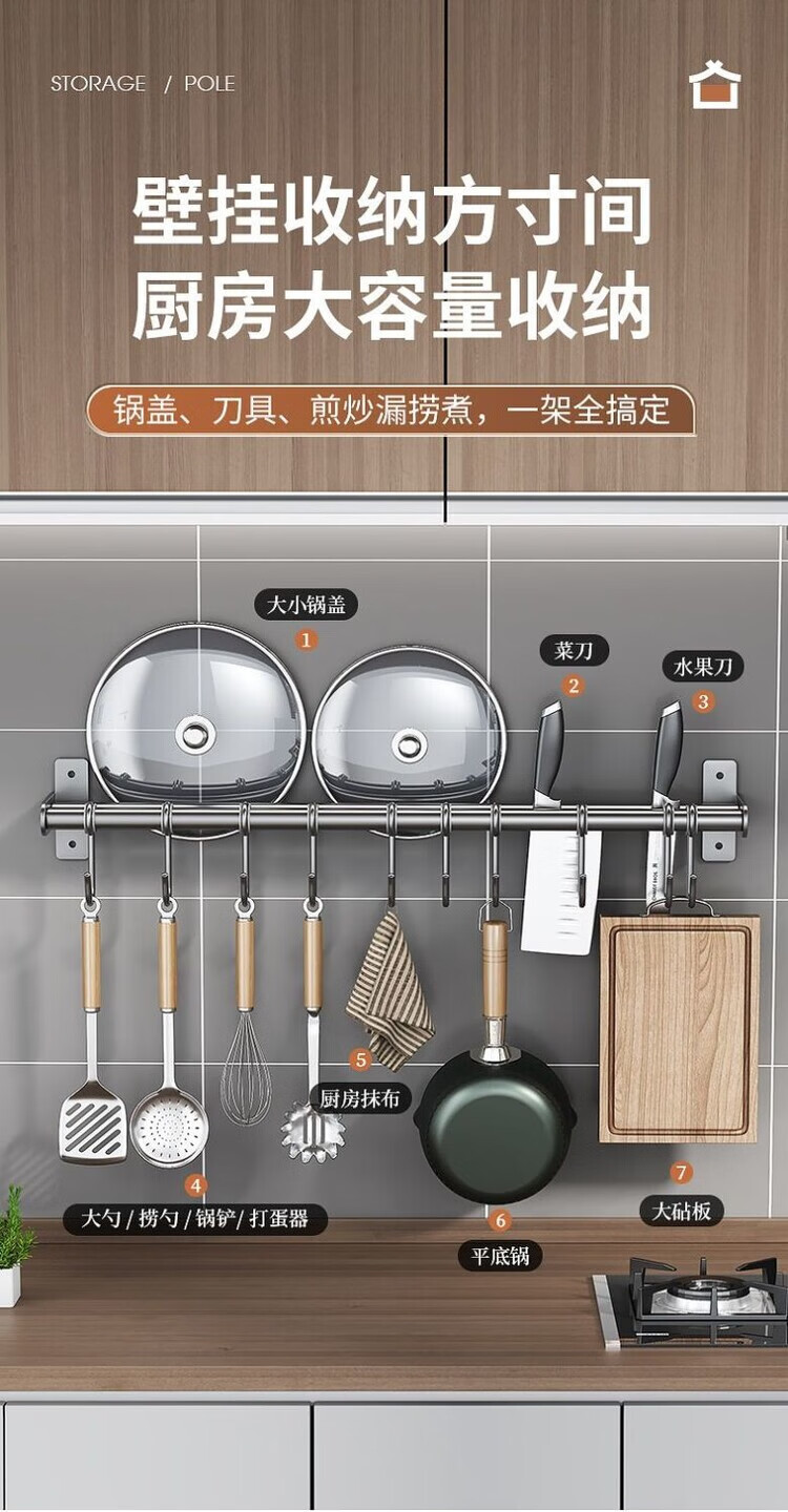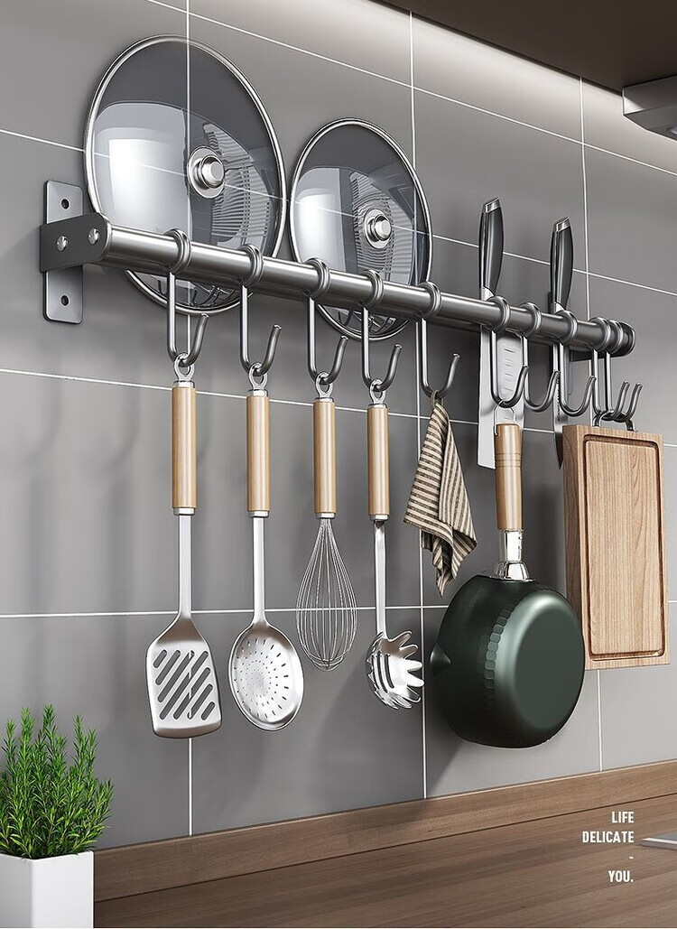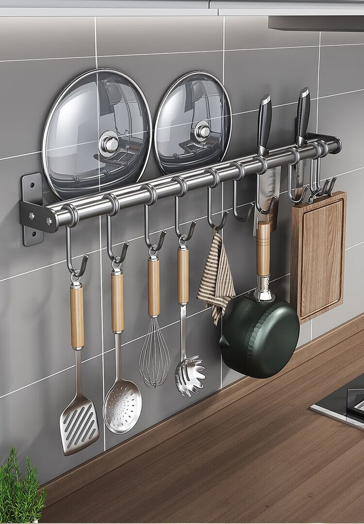 简漾厨房不锈钢多功能壁挂置物架免打孔挂钩挂架挂杆锅盖锅铲收纳刀架 亮光单杆【不可插刀】 30cm带4钩