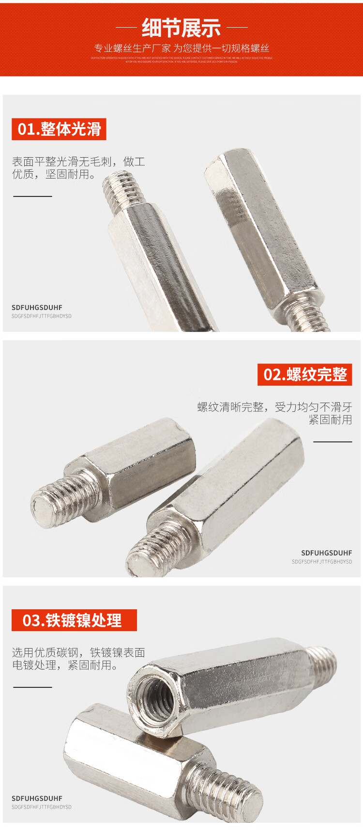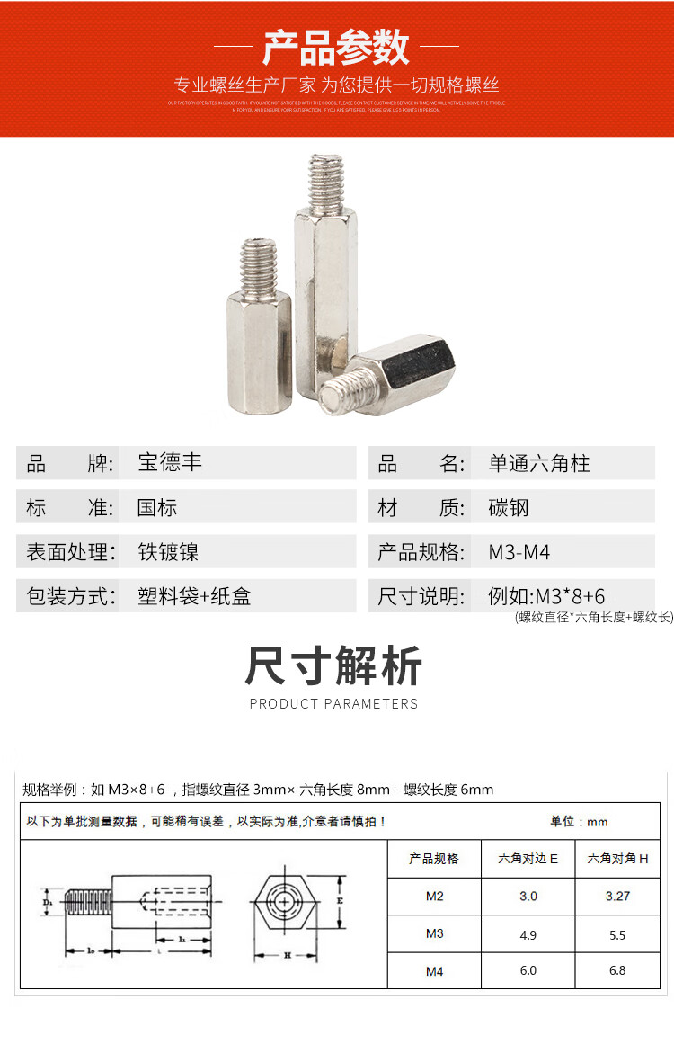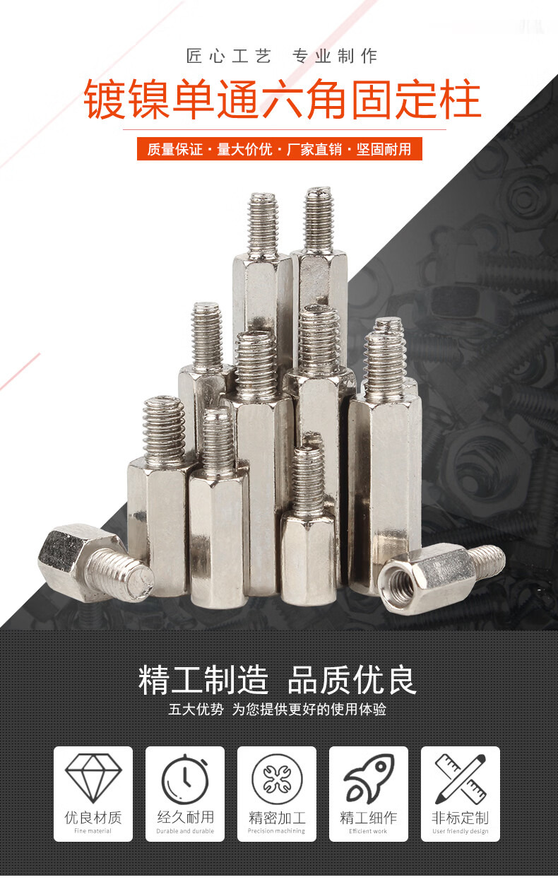 宝德丰镀镍单头六角螺柱连接柱单通六角隔离柱主板支撑柱内外牙螺柱 M3X5+6[100只]