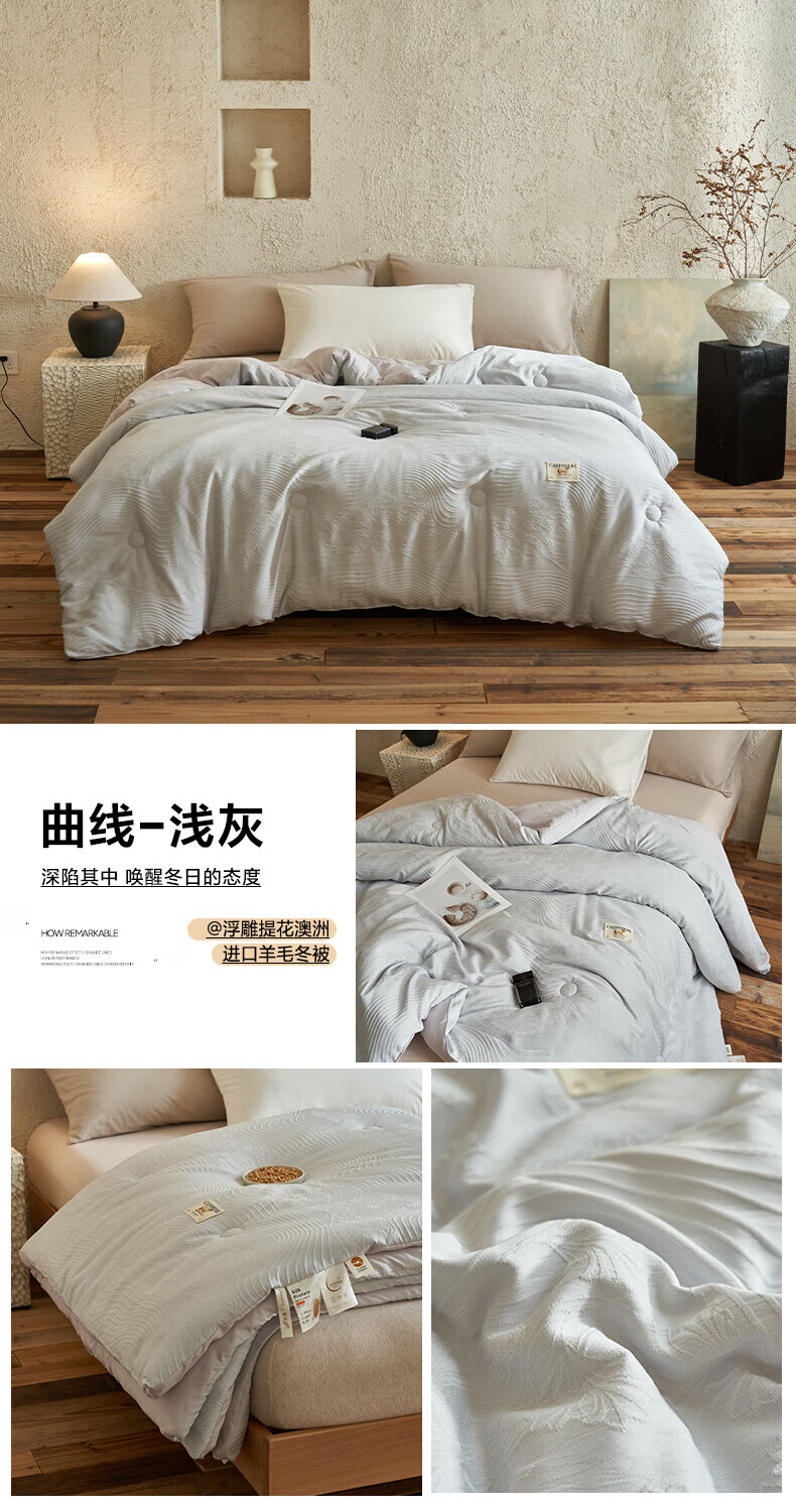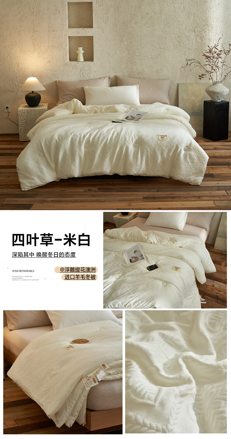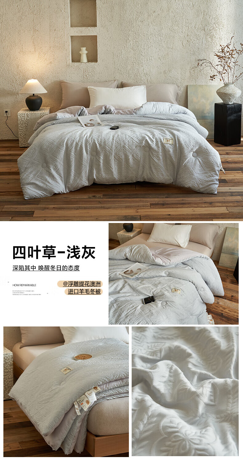 恒源祥澳洲进口羊毛被浮雕提花被子被芯冬季加厚8斤冬被单人春秋空调被 四叶草-浅灰 200*230cm【8斤冬被】