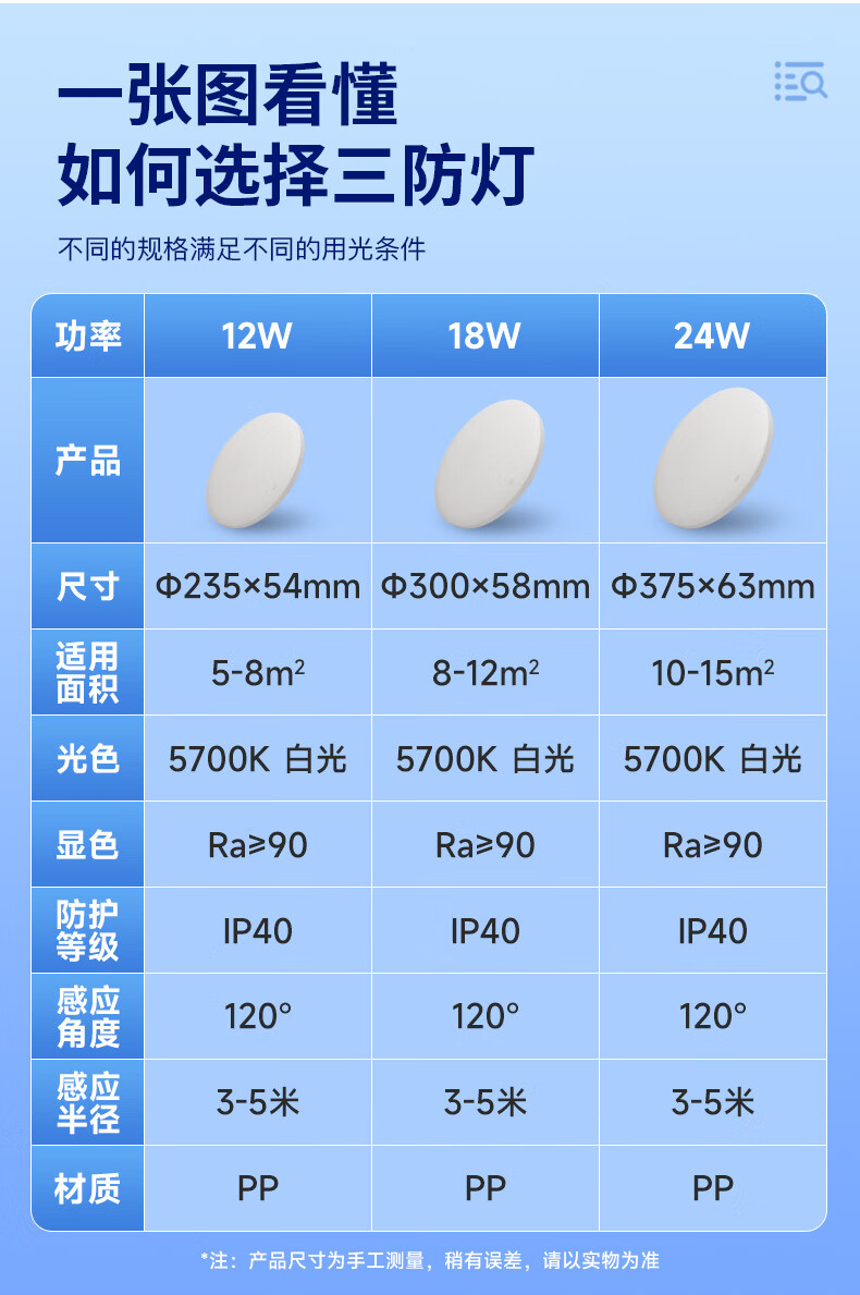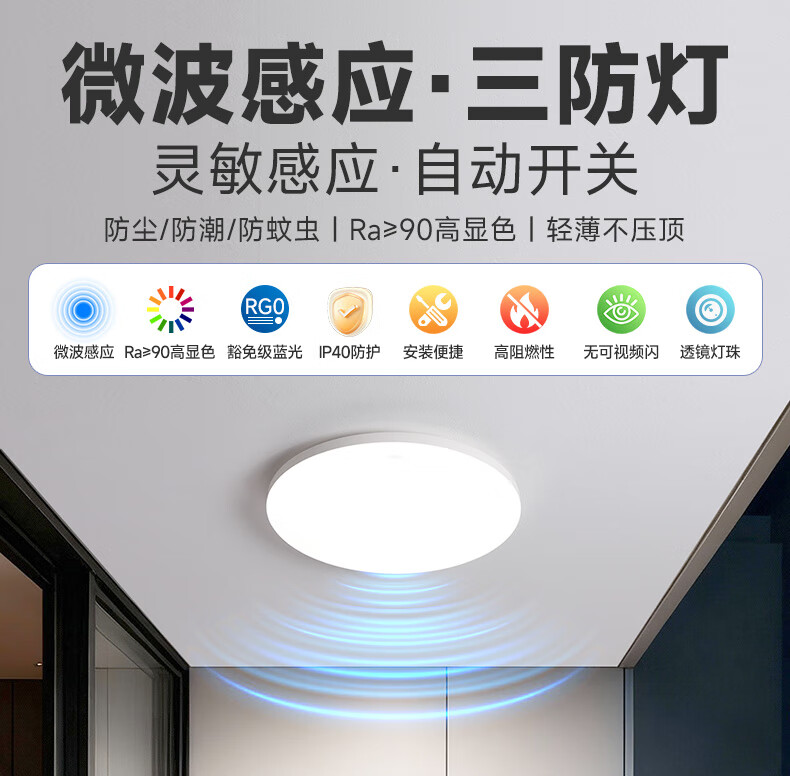 FSL佛山照明微波感应吸顶灯雷达感应LED三防灯阳台楼道车库感应灯 Ra90 三防微波 12W白光
