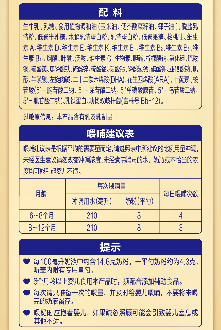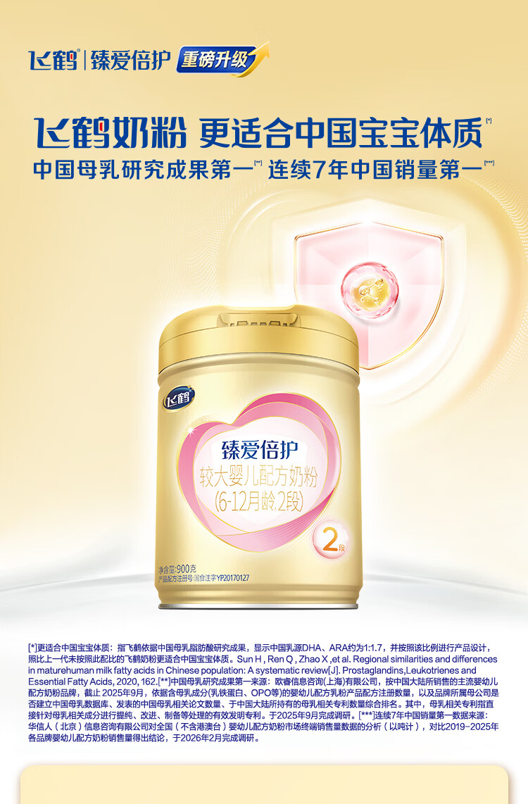 飞鹤臻爱倍护超级飞帆 婴幼儿配方奶粉 2段(6-12月)900g*6罐 乳铁蛋白