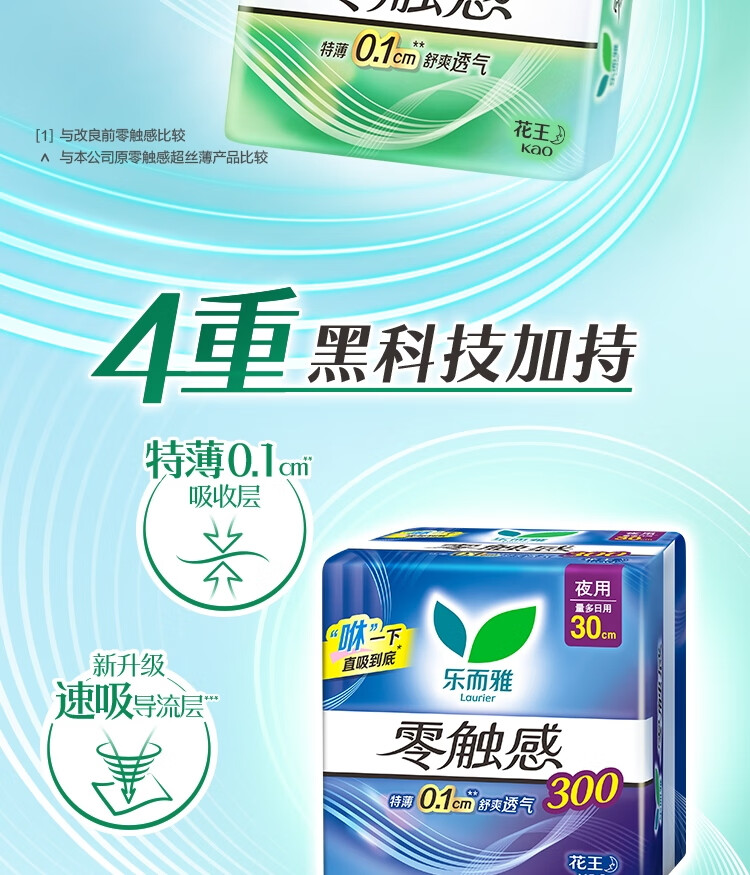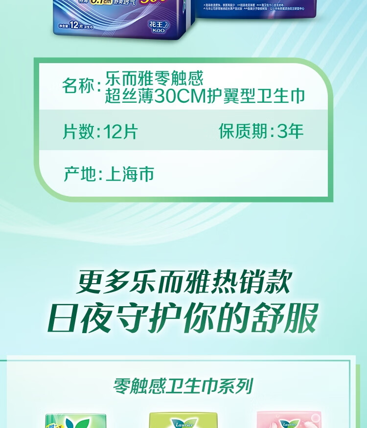 乐而雅花王【老爸抽检】零触感特薄夜用卫生巾30cm12片姨妈巾京东自营