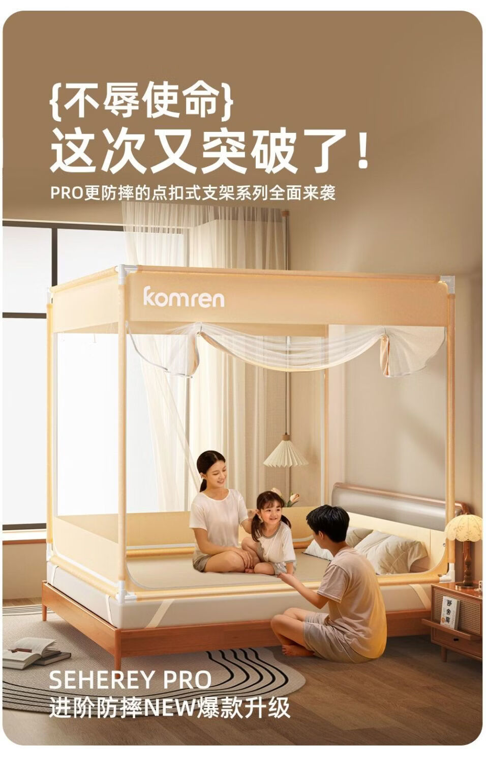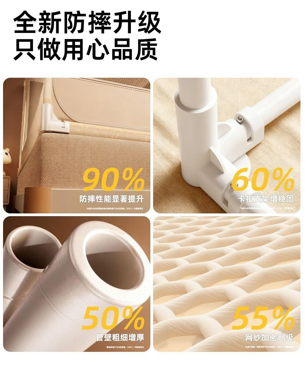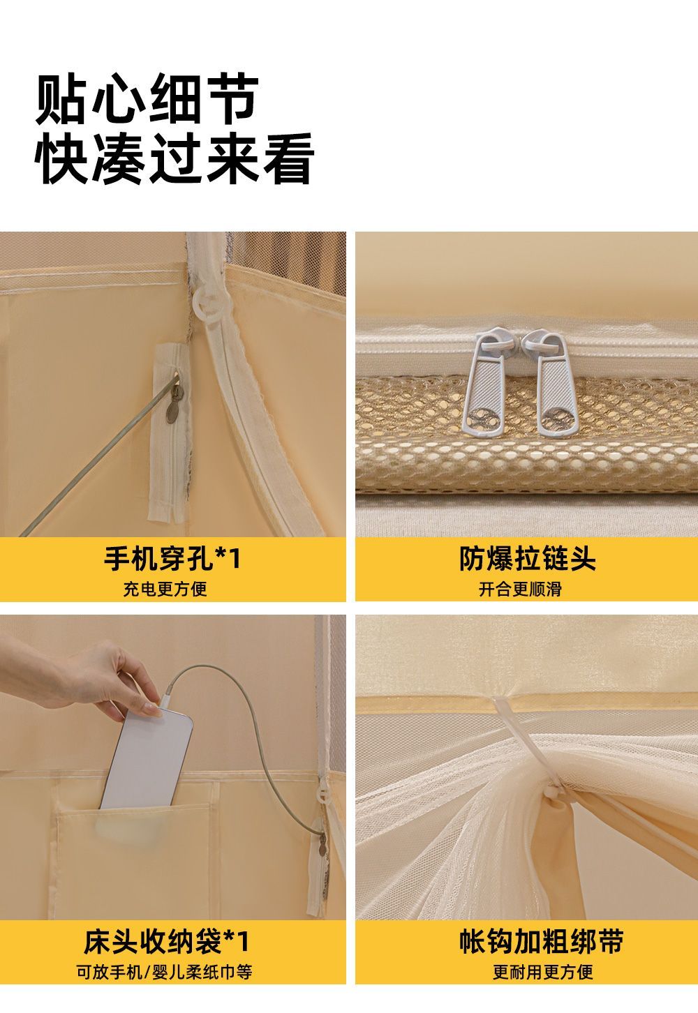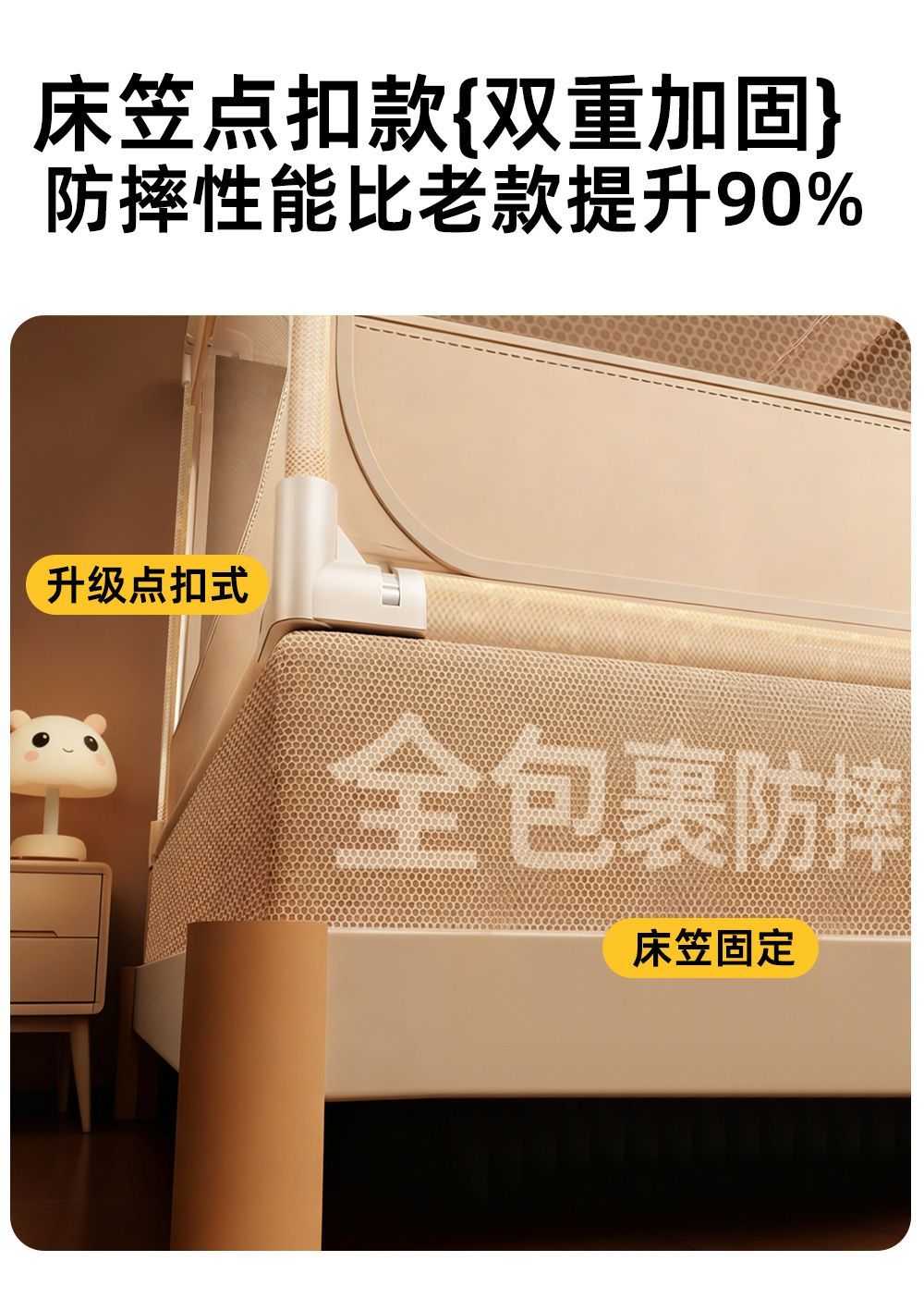 高睿A类卡扣防摔蚊帐家用2025新款卧室免安装儿童婴儿防掉床全底蚊帐 香槟米【全底款】A类抗菌帐纱大空间 宽2.0*长2.2m/升级点扣免拼接支架