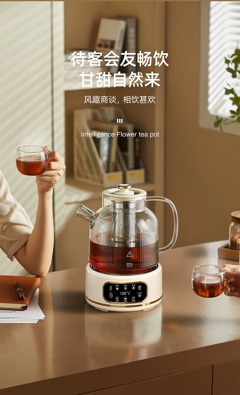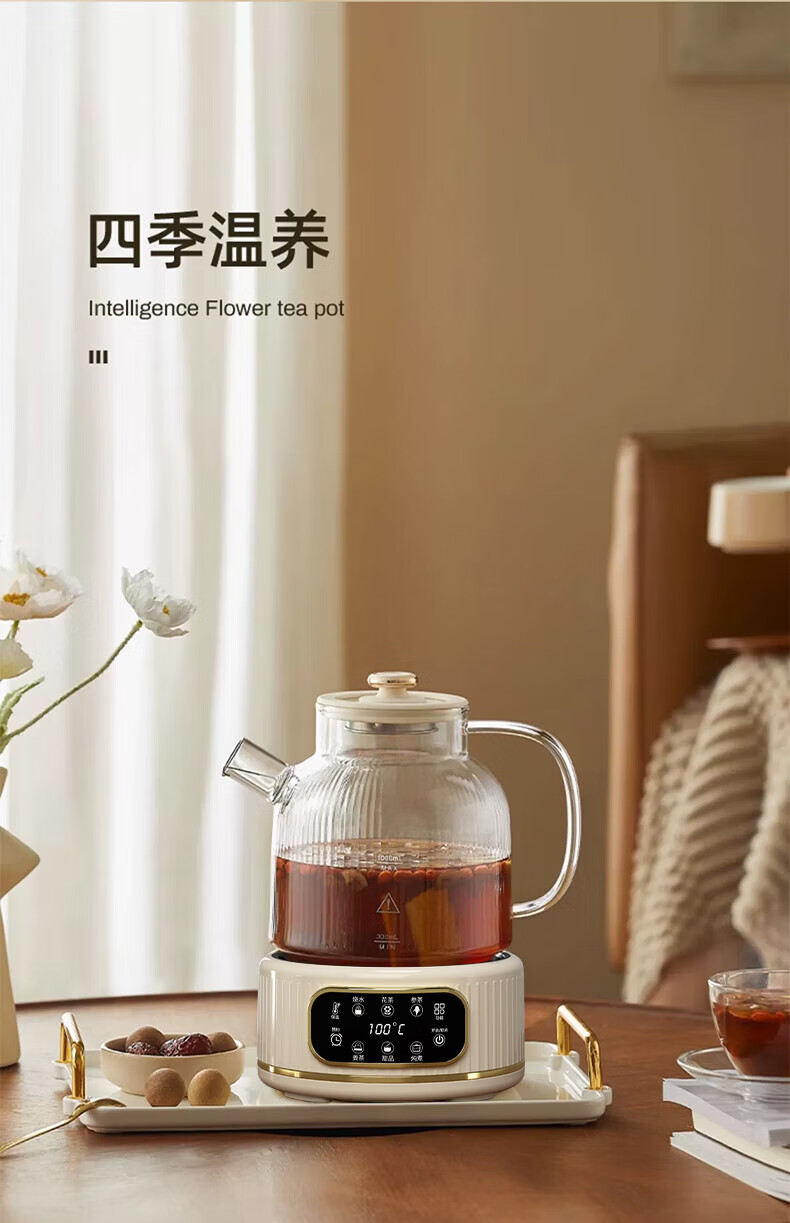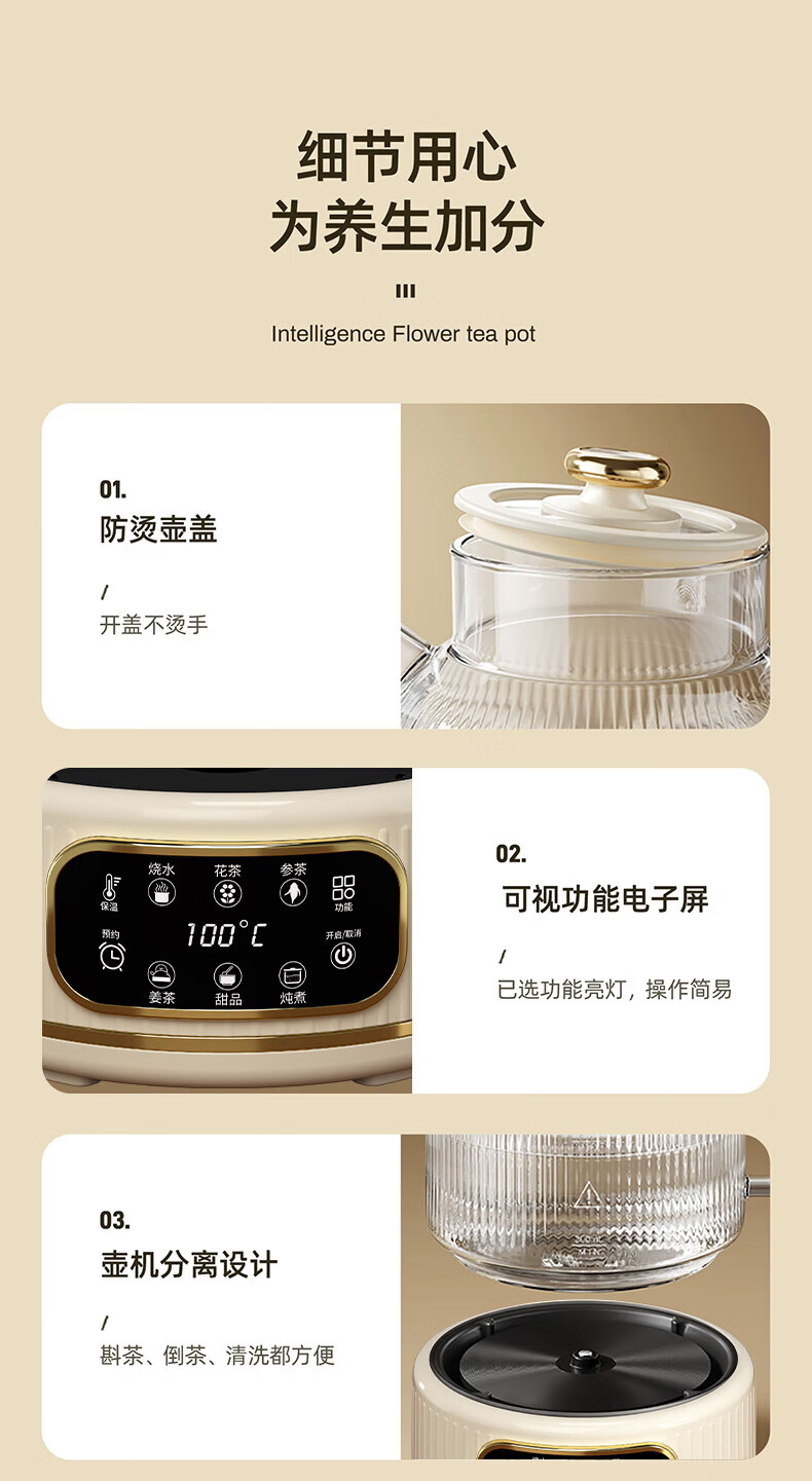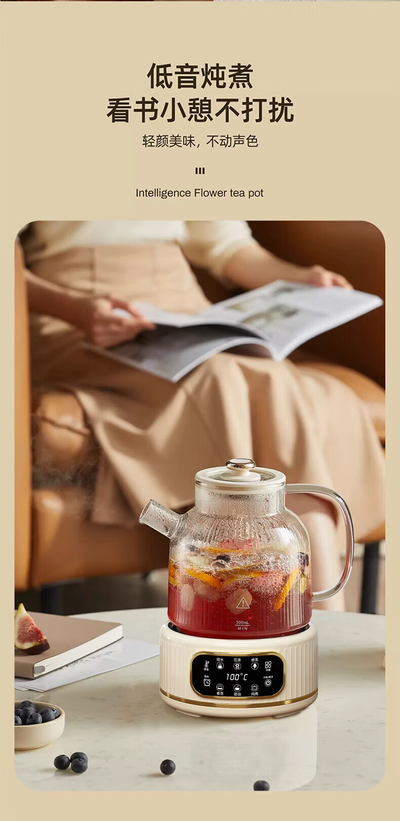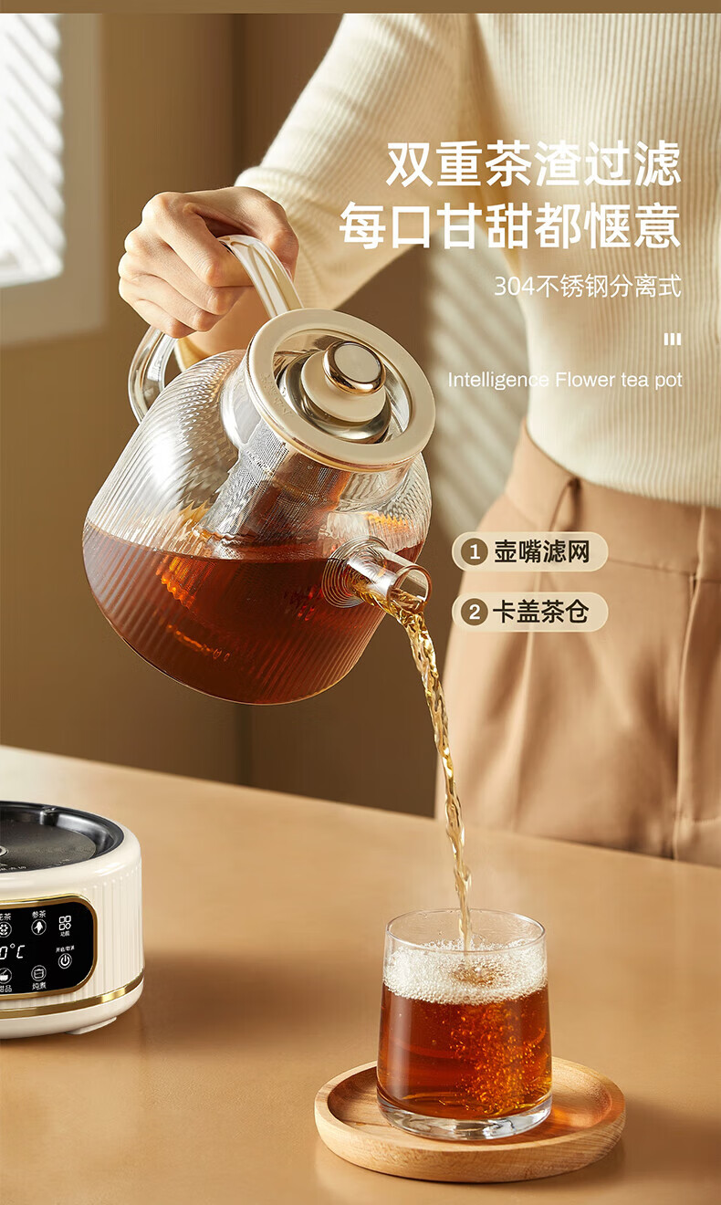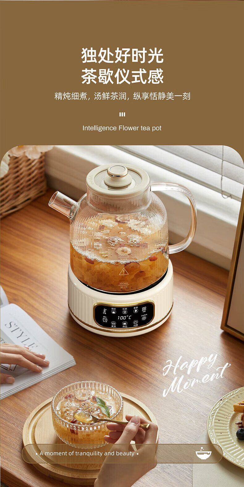 美的(Midea)同款德国养生壶全玻璃电热水壶办公室迷你煮茶器炖煮一体煮茶壶家用花茶壶小型恒温 奶白色 1.5L 无茶漏/12H恒温