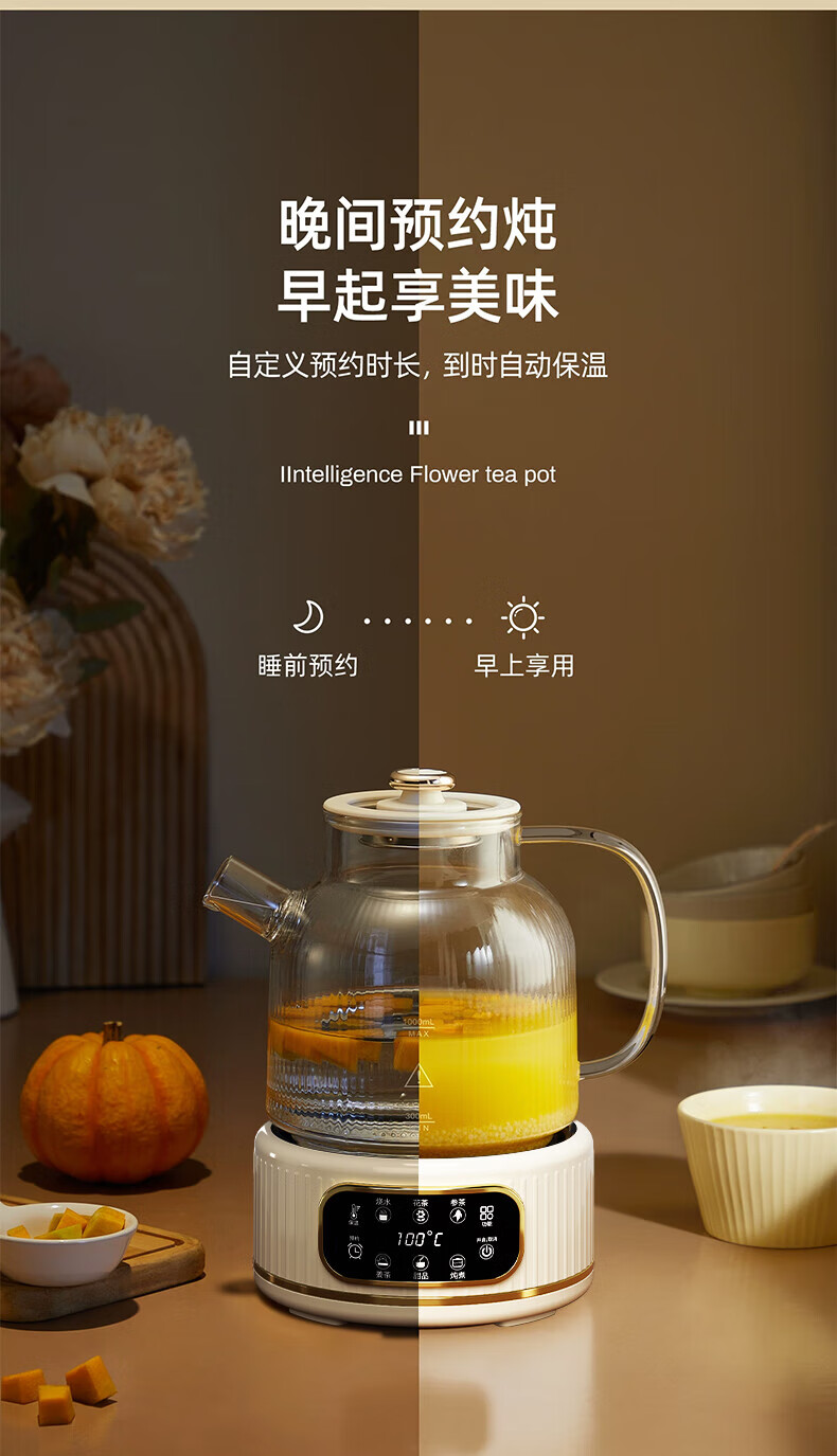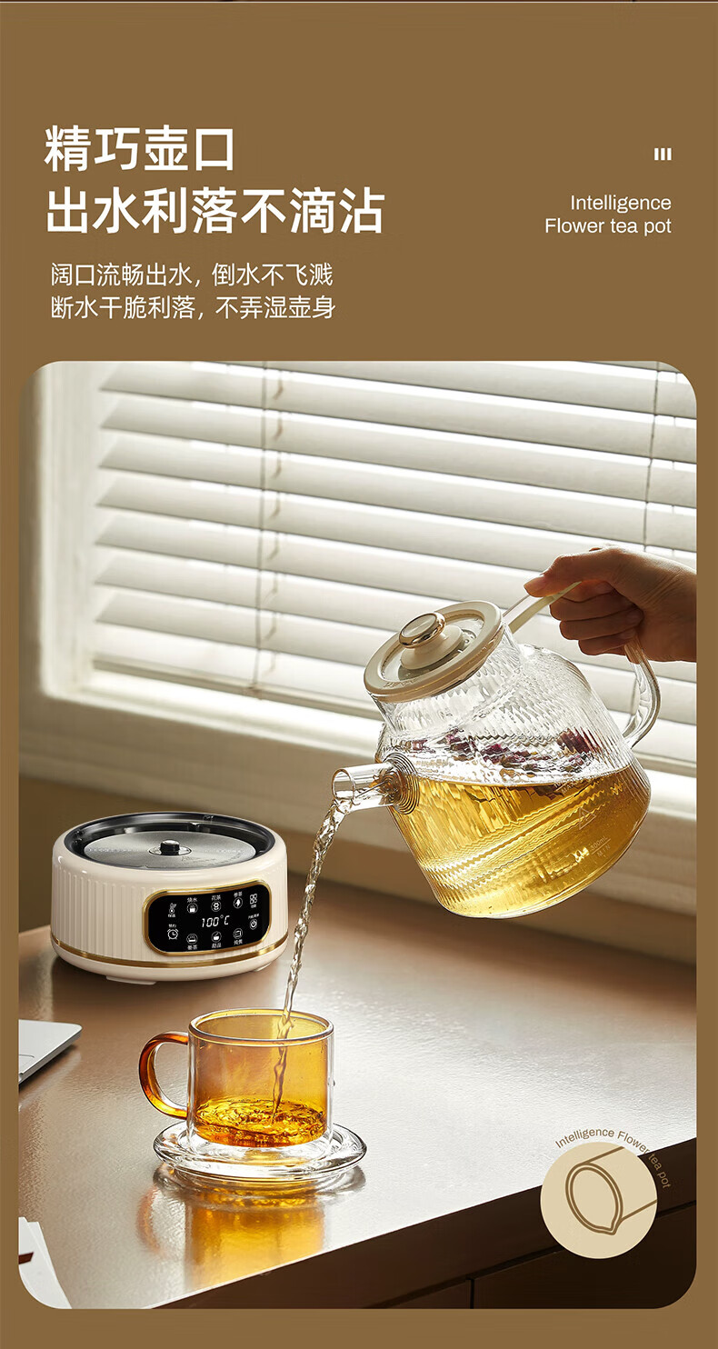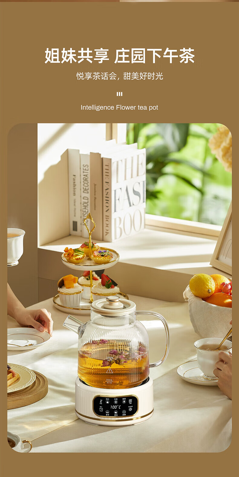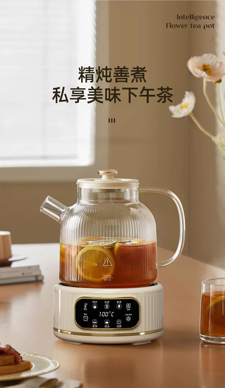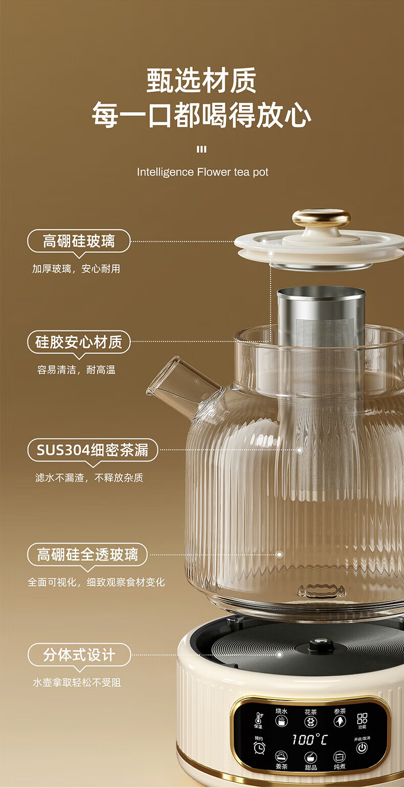 美的(Midea)同款德国养生壶全玻璃电热水壶办公室迷你煮茶器炖煮一体煮茶壶家用花茶壶小型恒温 奶白色 1.5L 无茶漏/12H恒温