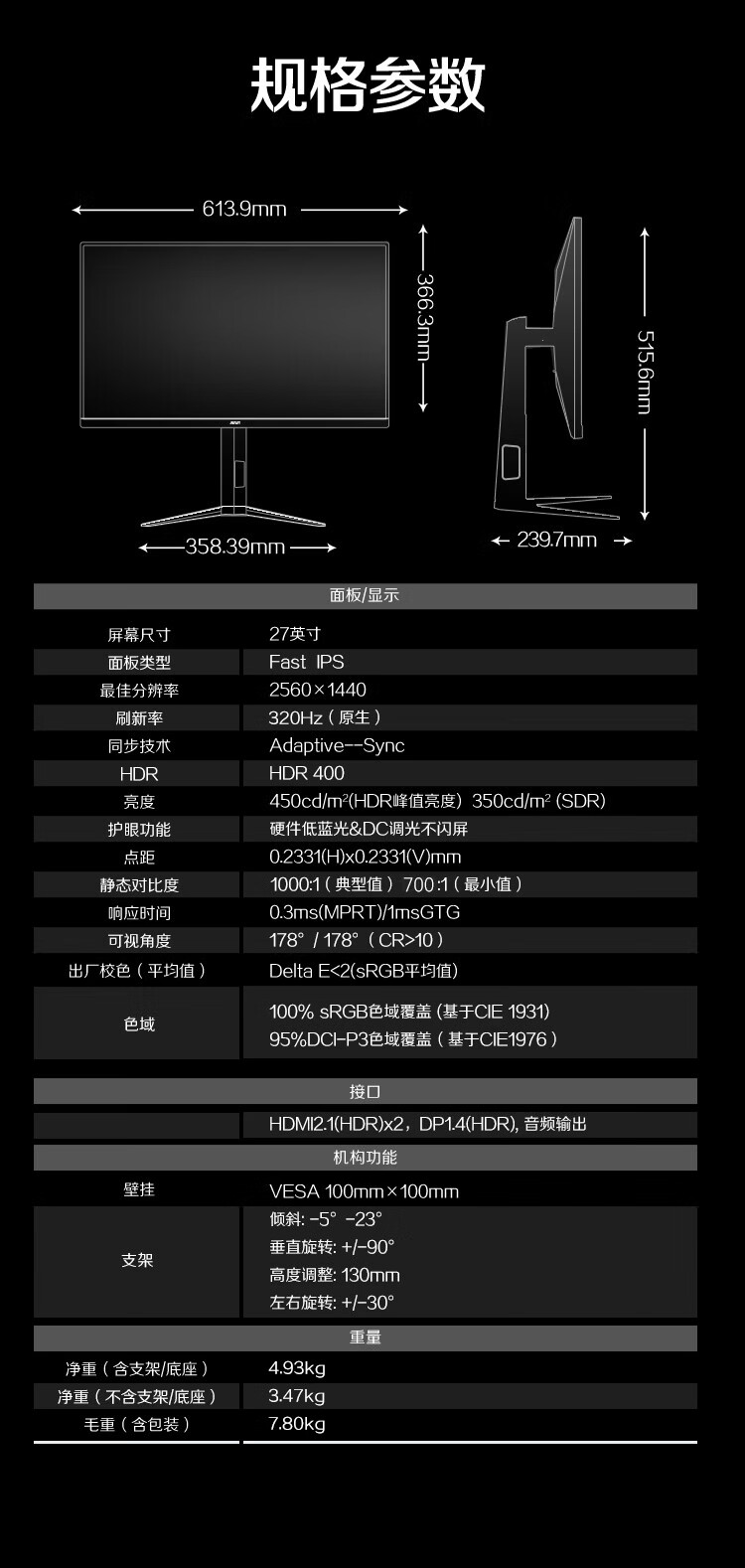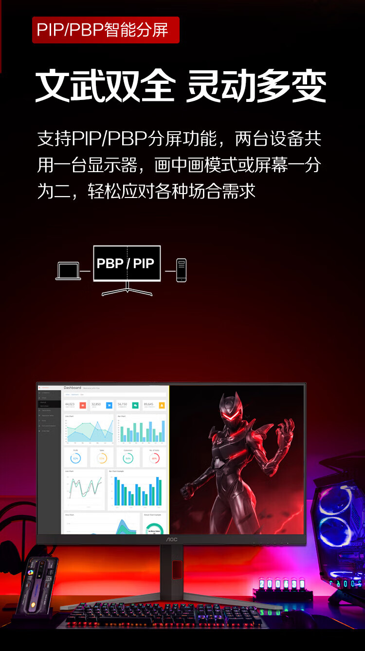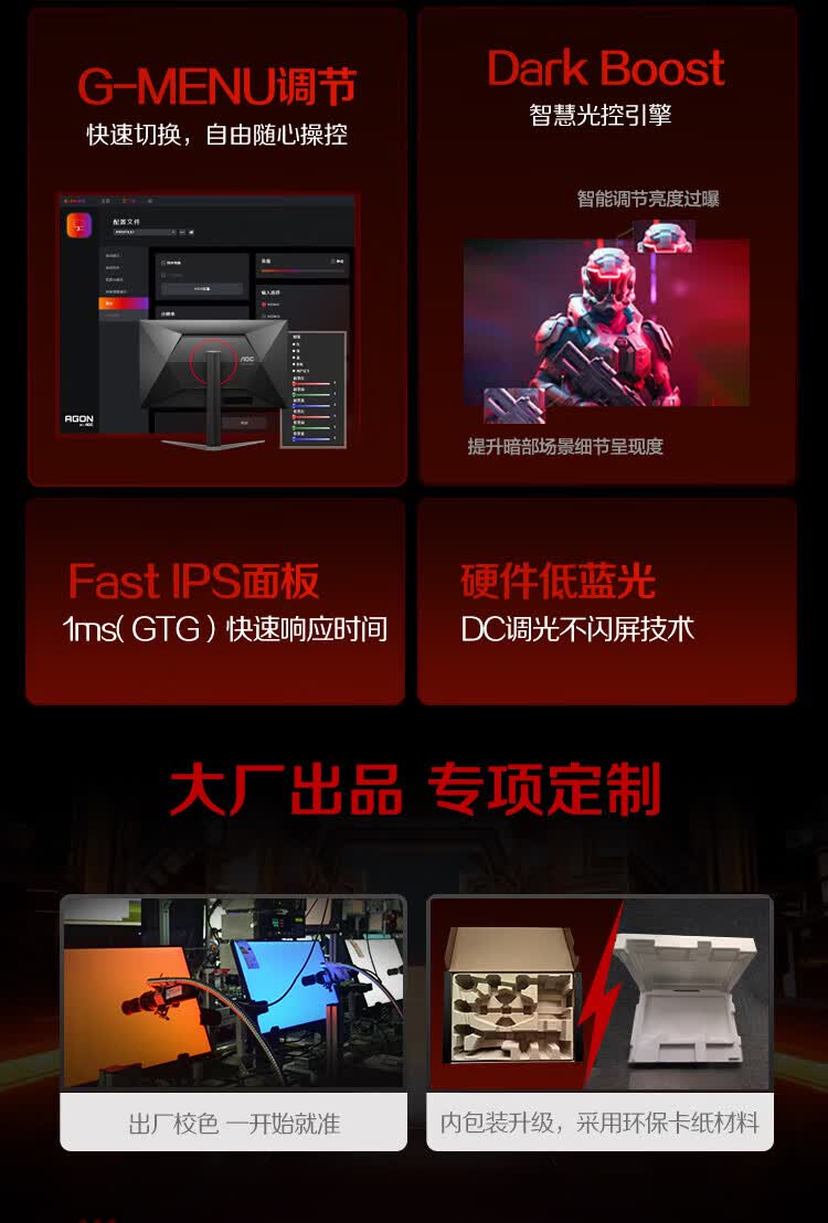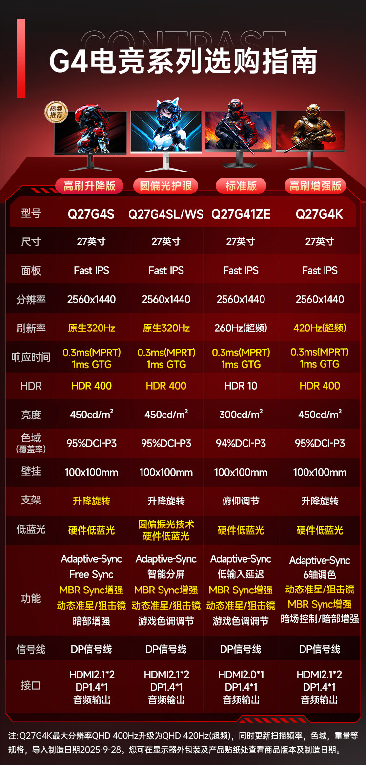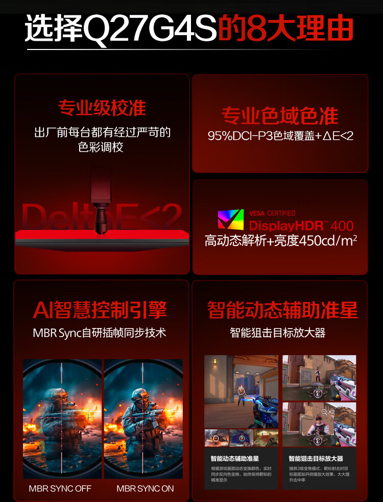 AOC 27英寸2K电竞显示器 FastIPS快速液晶 0.5ms游戏电脑显示屏幕宙斯盾HDR10 【升级版】2K原生320Hz Q27G4S