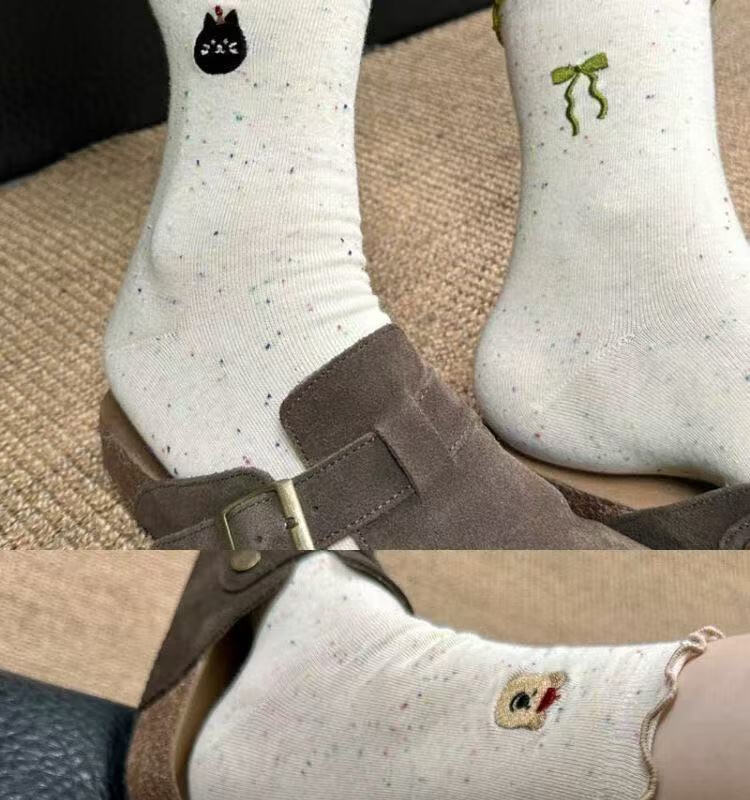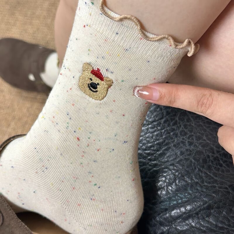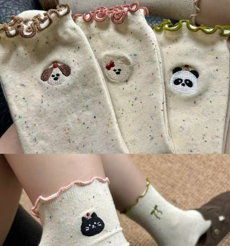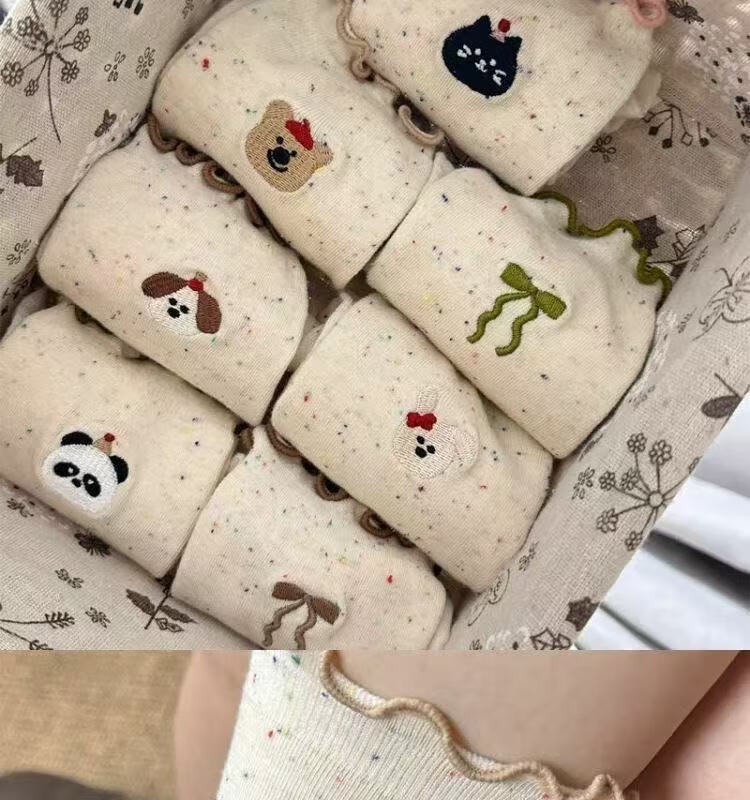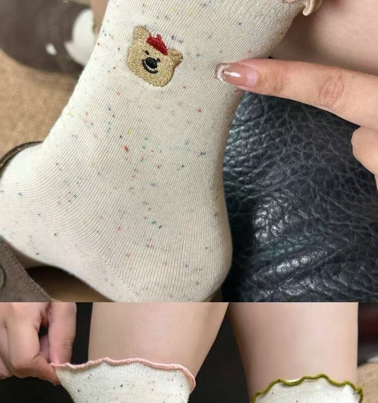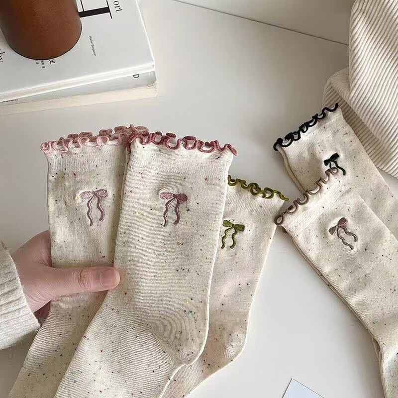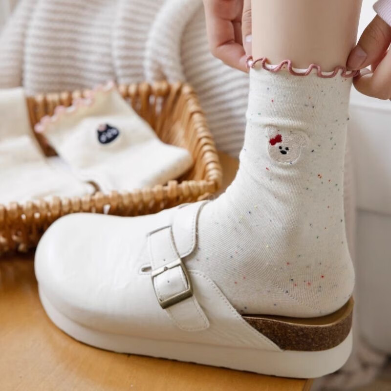 烟花秘语5双袜子女中筒秋冬款日系可爱卡通提花蝴蝶边木耳边高筒堆堆袜潮 卷边女袜5双混色 均码