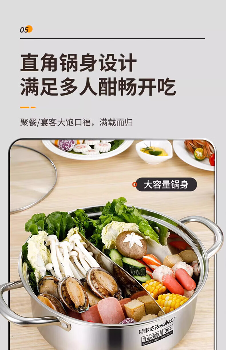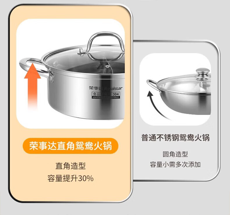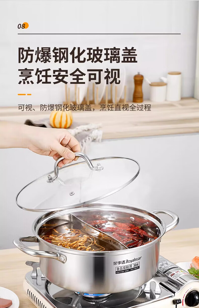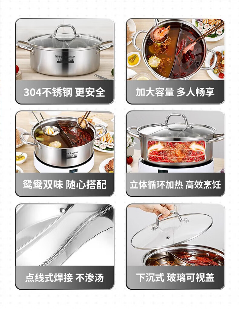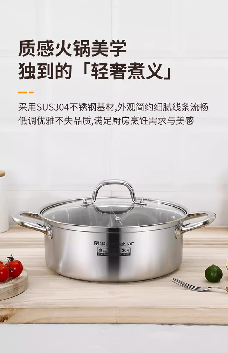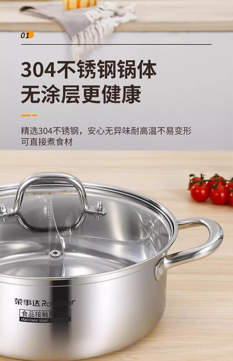 荣事达鸳鸯锅火锅锅家用电磁炉专用锅加厚304不锈钢火锅盆大容量 5-8人适用 加大加厚清汤锅 32cm