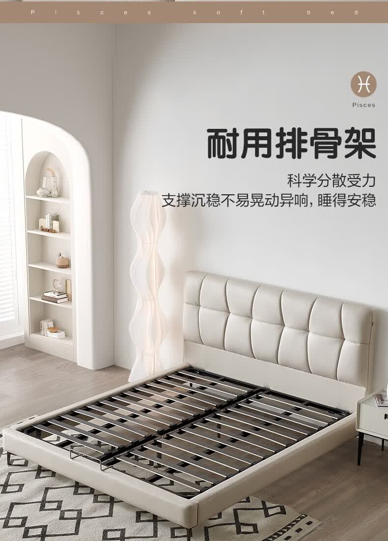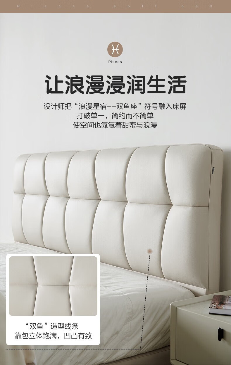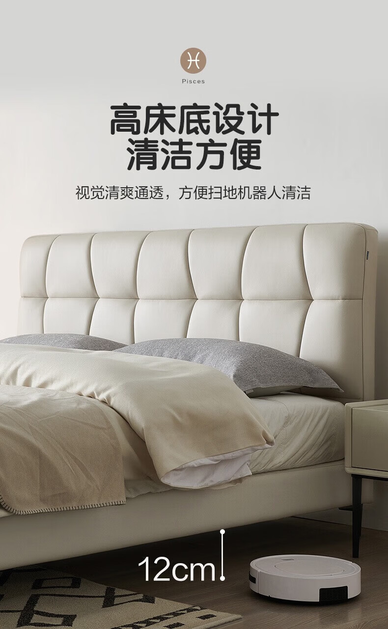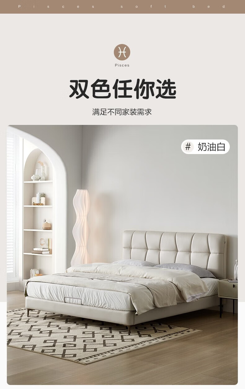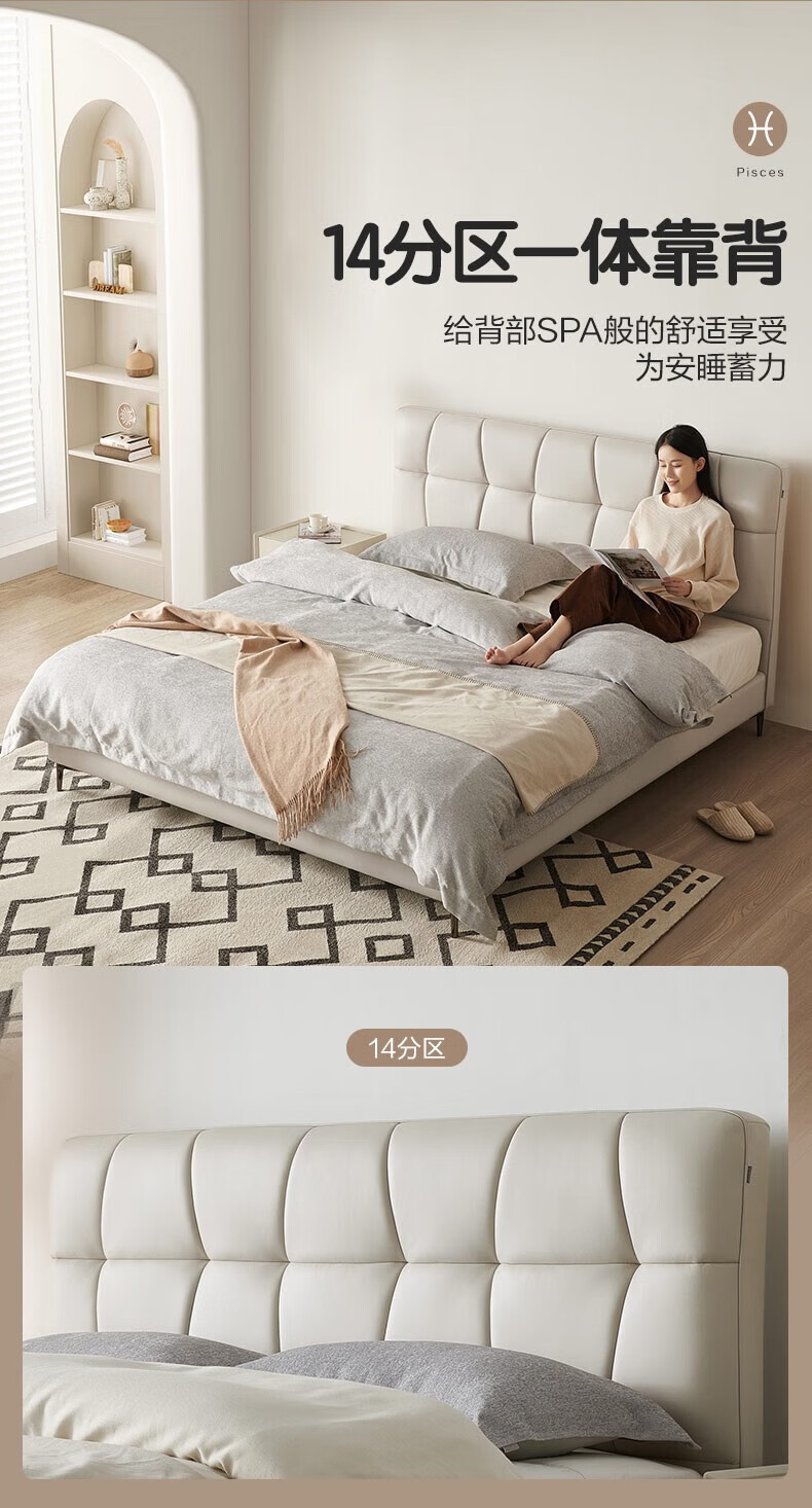 全友家居现代简约茉伊真皮床轻奢高级感2026年新款头层牛皮软包靠背床 【牛皮 | 米白 | 平移+上翻开合电动储物款】 1.8米x2米 床+床头柜*1