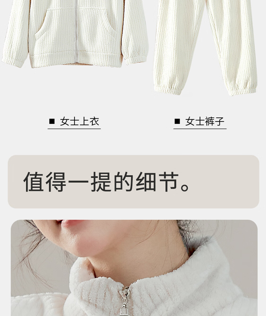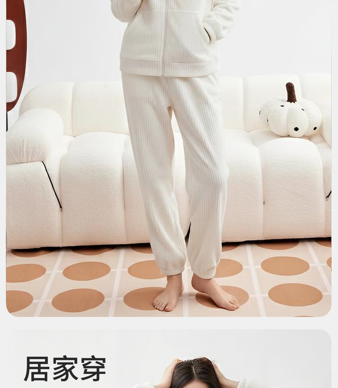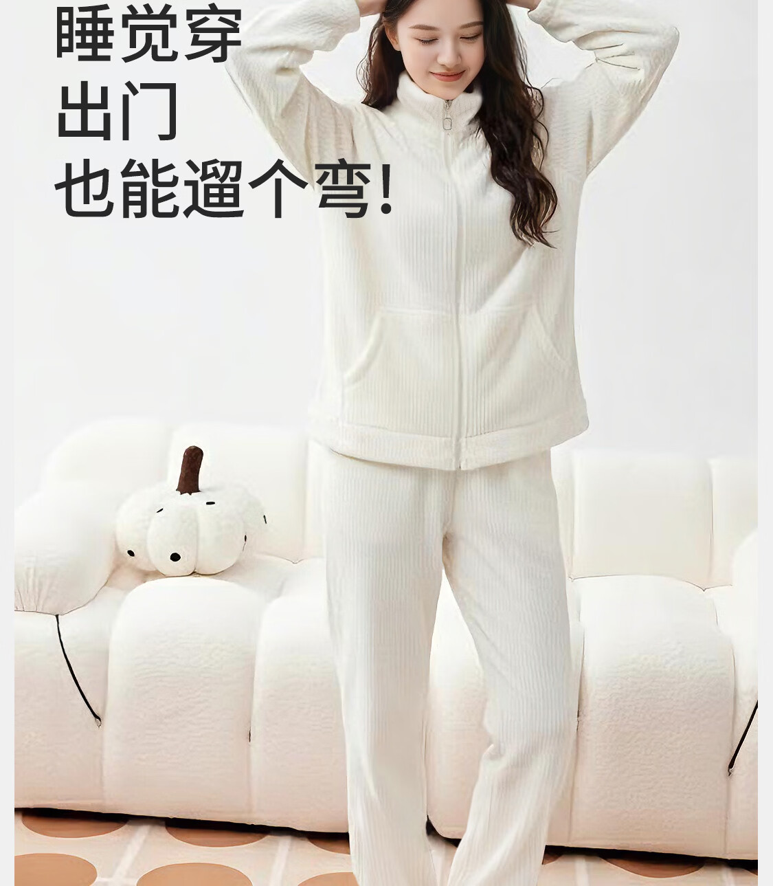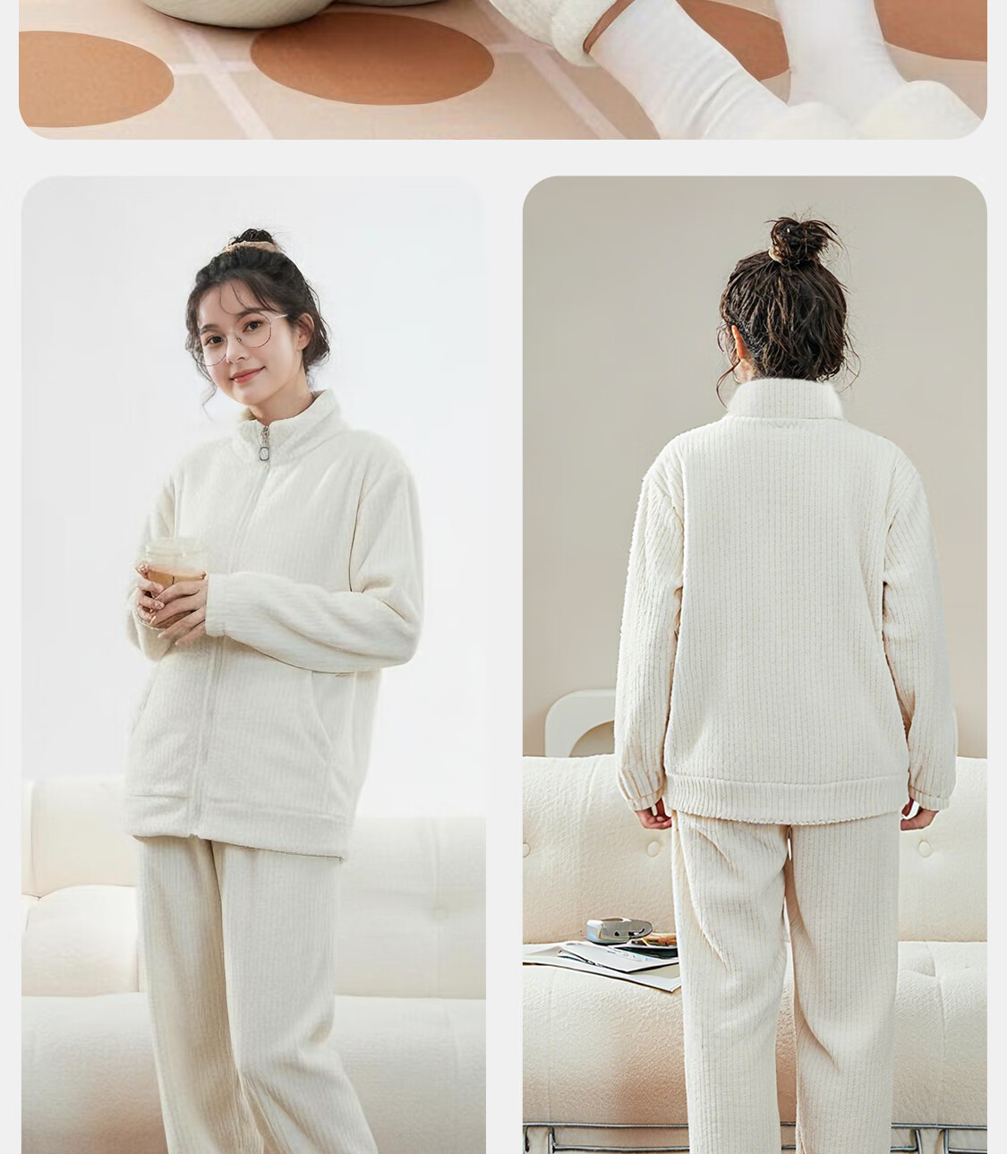 迷黎珊瑚绒睡衣女加绒保暖拉链款休闲运动风少女家居服套装可外穿 米白色 运动型居家服 XL 推荐体重120-140斤