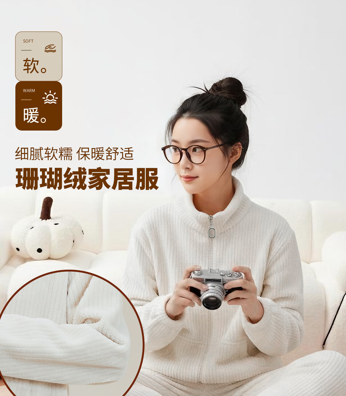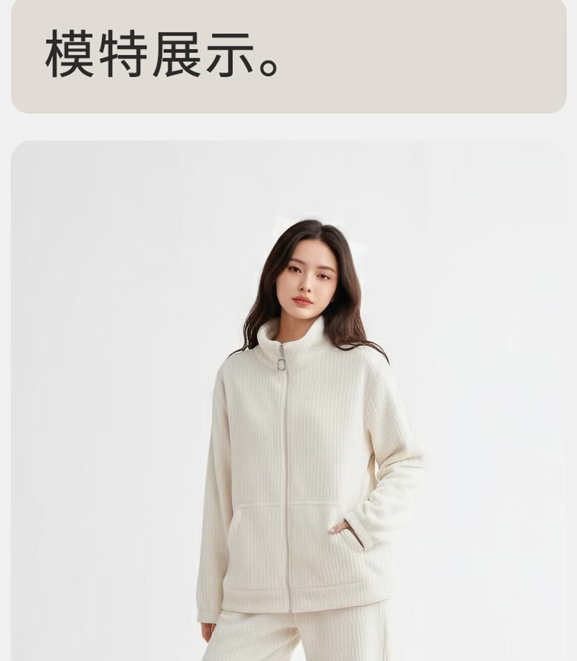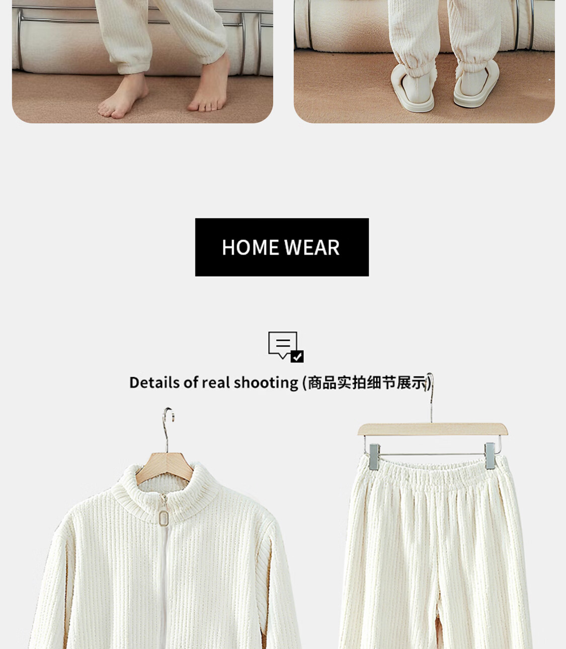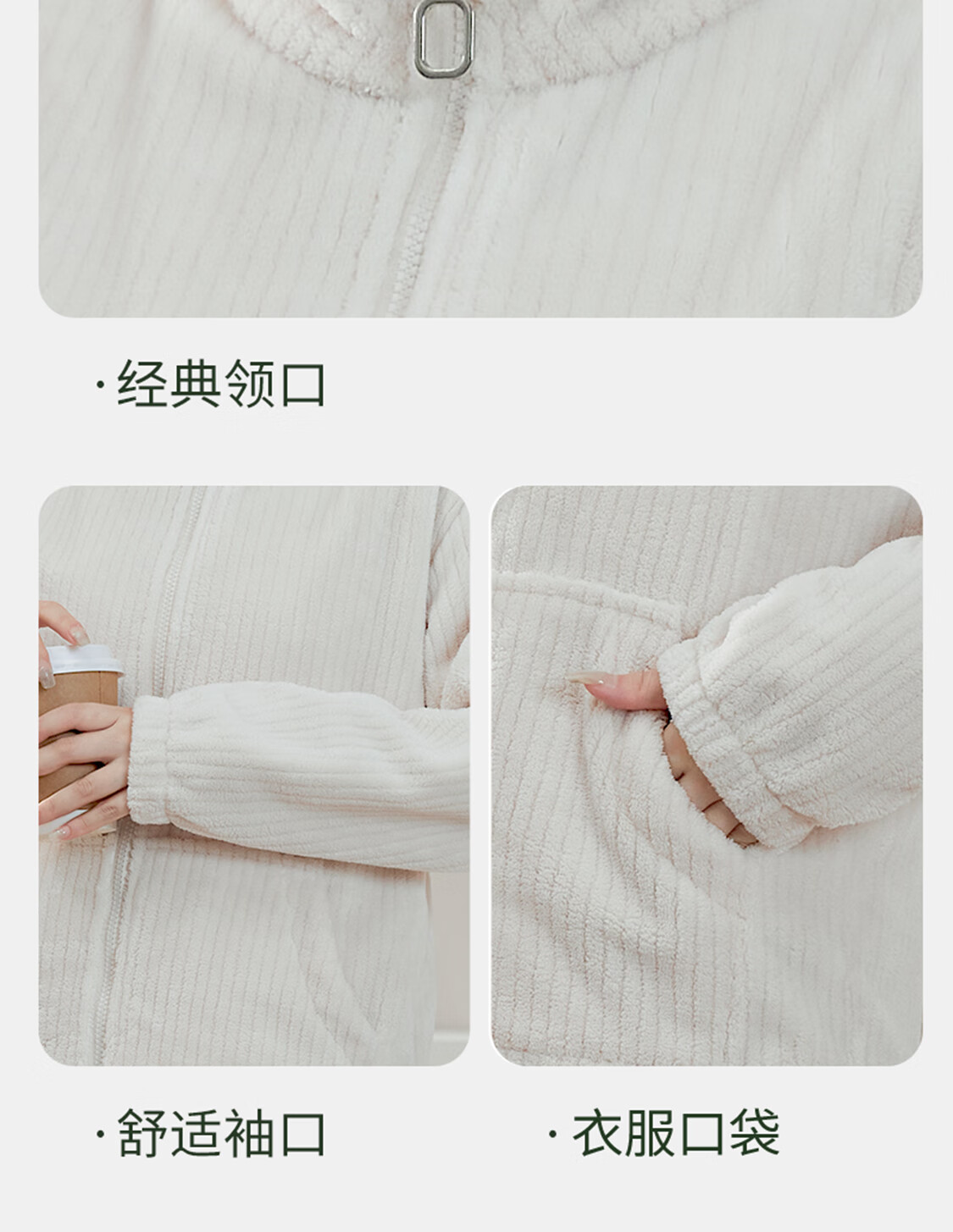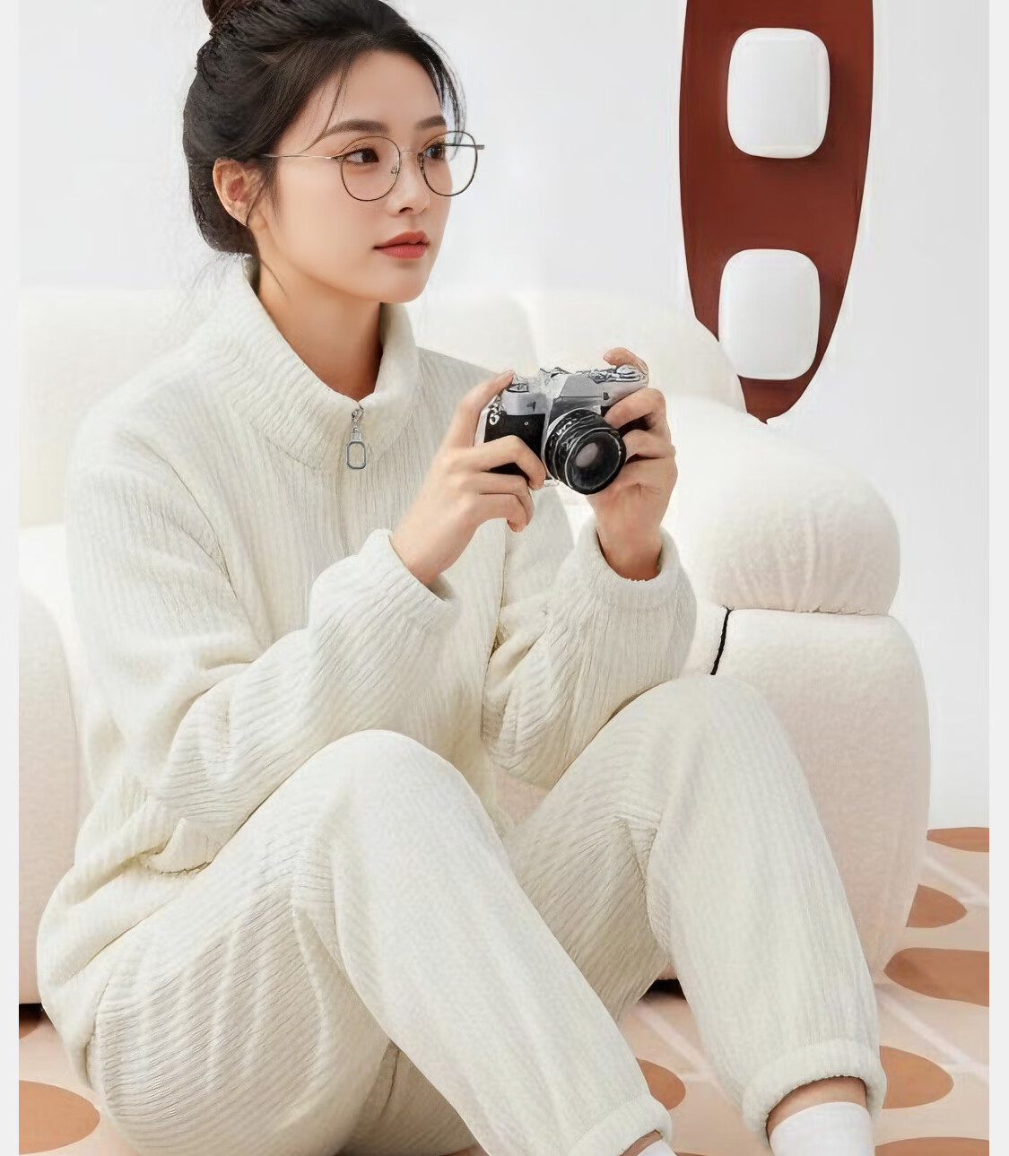 迷黎珊瑚绒睡衣女加绒保暖拉链款休闲运动风少女家居服套装可外穿 米白色 运动型居家服 XL 推荐体重120-140斤