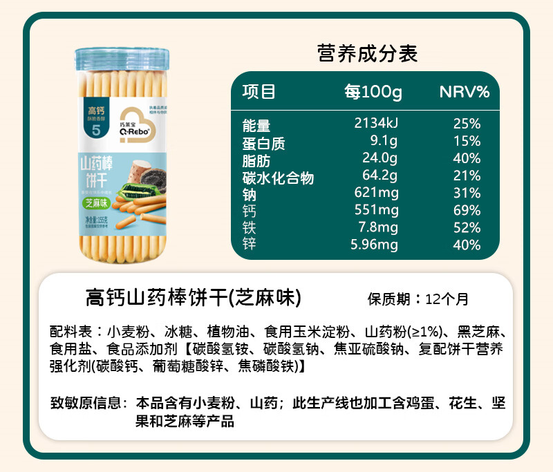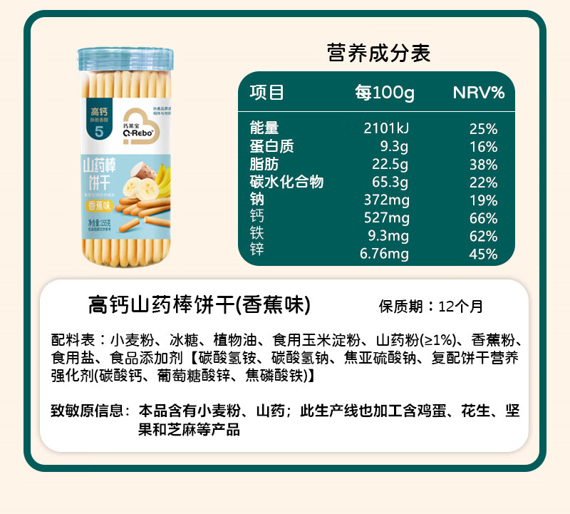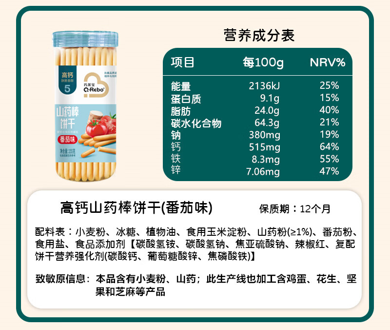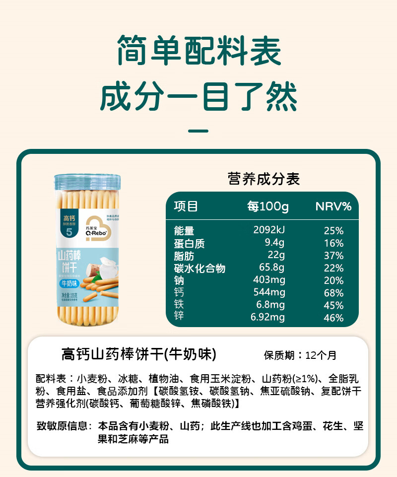 巧莱宝山药棒饼干155克罐装多口味芝麻牛奶番茄香蕉味磨牙小零食 牛奶味