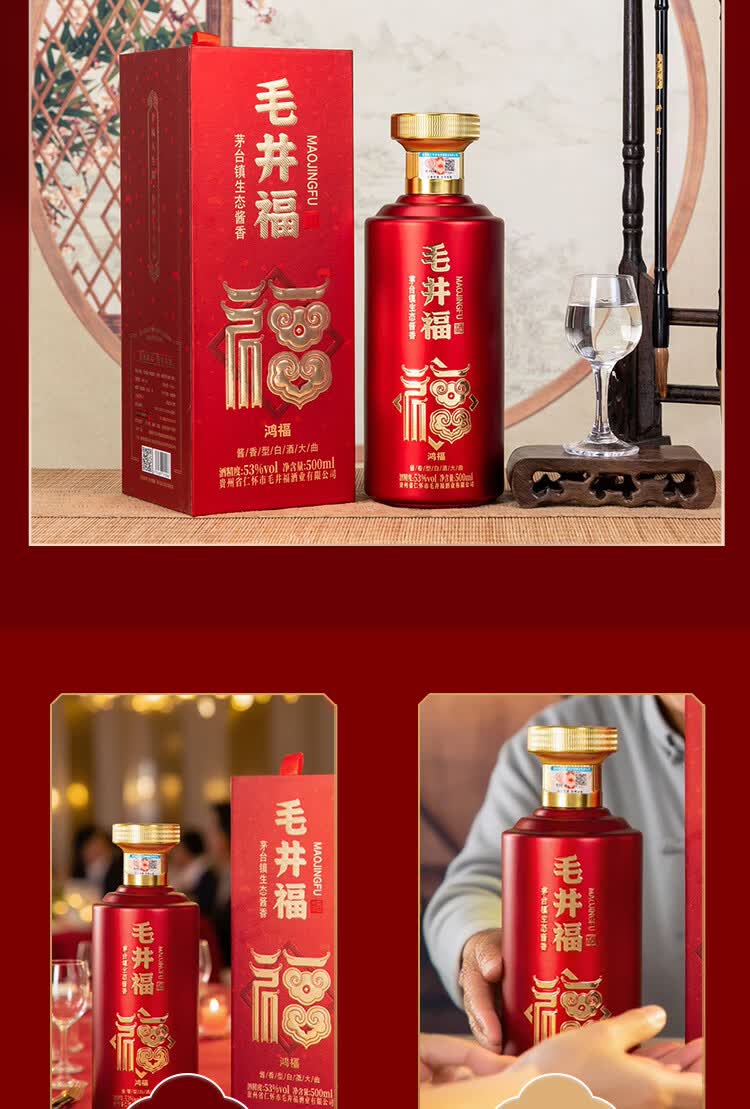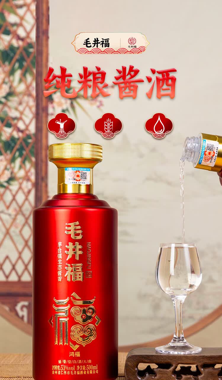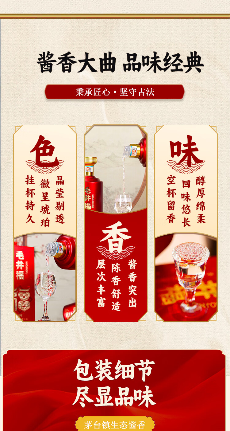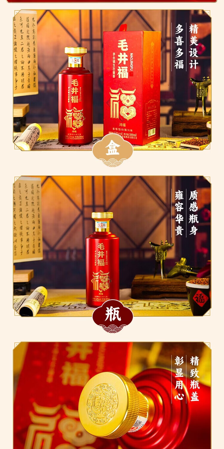 毛井福 贵州大曲坤沙纯粮食白酒 茅台镇酱香型53度高粱酒 婚宴酒席礼品 53%vol 500mL 6瓶 【整箱,送礼品袋三个】