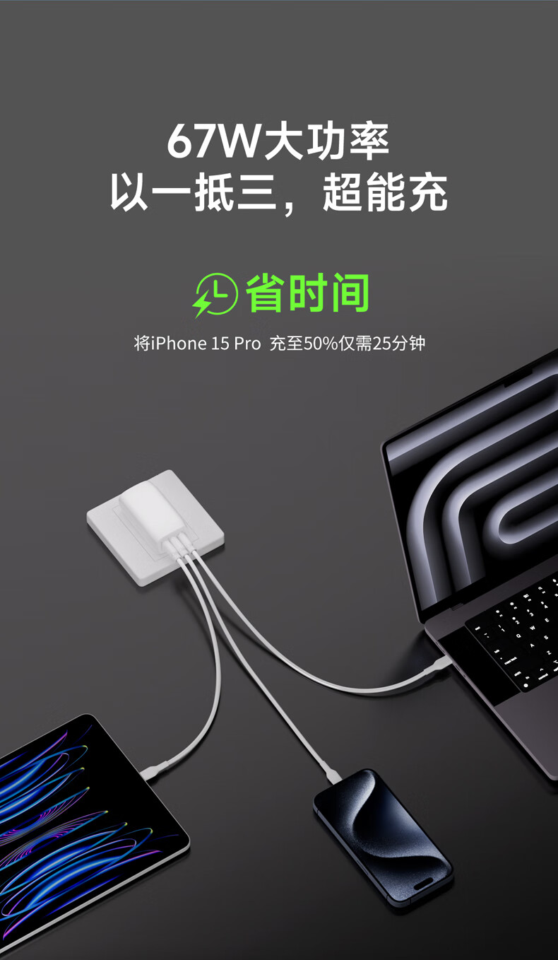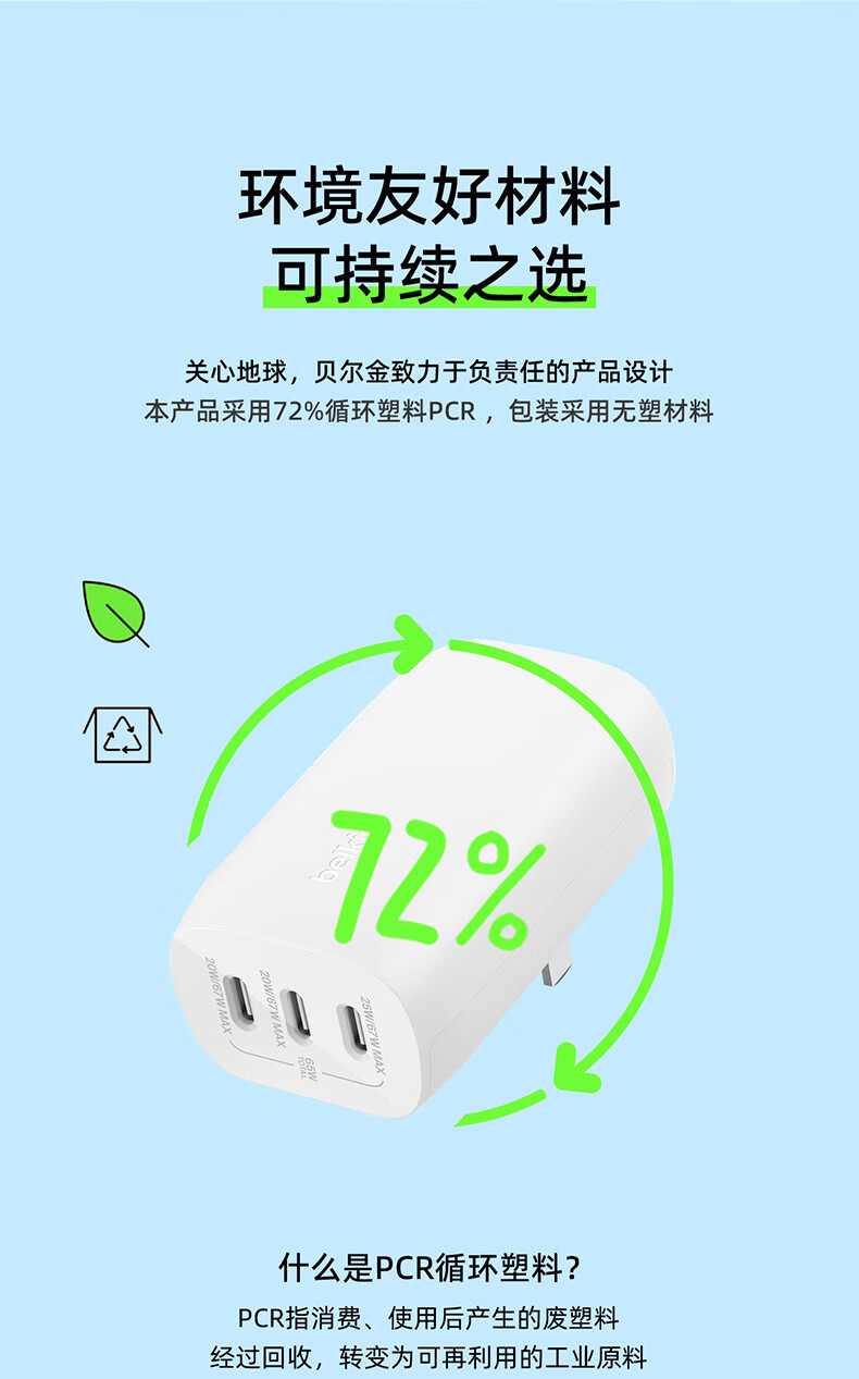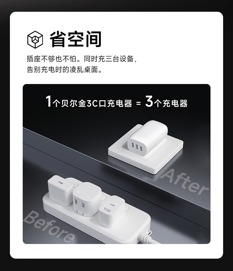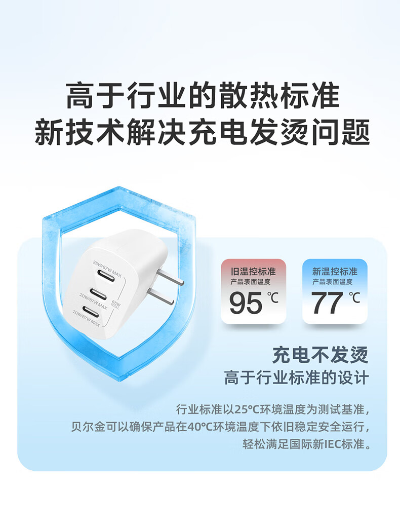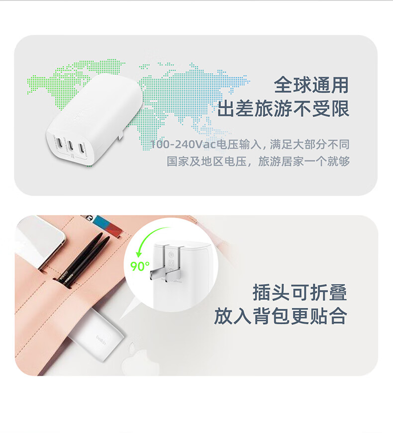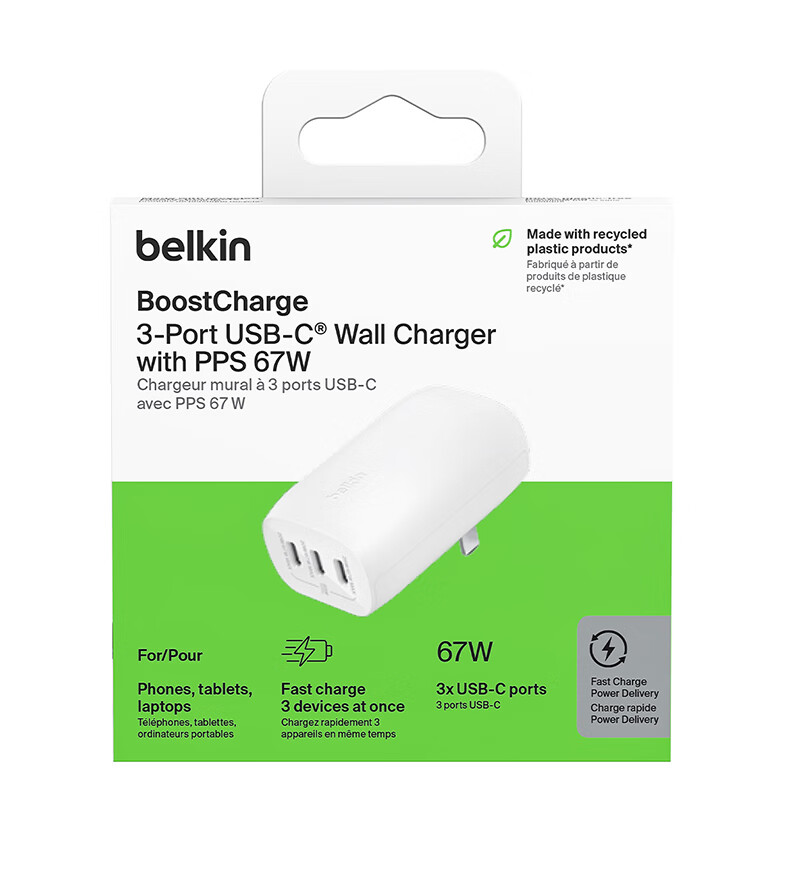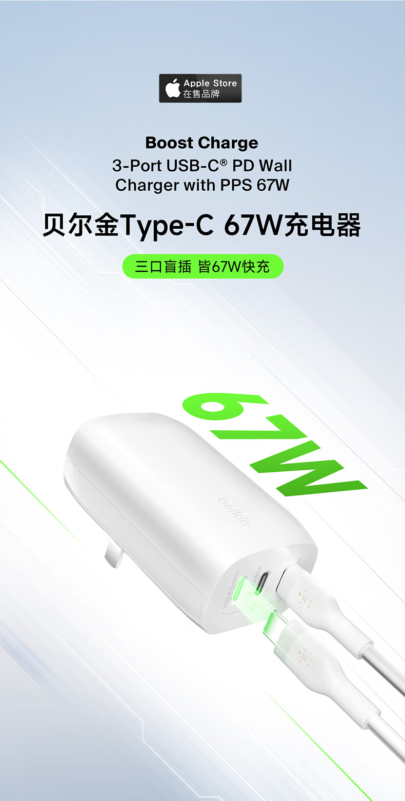 贝尔金(BELKIN)苹果充电器 67W快充头盲插三口全快充Type-C充电头 PD协议苹果iPhone17三星充电 折叠超小 WCC002